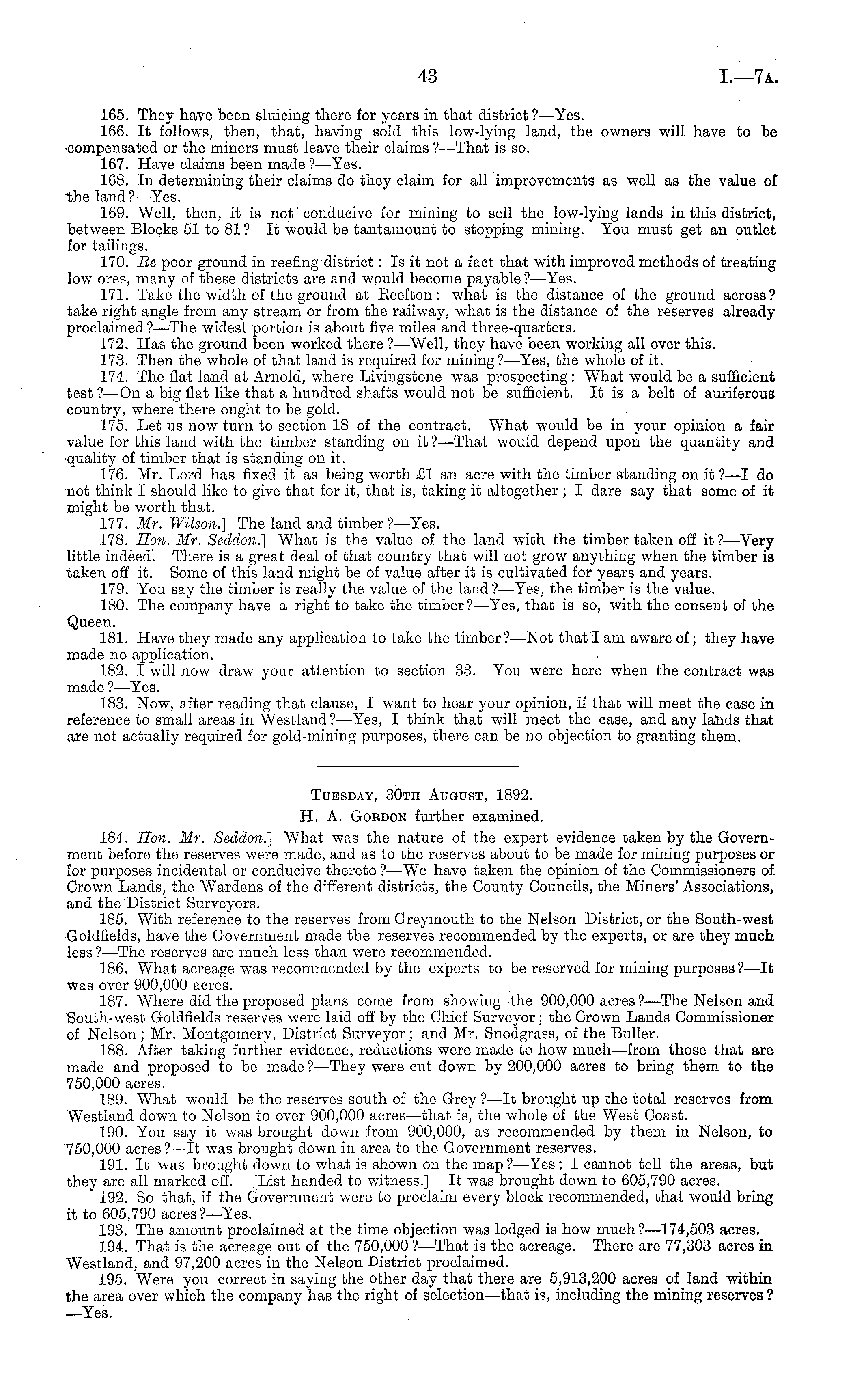 Tuesday, 30th August, 1892. H. A. Gordon further examined. 184. Hon. Mr. Seddon.] What was the nature of the expert evidence taken by the Government before the reserves were made, and as to the reserves about to be made for mining purposes or for purposes incidental or conducive thereto ? —We have taken the opinion of the Commissioners of Crown Lands, the Wardens of the different districts, the County Councils, the Miners' Associations, and the District Surveyors. 185. With reference to the reserves from Greymouth to the Nelson District, or the South-west Goldfields, have the Government made the reserves recommended by the experts, or are they much less? —The reserves are much less than were recommended. 186. What acreage was recommended by the experts to be reserved for mining purposes?—lt was over 900,000 acres. 187. Where did the proposed plans come from showing the 900,000 acres ?—The Nelson and South-west Goldfields reserves were laid off by the Chief Surveyor; the Crown Lands Commissioner of Nelson; Mr. Montgomery, District Surveyor; and Mr. Snodgrass, of the Buller. 188. After taking further evidence, reductions were made to how much—from those that are made and proposed to be made ? —They were cut down by 200,000 acres to bring them to the 750,000 acres. 189. What would be the reserves south of the Grey ?—lt brought up the total reserves from Westland down to Nelson to over 900,000 acres—that is, the whole of the West Coast. 190. You say it was brought down from 900,000, as recommended by them in Nelson, to 750,000 acres? —It was brought down in area to the Government reserves. 191. It was brought down to what is shown on the map?— Yes; I cannot tell the areas, but .they are all marked off. [List handed to witness.] It was brought down to 605,790 acres. 192. So that, if the Government were to proclaim every block recommended, that would bring it to 605,790 acres?— Yes. 193. The amount proclaimed at the time objection was lodged is how much?— 174,503 acres. 194. That is the acreage out of the 750,000 ? —That is the acreage. There are 77,303 acres in Westland, and 97,200 acres in the Nelson District proclaimed. 195. Were you correct in saying the other day that there are 5,913,200 acres of land within the area over which the company has the right of selection—that is, including the mining reserves ? —Yes.