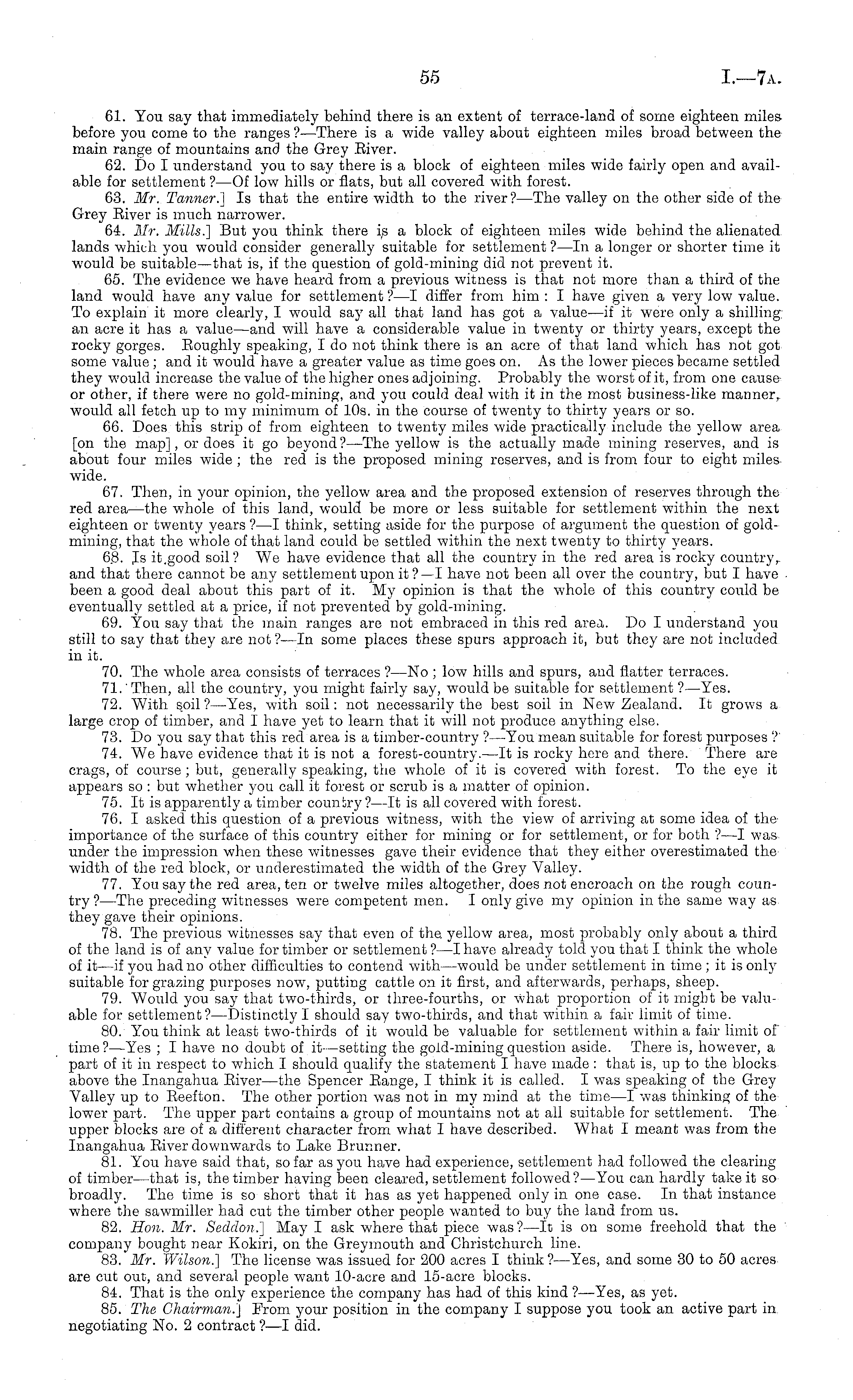 61. You say that immediately behind there is an extent of terrace-land of some eighteen miles before you come to the ranges ?—There is a wide valley about eighteen miles broad between the main range of mountains and the Grey Eiver. 62. Do I understand you to say there is a block of eighteen miles wide fairly open and available for settlement ?—Of low hills or flats, but all covered with forest. 63. Mr. Tanner.] Is that the entire width to the river?— The valley on the other side of the Grey Eiver is much narrower. 64. Mr. Mills.] But you think there is a block of eighteen miles wide behind the alienated lands which you would consider generally suitable for settlement ? —ln a longer or shorter time it would be suitable—that is, if the question of gold-mining did not prevent it. 65. The evidence we have heard from a previous witness is that not more than a third of the land would have any value for settlement ?—I differ from him : I have given a very low value. To explain it more clearly, I would say all that land has got a value—if it were only a shilling an acre it has a value—and will have a considerable value in twenty or thirty years, except the rocky gorges. Eoughly speaking, Ido not think there is an acre of that land which has not got some value ; and it would have a greater value as time goes on. As the lower pieces became settled they would increase the value of the higher ones adjoining. Probably the worst of it, from one cause or other, if there were no gold-mining, and you could deal with it in the most business-likemmannerr r would all fetch up to my minimum of 10s. in the course of twenty to thirty years or so. 66. Does this strip of from eighteen to twenty miles wide practically include the yellow area [on the map], or does it go beyond?— The yellow is the actually made mining reserves, and is about four miles wide ; the red is the proposed mining reserves, and is from four to eight miles wide. 67. Then, in your opinion, the yellow area and the proposed extension of reserves through the red area —the whole of this land, would be more or less suitable for settlement within the next eighteen or twenty years ?—I think, setting aside for the purpose of argument the question of goldmining, that the whole of that land could be settled within the next twenty to thirty years. 6.8. Is it.good soil? We have evidence that all the country in the red area is rocky country,, and that there cannot be any settlement upon it ?—I have not been all over the country, but I have been a good deal about this part of it. My opinion is that the whole of this country could be eventually settled at a price, if not prevented by gold-mining. 69. You say that the main ranges are not embraced in this red area,. Do I understand you still to say that they are not ?—ln some places these spurs approach it, but they are not included in it. 70. The whole area consists of terraces ?—No ; low hills and spurs, and flatter terraces. 71.'Then, all the country, you might fairly say, would be suitable for settlement?— Yes. 72. With soil? —Yes, with soil: not necessarily the best soil in New Zealand. It grows a large crop of timber, and I have yet to learn that it will not produce anything else. 73. Do you say that this red area is a timber-country ?—You mean suitable for forest purposes ? 74. We have evidence that it is not a forest-country.—lt is rocky here and there. There are crags, of course ; but, generally speaking, the whole of it is covered with forest. To the eye it appears so : but whether you call it forest or scrub is a matter of opinion. 75. It is apparently a timber country ?—lt is all covered with forest. 76. I asked this question of a previous witness, with the view of arriving at some idea of the importance of the surface of this country either for mining or for settlement, or for both ? —I was under the impression when these witnesses gave their evidence that they either overestimated the width of the red block, or underestimated the width of the Grey Valley. 77. You say the red area, ten or twelve miles altogether, does not encroach on the rough country ? —The preceding witnesses were competent men. I only give my opinion in the same way as they gave their opinions. 78. The previous witnesses say that even of the yellow area, most probably only about a third of the land is of any value for timber or settlement ?—I have already told you that I think the whole of it —if you had no other difficulties to contend with —would be under settlement in time ;it is only suitable for grazing purposes now, putting cattle on it first, and afterwards, perhaps, sheep. 79. Would you say that two-thirds, or three-fourths, or what proportion of it might be valuable for settlement?— Distinctly I should say two-thirds, and that within a fair limit of time. 80. You think at least two-thirds of it would be valuable for settlement within a fair limit of time ?—Yes ; I have no doubt of it—setting the gold-mining question aside. There is, however, a part of it in respect to which I should qualify the statement I have made : that is, up to the blocks above the Inangahua Eiver—the Spencer Eange, I think it is called. I was speaking of the Grey Valley up to Eeefton. The other portion was not in my mind at the time —I was thinking of the lower part. The upper part contains a group of mountains not at all suitable for settlement. The upper blocks are of a different character from what I have described. What I meant was from the Inangahua Eiver downwards to Lake Brunner. 81. You have said that, so far as you have had experience, settlement had followed the clearing of timber —that is, the timber having been cleared, settlement followed? —You can hardly take it so broadly. The time is so short that it has as yet happened only in one case. In that instance where the sawmiller had cut the timber other people wanted to buy the land from us. 82. Hon. Mr. Seddon.] May I ask 