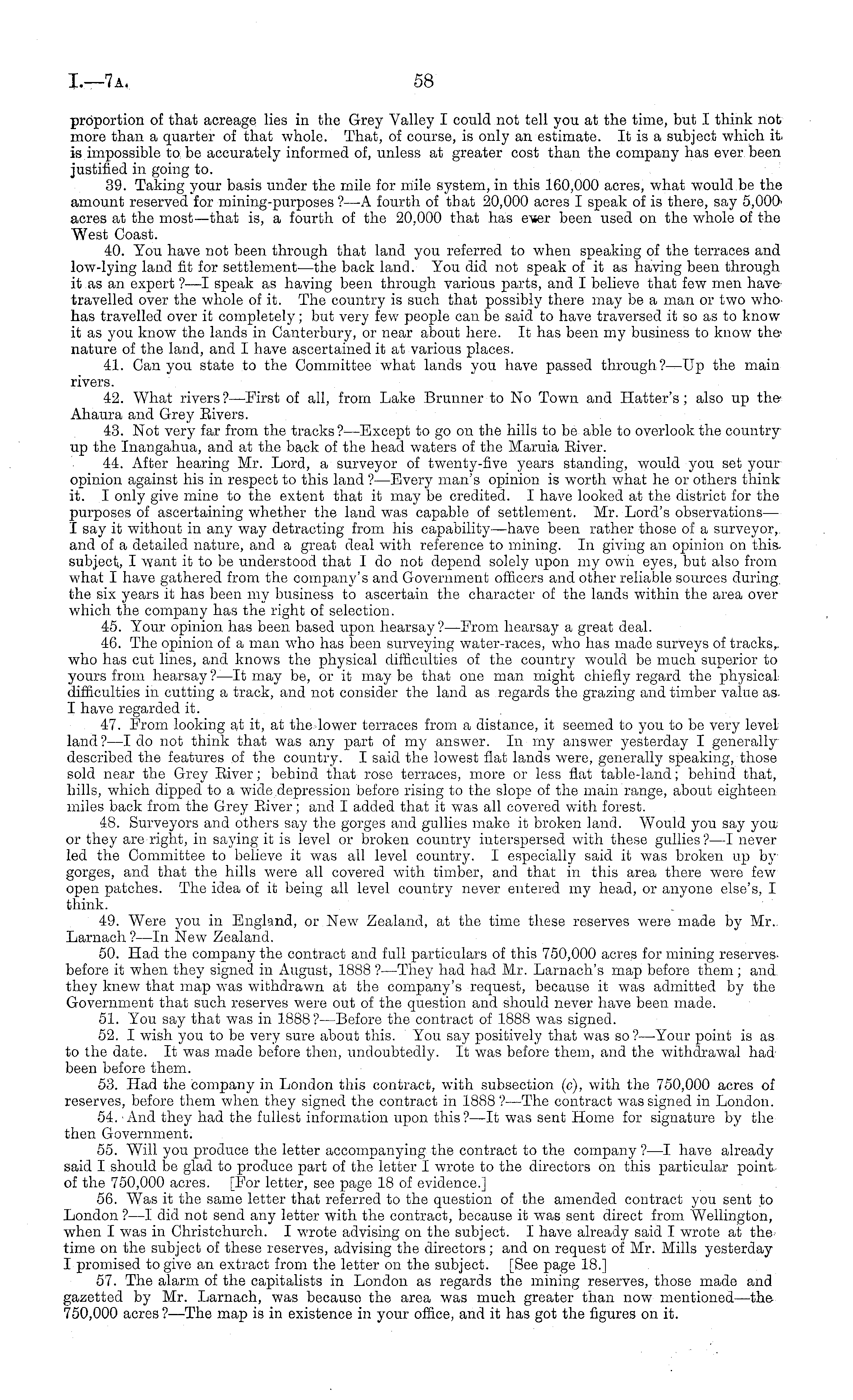 proportion of that acreage lies in the Grey Valley I could not tell you at the time, but I think not more than a quarter of that whole. That, of course, is only an estimate. It is a subject which itis impossible to be accurately informed of, unless at greater cost than the company has ever been justified in going to. 39. Taking your basis under the mile for mile system, in this 160,000 acres, what would be the amount reserved for mining-purposes? —A fourth of that 20,000 acres I speak of is there, say 5,000' acres at the most —that is, a fourth of the 20,000 that has been used on the whole of the West Coast. 40. You have not been through that land you referred to when speaking of the terraces and low-lying land fit for settlement—the back land. You did not speak of it as having been through it as an expert ?—I speak as having been through various parts, and I believe that few men have travelled over the whole of it. The country is such that possibly there may be a man or two whohas travelled over it completely ; but very few people can be said to have traversed it so as to know it as you know the lands in Canterbury, or near about here. It has been my business to know the* nature of the land, and I have ascertained it at various places. 41. Can you state to the Committee what lands you have passed through?—Up the main rivers. 42. What rivers? —First of all, from Lake Brunner to No Town and Hatter's; also up theAhaura and Grey Bivers. 43. Not very far from the tracks?— Except to go on the hills to be able to overlook the country up the Inangahua, and at the back of the head waters of the Maruia Eiver. 44. After hearing Mr. Lord, a surveyor of twenty-five years standing, would you set your opinion against his in respect to this land ?—Every man's opinion is worth what he or others think it. I only give mine to the extent that it may be credited. I have looked at the district for the purposes of ascertaining whether the laud was capable of settlement. Mr. Lord's observations — I say it without in any way detracting from his capability—have been rather those of a surveyor,, and of a detailed nature, and a great deal with reference to mining. In giving an opinion on thissubject, I want it to be understood that I do not depend solely upon my own eyes, but also from what I have gathered from the company's and Government officers and other reliable sources during the six years it has been my business to ascertain the character of the lands within the area over which the company has the right of selection. 45. Your opinion has been based upon hearsay?—Erom hearsay a great deal. 46. The opinion of a man who has been surveying water-races, who has made surveys of tracks,. who has cut lines, and knows the physical difficulties of the country would be much superior to yours from hearsay? —It may be, or it may be that one man might chiefly regard the physical difficulties in cutting a track, and not consider the land as regards the grazing and timber value as. I have regarded it. 47. From looking at it, at the lower terraces from a distance, it seemed to you to be very level land ?—I do not think that was any part of my answer. In my answer yesterday I generally described the features of the country. I said the lowest flat lands were, generally speaking, those sold near the Grey Eiver; behind that rose terraces, more or less flat table-land; behind that, hills, which dipped to a wide depression before rising to the slope of the main range, about eighteen miles back from the Grey Eiver; and I added that it was all covered with forest. 48. Surveyors and others say the gorges and gullies make it broken land. Would you say you; or they are right, in saying it is level or broken country interspersed with these gullies ?—I never led the Committee to believe it was all level country. I especially said it was broken up by gorges, and that the hills were all covered with timber, and that in this area there were few open patches. The idea of it being all level country never entered my head, or anyone else's, I think. 49. Were you in England, or New Zealand, at the time these reserves were made by Mr.. Larnach ?—ln New Zealand. 50. Had the company the contract and full particulars of this 750,000 acres for mining reservesbefore it when they signed in August, 1888 ?—They had had Mr. Larnach's map before them ; and. they knew that map was withdrawn at the company's request, because it was admitted by the Government that such reserves were out of the question and should never have been made. 51. You say that was in 1888?— Before the contract of 1888 was signed. 52. I wish you to be very sure about this. You say positively that was so? —Your point is as to the date. It was made before then, undoubtedly. It was before them, and the withdrawal had been before them. 53. Had the company in London this contract, with subsection (c), with the 750,000 acres of reserves, before them when they signed the contract in 1888 ?—The contract was signed in London. 54. And they had the fullest information upon this? —It was sent Home for signature by the then Government. 55. Will you produce the letter accompanying the contract to the company ?—I have already said I should be glad to produce part of the letter I wrote to the directors on this particular point of the 750,000 acres. [Eor letter, see page 18 of evidence.] 56. Was it the same letter that referred to the question of the amended contract you sent to London ?—I did not send any letter with the contract, because it was sent direct from Wellington, when I was in Christchurch. I wrote advising on the subject. I have already said I wrote at the time on the subject of these reserves, advising the directors; and on request of Mr. Mills yesterday I promised to give an extract from the letter on the subject. [See page 18.] 57. The alarm of the capitalists in London as regards the mining reserves, those made and gazetted by Mr. Larnach, w