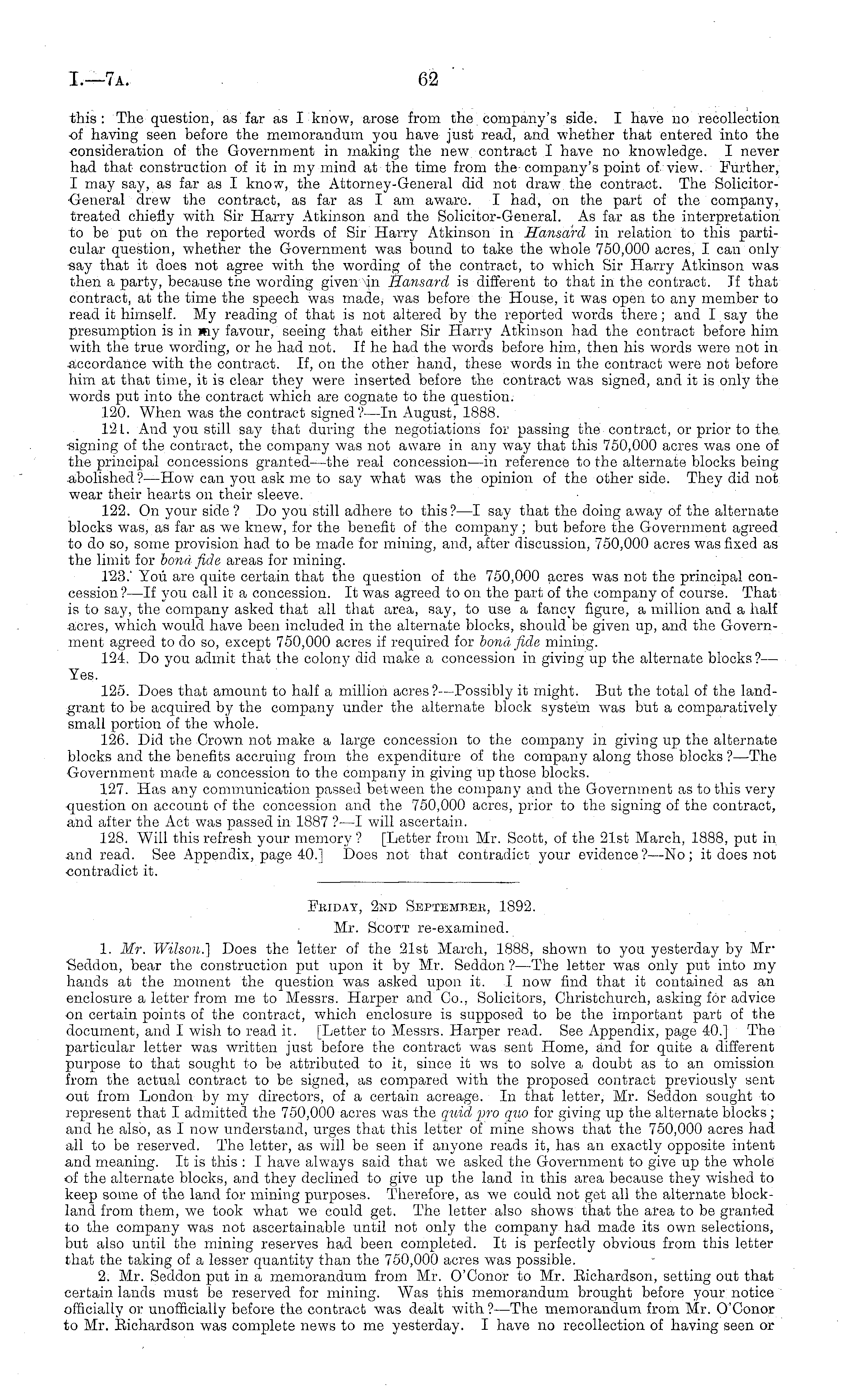 Pbiday, 2nd September, 1892. Mr. Scott re-examined. 1. Mr. Wilson.] Does the letter of the 21st March, 1888, shown to you yesterday by MrSeddon, bear the construction put upon it by Mr. Seddon ?—The letter was only put into my hands at the moment the question was asked upon it. I now find that it contained as an enclosure a letter from me to Messrs. Harper and Co., Solicitors, Christchurch, asking for advice -on certain points of the contract, which enclosure is supposed to be the important part of the document, and I wish to read it. [Letter to Messrs. Harper read. See Appendix, page 40.] The particular letter was written just before the contract was sent Home, and for quite a different purpose to that sought to be attributed to it, since it ws to solve a doubt as to an omission from the actual contract to be signed, as compared with the proposed contract previously sent out from London by my directors, of a certain acreage. In that letter, Mr. Seddon sought to represent that I admitted the 750,000 acres was the quid fro quo for giving up the alternate blocks; and he also, as I now understand, urges that this letter of mine shows that the 750,000 acres had all to be reserved. The letter, as will be seen if anyone reads it, has an exactly opposite intent and meaning. It is this : I have always said that we asked the Government to give up the whole of the alternate blocks, and they declined to give up the land in this area because they wished to keep some of the land for mining purposes. Therefore, as we could not get all the alternate blockland from them, we took what we could get. The letter also shows that the area to be granted to the company was not ascertainable until not only the company had made its own selections, but also until the mining reserves had been completed. It is perfectly obvious from this letter that the taking of a lesser quantity than the 750,000 acres was possible. 2. Mr. Seddon put in a memorandum from Mr. O'Conor to Mr. Bichardson, setting out that certain lands must be reserved for mining. Was this memorandum brought before your notice officially or unofficially before the contract was dealt with ?—The memorandum from Mr. O'Conor to Mr. Eichardson was complete news to me yesterday. I have no recollection of having seen or
