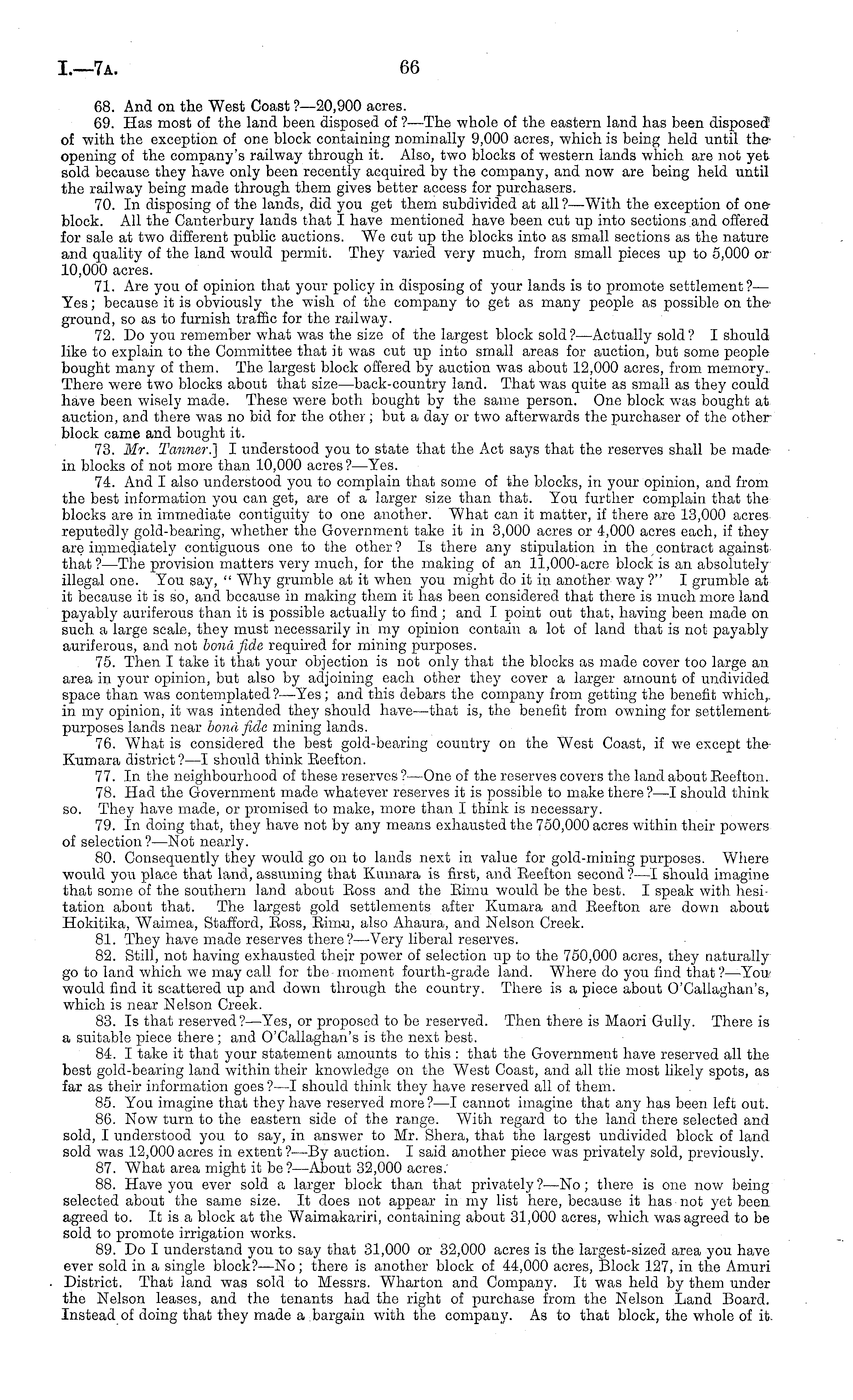 68. And on the West Coast ?—20,900 acres. 69. Has most of the land been disposed of ?—The whole of the eastern land has been disposed" of with the exception of one block containing nominally 9,000 acres, which is being held until theopening of the company's railway through it. Also, two blocks of western lands which are not yet sold because they have only been recently acquired by the company, and now are being held until the railway being made through them gives better access for purchasers. 70. In disposing of the lands, did you get them subdivided at all ?—With the exception of one block. All the Canterbury lands that I have mentioned have been cut up into sections and offered for sale at two different public auctions. We cut up the blocks into as small sections as the nature and quality of the land would permit. They varied very much, from small pieces up to 5,000 or 10,000 acres. 71. Are you of opinion that your policy in disposing of your lands is to promote settlement?— Yes; because it is obviously the wish of the company to get as many people as possible on theground, so as to furnish traffic for the railway. 72. Do you remember what was the size of the largest block sold?— Actually sold? I should like to explain to the Committee that it was cut up into small areas for auction, but some people bought many of them. The largest block offered by auction was about 12,000 acres, from memory.. There were two blocks about that size—back-country land. That was quite as small as they could have been wisely made. These were both bought by the same person. One block was bought at auction, and there was no bid for the other; but a day or two afterwards the purchaser of the otherblock came and bought it. 73. Mr. Tanner.} I understood you to state that the Act says that the reserves shall be made in blocks of not more than 10,000 acres?— Yes. 74. And I also understood you to complain that some of the blocks, in your opinion, and from the best information you can get, are of a larger size than that. You further complain that the blocks are in immediate contiguity to one another. What can it matter, if there are 13,000 acres reputedly gold-bearing, whether the Government take it in 3,000 acres or 4,000 acres each, if they are immediately contiguous one to the other? Is there any stipulation in the contract against that ? —The provision matters very much, for the making of an 11,000-acre block is an absolutely illegal one. You say, " Why grumble at it when you might do it in another way ?" I grumble at it because it is so, and because in making them it has been considered that there is much more land payably auriferous than it is possible actually to find ; and I point out that, having been made on such a large scale, they must necessarily in my opinion contain a lot of land that is not payably auriferous, and not bona fide required for mining purposes. 75. Then I take it that your objection is not only that the blocks as made cover too large an area in your opinion, but also by adjoining each other they cover a larger amount of undivided space than was contemplated?— Yes; and this debars the company from getting the benefit which,, in my opinion, it was intended they should have—that is, the benefit from owning for settlement purposes lands near bond fide mining lands. 76. What is considered the best gold-bearing country on the West Coast, if we except the Kumara district?—l should think Eeefton. 77. In the neighbourhood of these reserves ?—One of the reserves covers the land about Eeefton. 78. Had the Government made whatever reserves it is possible to make there ?—I should think so. They have made, or promised to make, more than I think is necessary. 79. In doing that, they have not by any means exhausted the 750,000 acres within their powers of selection ?—Not nearly. 80. Consequently they would go on to lands next in value for gold-mining purposes. Where would you place that land, assuming that Kumara is first, and Eeefton second ?—I should imagine that some of the southern land about Eoss and the Eimu would be the best. I speak with hesitation about that. The largest gold settlements after Kumara and Eeefton are down about Hokitika, Waimea, Stafford, Eoss, Eimu, also Ahaura, and Nelson Creek. 81. They have made reserves there?— Very liberal reserves. 82. Still, not having exhausted their power of selection up to the 750,000 acres, they naturally go to land which we may call for the moment fourth-grade land. Where do you find that ?-—You would find it scattered up and down through the country. There is a piece about O'Callagban's, which is near Nelson Creek. 83. Is that reserved?— Yes, or proposed to be reserved. Then there is Maori Gully. There is a suitable piece there; and O'Callaghan's is the next best. 84. I take it that your statement amounts to this : that the Government have reserved all the best gold-bearing land within their knowledge on the West Coast, and all the most likely spots, as far as their information goes?—l should think they have reserved all of them. 85. You imagine that they have reserved more? —I cannot imagine that any has been left out. 86. Now turn to the eastern side of the range. With regard to the land there selected and sold, I understood you to say, in answer to Mr. Shera, that the largest undivided block of land sold was 12,000 acres in extent? —By auction. I said another piece was privately sold, previously. 87. What area might it be ?—About 32,000 acres. 88. Have you ever sold a larger block than that privately?—No; there is one now being selected about the same size. It does not appear in my list here, because it has not yet been agreed to. It is a block at the Waimakariri, containing about 31,000 acres, which was agreed to be sold to promote irrigation works. 89. Do I understand you to say that 31,000 or 32,000 acres is the largest-sized area you have ever sold in a single block? —No; there is another block