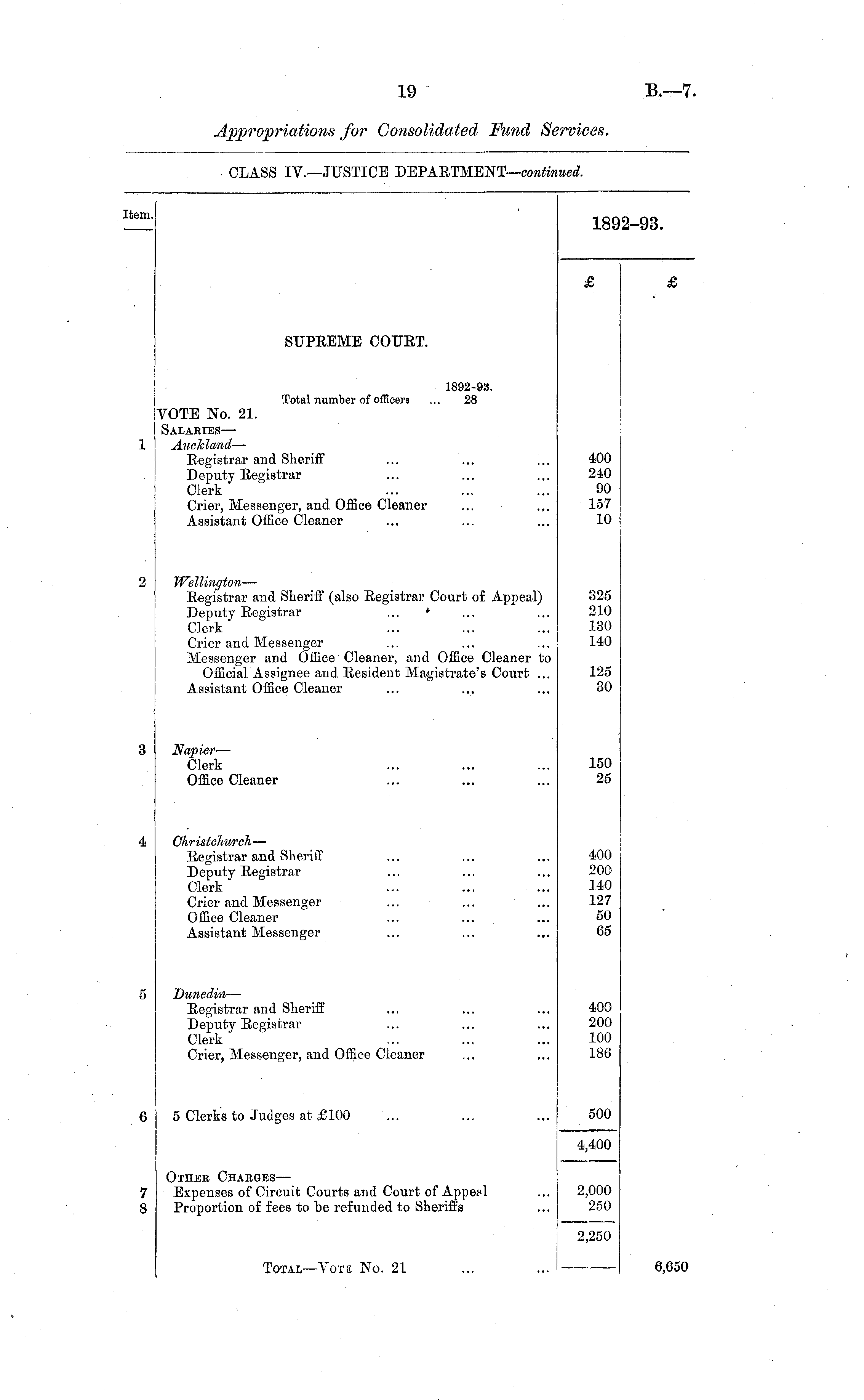 item. 1892-93. £ SUPKEME COTJET. 1892-93. Total number of officers ... 28 VOTE No. 21. Salaeies— Auckland — Eegistrar and Sheriff Deputy Registrar Clerk Crier, Messenger, and Office Cleaner Assistant Office Cleaner 400 240 90 157 10 2 Wellington — Eegistrar and Sheriff (also Eegistrar Court of Appeal) Deputy Eegistrar ... ' Clerk Crier and Messenger Messenger and Office Cleaner, and Office Cleaner to Official Assignee and Eesident Magistrate's Court ... Assistant Office Cleaner I 325 210 130 140 125 30 Napier — Clerk Office Cleaner 150 25 Ohristch urch — Eegistrar and Sheriff Deputy Eegistrar Clerk Crier and Messenger Office Cleaner Assistant Messenger 400 200 140 127 50 65 5 Dunedin — Eegistrar and Sheriff Deputy Eegistrar Clerk Crier, Messenger, and Office Cleaner 400 200 100 186 5 Clerks to Judges at £100 500 6 4,400 7 8 Other Chaeges— Expenses of Circuit Courts and Court of Appeal Proportion of fees to be refunded to Sheriffs 2,000 250 Total —Tote No. 21 2,250 6,65i