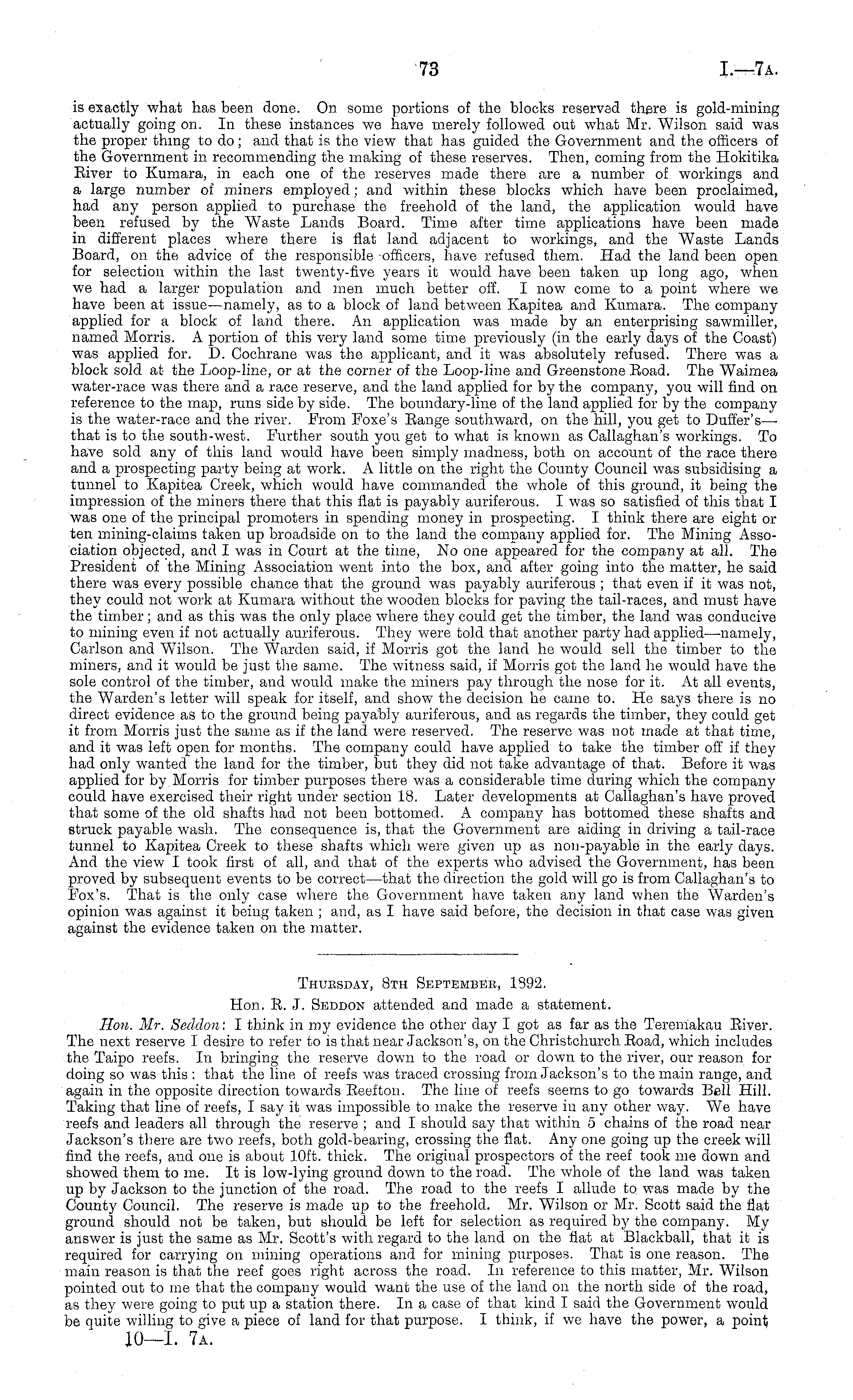 Thursday, Bth September, 1392. Hon, R. J. Seddon attended and made a statement. Hon. Mr, Seddon: I think in my evidence the other day I got as far as the Tereniakau River. The next reserve I desire to refer to is that near Jackson's, on the Christchurch Road, which includes the Taipo reefs. In bringing the reserve down to the road or down to the river, our reason for doing so was this : that the line of reefs was traced crossing from Jackson's to the main range, and again in the opposite direction towards Reefton. The line of reefs seems to go towards Bell Hill. Taking that line of reefs, I say it was impossible to make the reserve in any other way. We have reefs and leaders all through the reserve ; and I should say that within 5 chains of the road near Jackson's there are two reefs, both gold-bearing, crossing the flat. Any one going up the creek will find the reefs, and one is about 10ft. thick. The original prospectors of the reef took me down and showed them to me. It is low-lying ground down to the road. The whole of the land was taken up by Jackson to the junction of the road. The road to the reefs I allude to was made by the County Council. The reserve is made up to the freehold. Mr. Wilson or Mr. Scott said the flat ground should not be taken, but should be left for selection as required by the company. My answer is just the same as Mr. Scott's with regard to the land on the flat at Blackball, that it is required for carrying on mining operations and for mining purposes. That is one reason. The main reason is that the reef goes right across the road. In reference to this matter, Mr. Wilson pointed out to me that the company would want the use of the land on the north side of the road, as they were going to put up a station there. In a case of that kind I said the Government would be quite willing to give a piece of land for that purpose. I think, if we have the power, a point 10—I. 7a.