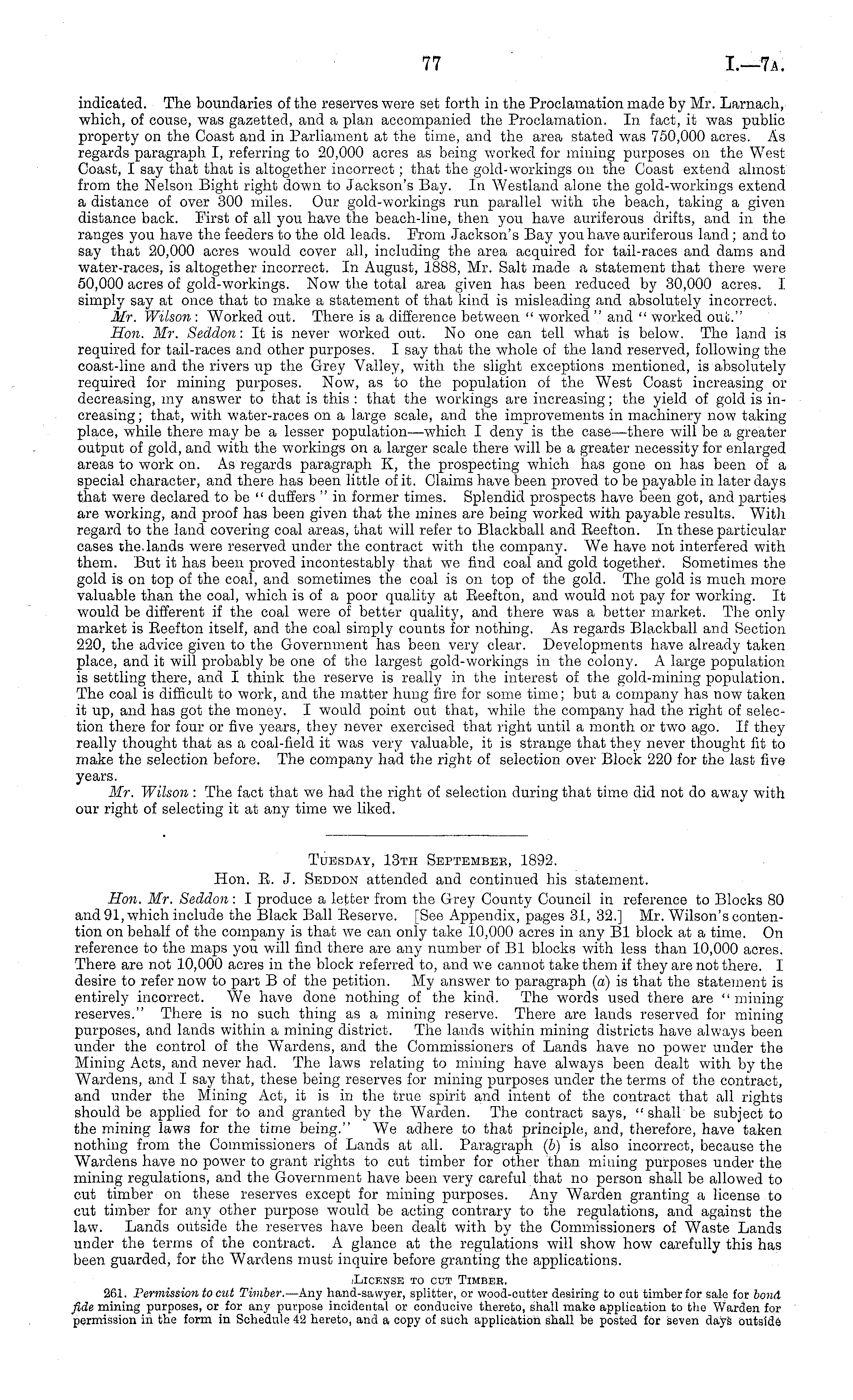 Tuesday, 13th September, 1892. Hon. E. J. Seddon attended and continued his statement. Hon. Mr. Seddon : I produce a letter from the Grey County Council in reference to Blocks 80 and 91, which include the Black Ball Eeserve. [See Appendix, pages 81, 32.] Mr. Wilson's contention on behalf of the company is that we can only take 10,000 acres in any Bl block at a time. On reference to the maps you will find there are any number of Bl blocks with less than 10,000 acres. There are not 10,000 acres in the block referred to, and we cannot take them if they are not there. I desire to refer now to pan Bof the petition. My answer to paragraph (a) is that the statement is entirely incorrect. We have done nothing of the kind. The words used there are " mining reserves." There is no such thing as a mining reserve. There are lands reserved for mining purposes, and lands within a mining district. The lands within mining districts have always been under the control of the Wardens, and the Commissioners of Lands have no power under the Mining Acts, and never had. The laws relating to mining have always been dealt with by the Wardens, and 1 say that, these being reserves for mining purposes under the terms of the contract, and under the Mining Act, it is in the true spirit and intent of the contract that all rights should be applied for to and granted by the Warden. The contract says, " shall be subject to the mining laws for the time being." We adhere to that principle, and, therefore, have taken nothing from the Commissioners of Lands at all. Paragraph (b) is also incorrect, because the Wardens have no power to grant rights to cut timber for other than mining purposes under the mining regulations, and the Government have been very careful.that no person shall be allowed to cut timber on these reserves except for mining purposes. Any Warden granting a license to cut timber for any other purpose would be acting contrary to the regulations, and against the law. Lands outside the reserves have been dealt with by the Commissioners of Waste Lands under the terms of the contract. A glance at the regulations will show how carefully this has been guarded, for the Wardens must inquire before granting the applications. iLicense to out Timber. 261. Permission to cut Timber. —Any hand-sawyer, splitter, or wood-cutter desiring to cut timber for sale for bond fide mining purposes, or for any purpose incidental or conducive thereto, shall make application to the Warden for permission in the form in Schedule 42 hereto, and a copy of such application shall be posted for seven days outside