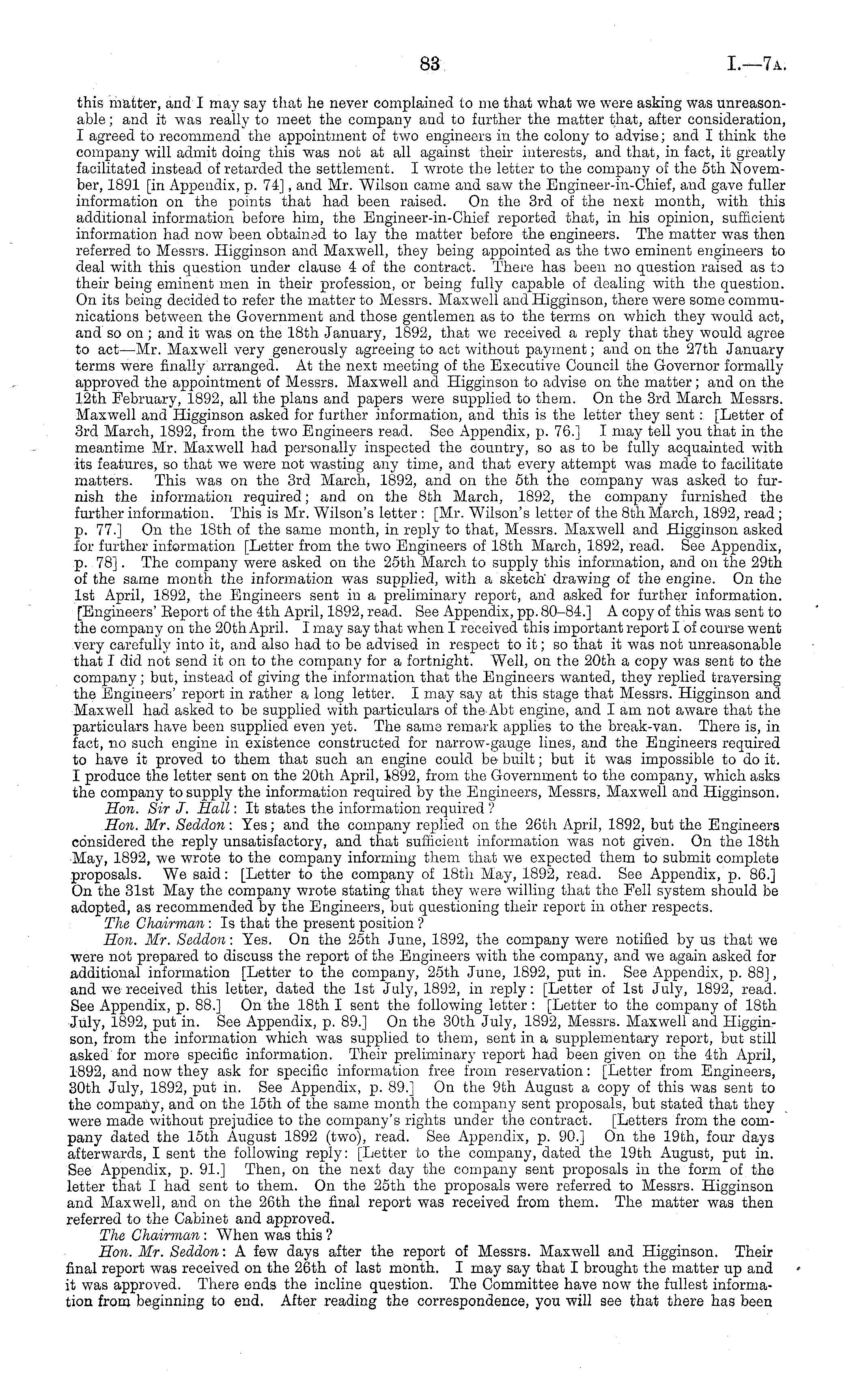 this matter, and I may say that he never complained to me that what we were asking was unreasonable ; and it was really to meet the company and to further the matter that, after consideration, I agreed to recommend the appointment of two engineers in the colony to advise; and I think the company will admit doing this was not at all against their interests, and that, in fact, it greatly facilitated instead of retarded the settlement. I wrote the letter to the company of the sth November, 1891 [in Appendix, p. 74], and Mr. Wilson came and saw the Engineer-in-Chief, and gave fuller information on the points that had been raised. On the 3rd of the next month, with this additional information before him, the Engineer-in-Chief reported that, in his opinion, sufficient information had now been obtained to lay the matter before the engineers. The matter was then referred to Messrs. Higginson and Maxwell, they being appointed as the two eminent engineers to deal with this question under clause 4of the contract. There has been no question raised as to their being eminent men in their profession, or being fully capable of dealing with the question. On its being decided to refer the matter to Messrs. Maxwell and Higginson, there were some communications betw T een the Government and those gentlemen as to the terms on which they would act, and so on ; and it was on the 18th January, 1892, that we received a reply that they would agree to act —Mr. Maxwell very generously agreeing to act without payment; and on the 27th January terms were finally arranged. At the next meeting of the Executive Council the Governor formally approved the appointment of Messrs. Maxwell and Higginson to advise on the matter; and on the 12th February, 1892, all the plans and papers were supplied to them. On the 3rd March Messrs. Maxwell and Higginson asked for further information, and this is the letter they sent : [Letter of 3rd March, 1892, from the two Engineers read. See Appendix, p. 76.] I may tell you that in the meantime Mr. Maxwell had personally inspected the country, so as to be fully acquainted with its features, so that we were not wasting any time, and that every attempt was made to facilitate matters. This was on the 3rd March, 1892, and on the sth the company was asked to furnish the information required; and on the Bth March, 1892, the company furnished the further information. This is Mr. Wilson's letter : [Mr. Wilson's letter of the Bth March, 1892, read; p. 77.] On the 18th of the same month, in reply to that, Messrs. Maxwell and Higginson asked for further information [Letter from the two Engineers of 18th March, 1892, read. See Appendix, p. 78]. The company were asked on the 25th March to supply this information, and on the 29th of the same month the information was supplied, with a sketch' drawing of the engine. On the Ist April, 1892, the Engineers sent in a preliminary report, and asked for further information. [Engineers' Eeport of the 4th April, 1892, read. See Appendix, pp. 80-84.] A copy of this was sent to the company on the 20th April. I may say that when I received this important report lof course went very carefully into it, and also had to be advised in respect to it; so that it was not unreasonable that I did not send it on to the company for a fortnight. Well, on the 20th a copy was sent to the company ; but, instead of giving the information that the Engineers wanted, they replied traversing the Engineers' report in rather a long letter. I may say at this stage that Messrs. Higginson and Maxwell had asked to be supplied with particulars of the Abt engine, and I am not aware that the particulars have been supplied even yet. The same remark applies to the break-van. There is, in fact, no such engine in existence constructed for narrow-gauge lines, and the Engineers required to have it proved to them that such an engine could be built; but it was impossible to do it. I produce the letter sent on the 20th April, 1892, from the Government to the company, which asks the company to supply the information required by the Engineers, Messrs, Maxwell and Higginson. Hon. Sir J. Hall : It states the information required ? Hon. Mr. Seddon : Yes; and the company replied on the 26th April, 1892, but the Engineers considered the reply unsatisfactory, and that sufficient information was not given. On the 18th May, 1892, we wrote to the company informing them that we expected them to submit complete proposals. We said: [Letter to the company of 18th May, 1892, read. See Appendix, p. 86.] On the 31st May the company wrote stating that they were willing that the Fell system should be adopted, as recommended by the Engineers, but questioning their report in other respects. The Chairman : Is that the present position ? Hon. Mr. Seddon : Yes. On the 25th June, 1892, the company were notified by us that we were not prepared to discuss the report of the Engineers with the company, and we again asked for additional information [Letter to the company, 25th June, 1892, put in. See Appendix, p. 88], and we received this letter, dated the Ist July, 1892, in reply: [Letter of Ist July, 1892, read. See Appendix, p. 88.] On the 18th I sent the following letter : [Letter to the company of 18th July, 1892, put in. See Appendix, p. 89.] On the 30th July, 1892, Messrs. Maxwell and Higginson, from the information which was supplied to them, sent in a supplementary report, but still asked for more specific information. Their preliminary report had been given on the 4th April, 1892, and now they ask for specific information free from reservation: [Letter from Engineers, 30th July, 1892, put in. See Appendix, p. 89.] On the 9th August a copy of this was sent to the company, and on the 15th of the same month the company sent proposals, but stated that they were made without prejudice to the company's rights under the contract. [Letters from the company dated the loth August 1892 (two), read. See Appendix, p. 90.] On the 19th, fou