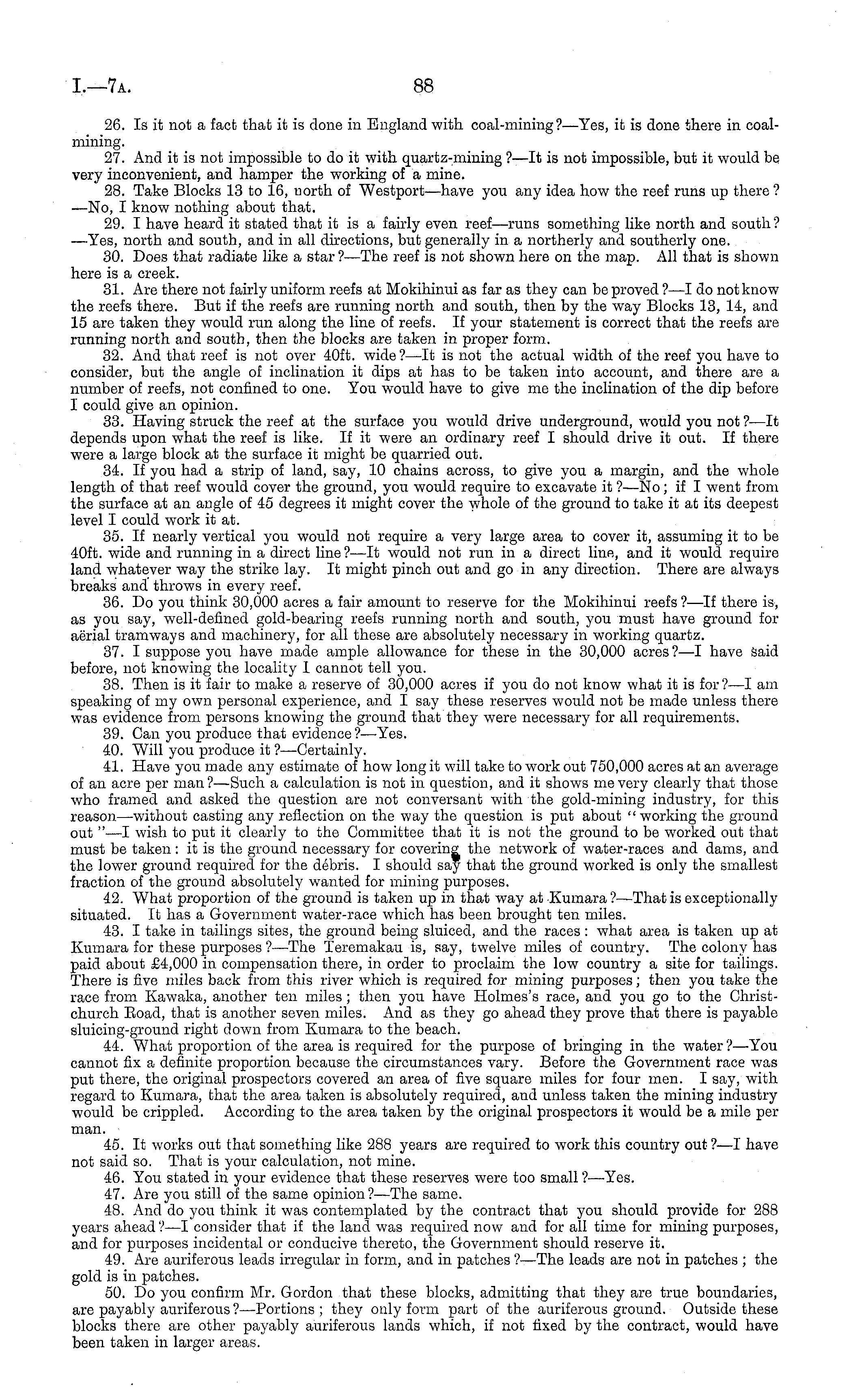 26. Is it not a fact that it is done in England with coal-mining?— Yes, it is done there in coalmining. 27. And it is not impossible to do it with quartz-mining ?—lt is not impossible, but it would be very inconvenient, and hamper the working of a mine. 28. Take Blocks 13 to 16, north of Westport—have you any idea how the reef runs up there ? —No, I know nothing about that. 29. I have heard it stated that it is a fairly even reef—runs something like north and south? —Yes, north and south, and in all directions, but generally in a northerly and southerly one. 30. Does that radiate like a star ?—The reef is not shown here on the map. All that is shown here is a creek. 31. Are there not fairly uniform reefs at Mokihinui as far as they can be proved ?—I do not know the reefs there. But if the reefs are running north and south, then by the way Blocks 13, 14, and 15 are taken they would run along the line of reefs. If your statement is correct that the reefs are running north and south, then the blocks are taken in proper form. 32. And that reef is not over 40ft. wide?—lt is not the actual width of the reef you have to consider, but the angle of inclination it dips at has to be taken into account, and there are a number of reefs, not confined to one. You would have to give me the inclination of the dip before I could give an opinion. 33. Having struck the reef at the surface you would drive underground, would you not ?—lt depends upon what the reef is like. If it were an ordinary reef I should drive it out. If there were a large block at the surface it might be quarried out. 34. If you had a strip of land, say, 10 chains across, to give you a margin, and the whole length of that reef would cover the ground, you would require to excavate it ? —No; if I went from the surface at an angle of 45 degrees it might cover the whole of the ground to take it at its deepest level I could work it at. 35. If nearly vertical you would not require a very large area to cover it, assuming it to be 40ft. wide and running in a direct line ?—lt would not run in a direct line, and it would require land whatever way the strike lay. It might pinch out and go in any direction. There are always breaks and throws in every reef. 36. Do you think 30,000 acres a fair amount to reserve for the Mokihinui reefs ? —lf there is, as you say, well-defined gold-bearing reefs running north and south, you must have ground for aerial tramways and machinery, for all these are absolutely necessary in working quartz. 37. I suppose you have made ample allowance for these in the 30,000 acres? —I have said before, not knowing the locality I cannot tell you. 38. Then is it fair to make a reserve of 30,000 acres if you do not know what it is for?—l am speaking of my own personal experience, and I say these reserves would not be made unless there was evidence from persons knowing the ground that they were necessary for all requirements. 39. Can you produce that evidence ?—Yes. 40. Will you produce it ? —Certainly. 41. Have you made any estimate of how long it will take to work out 750,000 acres at an average of an acre per man?'—Such a calculation is not in question, and it shows me very clearly that those who framed and asked the question are not conversant with the gold-mining industry, for this reason —without casting any reflection on the way the question is put about "working the ground out " —I wish to put it clearly to the Committee that it is not the ground to be worked out that must be taken : it is the ground necessary for covering the network of water-races and dams, and the lower ground required for the debris. I should say that the ground worked is only the smallest fraction of the ground absolutely wanted for mining purposes. 42. What proportion of the ground is taken up in that way at Kumara?—That is exceptionally situated. It has a Government water-race which has been brought ten miles. 43. I take in tailings sites, the ground being sluiced, and the races : what area is taken up at Kumara for these purposes ?—The Teremakau is, say, twelve miles of country. The colony has paid about £4,000 in compensation there, in order to proclaim the low country a site for tailings. There is five miles back from this river which is required for mining purposes; then you take the race from Kawaka, another ten miles; then you have Holmes's race, and you go to the Christchurch Eoad, that is another seven miles. And as they go ahead they prove that there is payable sluicing-ground right down from Kumara to the beach. 44. What proportion of the area is required for the purpose of bringing in the water ?—-You cannot fix a definite proportion because the circumstances vary. Before the Government race was put there, the original prospectors covered an area of five square miles for four men. I say, with regard to Kumara, that the area taken is absolutely required, and unless taken the mining industry would be crippled. According to the area taken by the original prospectors it would be a mile per man. 45. It works out that something like 288 years are required to work this country out?—l have not said so. That is your calculation, not mine. 46. You stated in your evidence that these reserves were too small ? —Yes. 47. Are you still of the same opinion? —The same. 48. And do you think it was contemplated by the contract that you should provide for 288 years ahead?—l consider that if the land was required now and for all time for mining purposes, and for purposes incidental or conducive thereto, the Government should reserve it. 49. Are auriferous leads irregular in form, and in patches ?—The leads are not in patches ; the gold is in patches. 50. Do you confirm Mr. Gordon that these blocks, admitting that they are true boundaries, are payably auriferous ?—Portions ; they only form part of the auriferous ground. Outside these blocks there are other payably auriferous lands which, if not fixed by