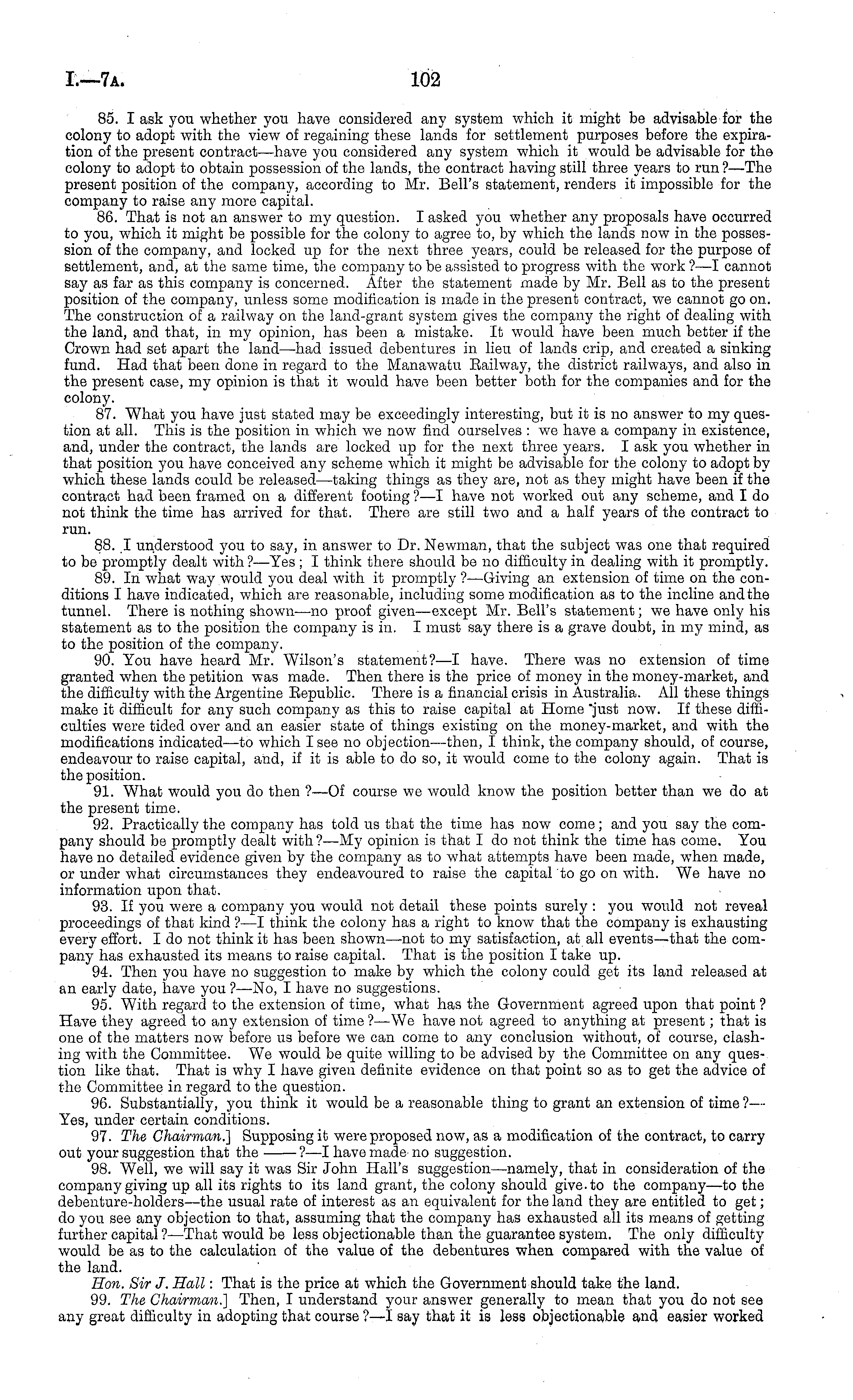 85. I ask you whether you have considered any system which it might be advisable for the colony to adopt with the view of regaining these lands for settlement purposes before the expiration of the present contract—have you considered any system which it would be advisable for the colony to adopt to obtain possession of the lands, the contract having still three years to run ?—The present position of the company, according to Mr. Bell's statement, renders it impossible for the company to raise any more capital. 86. That is not an answer to my question. I asked you whether any proposals have occurred to you, which it might be possible for the colony to agree to, by which the lands now in the possession of the company, and locked up for the next three years, could be released for the purpose of settlement, and, at the same time, the company to be assisted to progress with the work ?—I cannot say as far as this company is concerned. After the statement made by Mr. Bell as to the present position of the company, unless some modification is made in the present contract, we cannot go on. The construction of a railway on the land-grant system gives the company the right of dealing with the land, and that, in my opinion, has been a mistake. It would have been much better if the Crown had set apart the land—had issued debentures in lieu of lands crip, and created a sinking fund. Had that been done in regard to the Manawatu Railway, the district railways, and also in the present case, my opinion is that it would have been better both for the companies and for the colony. 87. What you have just stated may be exceedingly interesting, but it is no answer to my question at all. This is the position in which we now find ourselves : we have a company in existence, and, under the contract, the lands are locked up for the next three years. I ask you whether in that position you have conceived any scheme which it might be advisable for the colony to adopt by which these lands could be released—taking things as they are, not as they might have been if the contract had been framed on a different footing ?—I have not worked out any scheme, and I do not think the time has arrived for that. There are still two and a half years of the contract to run. 88. I understood you to say, in answer to Dr. Newman, that the subject was one that required to be promptly dealt with ?—Yes; I think there should be no difficulty in dealing with it promptly. 89. In what way would you deal with it promptly ?—Giving an extension of time on the conditions I have indicated, which are reasonable, including some modification as to the incline and the tunnel. There is nothing shown—no proof given—except Mr. Bell's statement; we have only his statement as to the position the company is in. I must say there is a grave doubt, in my mind, as to the position of the company. 90. You have heard Mr. Wilson's statement?—l have. There was no extension of time granted when the petition was made. Then there is the price of money in the money-market, and the difficulty with the Argentine Republic. There is a financial crisis in Australia. Ail these things make it difficult for any such company as this to raise capital at Home "just now. If these difficulties were tided over and an easier state of things existing on the money-market, and with the modifications indicated—to which I see no objection—then, I think, the company should, of course, endeavour to raise capital, and, if it is able to do so, it would come to the colony again. That is the position. 91. What would you do then ?—-Of course we would know the position better than we do at the present time. 92. Practically the company has told us that the time has now come; and you say the company should be promptly dealt with? —My opinion is that I do not think the time has come. You have no detailed evidence given by the company as to what attempts have been made, when made, or under what circumstances they endeavoured to raise the capital to go on with. We have no information upon that. 93. If you were a company you would not detail these points surely : you would not reveal proceedings of that kind ? —I think the colony has a right to know that the company is exhausting every effort. I do not think it has been shown —not to my satisfaction, at all events—that the company has exhausted its means to raise capital. That is the position I take up. 94. Then you have no suggestion to make by which the colony could get its land released at an early date, have you ? —No, I have no suggestions. 95. With regard to the extension of time, what has the Government agreed upon that point ? Have they agreed to any extension of time ?—We have not agreed to anything at present; that is one of the matters now before us before we can come to any conclusion without, of course, clashing with the Committee. We would be quite willing to be advised by the Committee on any question like that. That is why I have given definite evidence on that point so as to get the advice of the Committee in regard to the question. 96. Substantially, you think it would be a reasonable thing to grant an extension of time ? — Yes, under certain conditions. 97. The Chairman.] Supposing it were proposed now, as a modification of the contract, to carry out your suggestion that the -?—I have made no suggestion. 98. Well, we will say it was Sir John Hall's suggestion—namely, that in consideration of the company giving up all its rights to its land grant, the colony should give, to the company —to the debenture-holders—the usual rate of interest as an equivalent for the land they are entitled, to get; do you see any objection to that, assuming that the company has exhausted all its means of getting further capital ?—That would be less objectionable than the guarantee system. The only difficulty would be as to the calculation of the value of the debentures when compared with the value of the land