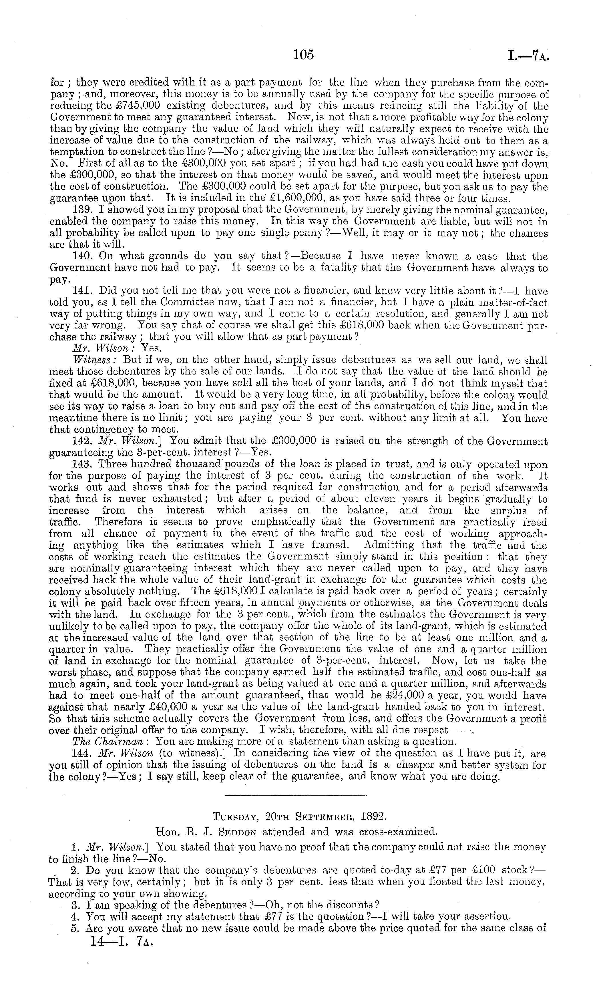 Tuesday, 20th Septembek, 1892. Hon. E. J. Sbddon attended and was cross-examined. 1. Mr. Wilson.] You stated that you have no proof that the company could not raise the money to finish the line ? —No. 2. Do you know that the company's debentures are quoted to-day at £77 per £100 stock?— That is very low, certainly; but it is only 3 per cent, less than when you floated the last money, according to your own showing. 3. I am speaking of the debentures ? —Oh, not the discounts? 4. You will accept my statement that £77 is the quotation?—l will take your assertion. 5. Are you aware that no new issue could be made above the price quoted for the same class of 14—1. 7a.