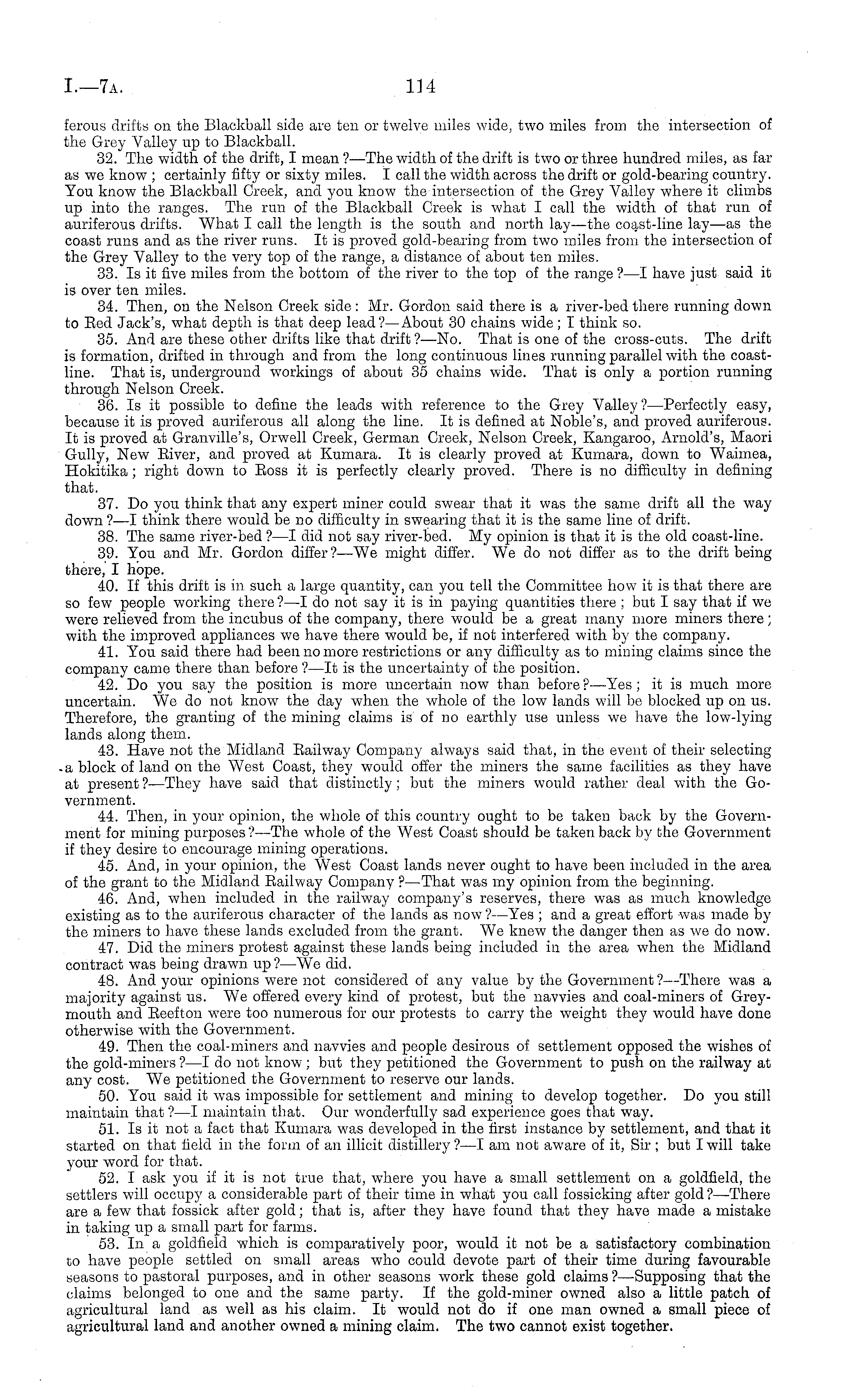 ferous drifts on the Blackball side are ten or twelve miles wide, two miles from the intersection of the Grey Valley up to Blackball. 32. The width of the drift, I mean ?—The width of the drift is two or three hundred miles, as far as we know ; certainly fifty or sixty miles. I call the width across the drift or gold-bearing country. You know the Blackball Creek, and you know the intersection of the Grey Valley where it climbs up into the ranges. The run of the Blackball Creek is what I call the width of that run of auriferous drifts. What I call the length is the south and north lay—the coast-line lay—as the coast runs and as the river runs. It is proved gold-bearing from two miles from the intersection of the Grey Valley to the very top of the range, a distance of about ten miles. 33. Is it five miles from the bottom of the river to the top of the range ?—I have just said it is over ten miles. 34. Then, on the Nelson Creek side : Mr. Gordon said there is a river-bed there running down to Eed Jack's, what depth is that deep lead?— About 30 chains wide; I think so. 35. And are these other drifts like that drift ?—No. That is one of the cross-cuts. The drift is formation, drifted in through and from the long continuous lines running parallel with the coastline. That is, underground workings of about 35 chains wide. That is only a portion running through Nelson Creek. 36. Is it possible to define the leads with reference to the Grey Valley?— Perfectly easy, because it is proved auriferous all along the line. It is defined at Noble's, and proved auriferous. It is proved at Granville's, Orwell Creek, German Creek, Nelson Creek, Kangaroo, Arnold's, Maori Gully, New Eiver, and proved at Kumara. It is clearly proved at Kumara, down to Waimea, Hokitika; right down to Eoss it is perfectly clearly proved. There is no difficulty in defining that. 37. Do you think that any expert miner could swear that it was the same drift all the way down ?—I think there would be no difficulty in swearing that it is the same line of drift. 38. The same river-bed ?—I did not say river-bed. My opinion is that it is the old coast-line. 39. You and Mr. Gordon differ?—We might differ. We do not differ as to the drift being there, I hope. 40. If this drift is in such a large quantity, can you tell the Committee how it is that there are so few people working there ?—I do not say it is in paying quantities there ; but I say that if we were relieved from the incubus of the company, there would be a great many more miners there; with the improved appliances we have there would be, if not interfered with by the company. 41. You said there had been no more restrictions or any difficulty as to mining claims since the company came there than before ? —lt is the uncertainty of the position. 42. Do you say the position is more uncertain now than, before ? —Yes ; it is much more uncertain. We do not know the day when the whole of the low lands will be blocked up on us. Therefore, the granting of the mining claims is of no earthly use unless we have the low-lying lands along them. 43. Have not the Midland Railway Company always said that, in the event of their selecting ■ a block of land on the West Coast, they would offer the miners the same facilities as they have at present ?—They have said that distinctly; but the miners would rather deal with the Government. 44. Then, in your opinion, the whole of this country ought to be taken back by the Government for mining purposes ?—The whole of the West Coast should be taken back by the Government if they desire to encourage mining operations. 45. And, in your opinion, the West Coast lands never ought to have been included in the area of the grant to the Midland Eailway Company ? —That was my opinion from the beginning. 46. And, when included in the railway company's reserves, there was as much knowledge existing as to the auriferous character of the lands as now ?—Yes ; and a great effort was made by the miners to have these lands excluded from the grant. We knew the danger then as we do now. 47. Did the miners protest against these lands being included in the area when the Midland contract was being drawn up?—We did. 48. And your opinions were not considered of any value by the Government ? —There was a majority against us. We offered every kind of protest, but the navvies and coal-miners of Greymouth and Beefton were too numerous for our protests to carry the weight they would have done otherwise with the Government. 49. Then the coal-miners and navvies and people desirous of settlement opposed the wishes of the gold-miners ? —I do not know ; but they petitioned the Government to push on the railway at any cost. We petitioned the Government to reserve our lands. 50. You said it was impossible for settlement and mining to develop together. Do you still maintain that ?—I maintain that. Our wonderfully sad experience goes that way. 51. Is it not a fact that Kumara was developed in the first instance by settlement, and that it started on that field in the form of an illicit distillery ? —I am not aware of it, Sir ; but I will take your word for that. 52. I ask you if it is not true that, where you have a small settlement on a goldfield, the settlers will occupy a considerable part of their time in what you call fossicking after gold ?—There are a few that fossick after gold; that is, after they have found that they have made a mistake in taking up a small part for farms. 53. In a goldfield which is comparatively poor, would it not be a satisfactory combination to have people settled on small areas who could devote part of their time during favourable seasons to pastoral purposes, and in other seasons work these gold claims ?—Supposing that the claims belonged to one and the same party. If the gold-miner owned also a little patch of agricultural land as well as his claim. It would not do if one man owned a small piece of agricultural land 