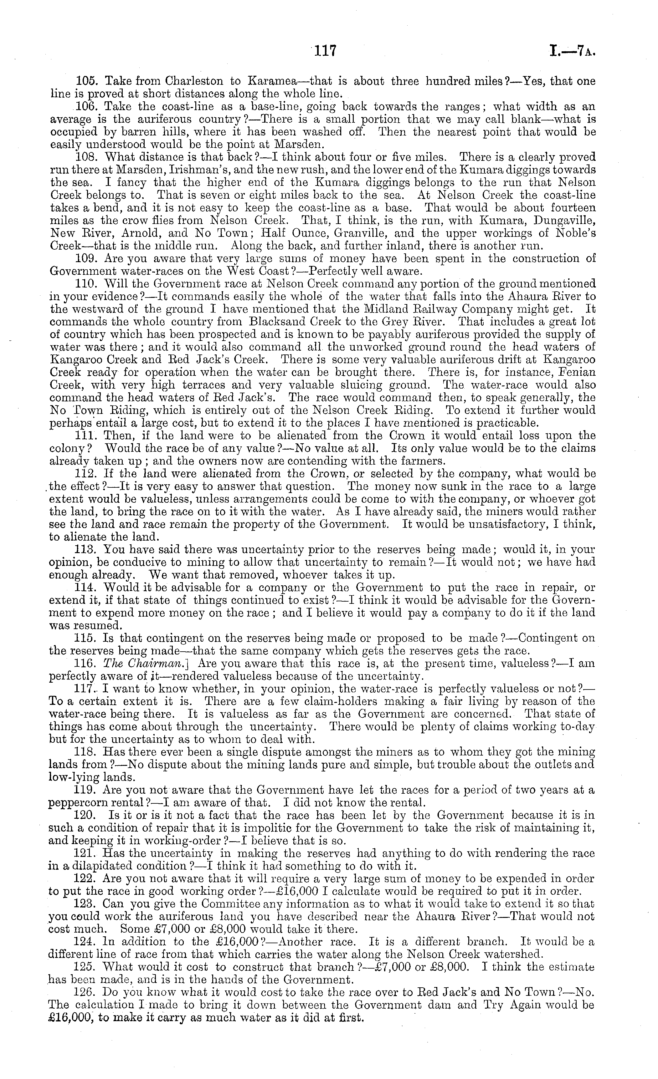 105. Take from Charleston to Karamea —that is about three hundred miles ?—Yes, that one line is proved at short distances along the whole line. 106. Take the coast-line as a base-line, going back towards the ranges; what width as an average is the auriferous country ?—There is a small portion that we may call blank —what is occupied by barren hills, where it has been washed off. Then the nearest point that would be easily understood would be the point at Marsden. 108. What distance is that back?—l think about four or five miles. There is a clearly proved run there at Marsden, Irishman's, and the new rush, and the lower end of the Kumara diggings towards the sea. I fancy that the higher end of the Kumara diggings belongs to the run that Nelson Creek belongs to. That is seven or eight miles back to the sea. At Nelson Creek the coast-line takes a bend, and it is not easy to keep the coast-line as a base. That would be about fourteen miles as the crow flies from Nelson Creek. That, I think, is the run, with Kumara, Dungaville, New Eiver, Arnold, and No Town; Half Ounce, Granville, and the upper workings of Noble's Creek—that is the middle run. Along the back, and further inland, there is another run. 109. Are you aware that very large sums of money have been spent in the construction of Government water-races on the West Coast ?—Perfectly well aware. 110. Will the Government race at Nelson Creek command any portion of the ground mentioned in your evidence ?—lt commands easily the whole of the water that falls into the Ahaura Eiver to the westward of the ground I have mentioned that the Midland Eailway Company might get. It commands the whole country from Blacksand Creek to the Grey Eiver. That includes a great lot of country which has been prospected and is known to be payably auriferous provided the supply of water was there ; and it would also command all the unworked ground round the head waters of Kangaroo Creek and Eed Jack's Creek. There is some very valuable auriferous drift at Kangaroo Creek ready for operation when the water can be brought there. There is, for instance, Fenian Creek, with very high terraces and very valuable sluicing ground. The water-race would also command the head waters of Eed Jack's. The race would command then, to speak generally, the No Town Biding, which is entirely out of the Nelson Creek Riding. To extend it further would perhaps entail a large cost, but to extend it to the places I have mentioned is practicable. 111. Then, if the land were to be alienated from the Crown it would entail loss upon the colony ? Would the race be of any value ? —No value at all. Its only value would be to the claims already taken up ; and the owners now are contending with the farmers. 112. If the land were alienated from the Crown, or selected by the company, what would be .the effect?—lt is very easy to answer that question. The money now sunk in the race to a large extent would be valueless, unless arrangements could be come to with the company, or whoever got the land, to bring the race on to it with the water. As I have already said, the miners would rather see the land and race remain the property of the Government. It would be unsatisfactory, I think, to alienate the land. 113. You have said there was uncertainty prior to the reserves being made; would it, in your opinion, be conducive to mining to allow that uncertainty to remain?—lt would not; we have had enough already. We want that removed, whoever takes it up. 114. Would it be advisable for a company or the Government to put the race in repair, or extend it, if that state of things continued to exist ?—I think it would be advisable for the Government to expend more money on the race ; and I believe it would pay a company to do it if the land was resumed. 115. Is that contingent on the reserves being made or proposed to be made ? —Contingent on the reserves being made—that the same company which gets the reserves gets the race. 116. The Are you aware that this race is, at the present time, valueless ? —I am perfectly aware of it—rendered valueless because of the uncertainty. 117. I want to know whether, in your opinion, the water-race is perfectly valueless or not?— To a certain extent it is. There are a few claim-holders making a fair living by reason of the water-race being there. It is valueless as far as the Government are concerned. That state of things has come about through the uncertainty. There would be plenty of claims working to-day but for the uncertainty as to whom to deal with. 118. Has there ever been a single dispute amongst the miners as to whom they got the mining lands from ?—No dispute about the mining lands pure and simple, but trouble about the outlets and low-lying lands. 119. Are you not aware that the Government have let the races for a period of two years at a peppercorn rental ?—I am aware of that. I did not know the rental. 120. Is it or is it not a fact that the race has been let by the Government because it is in such a condition of repair that it is impolitic for the Government to take the risk of maintaining it, and keeping it in working-order ? —I believe that is so. 121. Has the uncertainty in making the reserves had anything to do with rendering the race in a dilapidated condition ?—I think it had something to do with it. 122. Are you not aware that it will require a very large sum of money to be expended in order to put the race in good working order?—£l6,ooo I calculate would be required to put it in order. 123. Can you give the Committee any information as to what it would take to extend it so that you could work the auriferous land you have described near the Ahaura Eiver ?—That would not cost much. Some £7,000 or £8,000 would take it there. 124. In addition to the £16,000? —Another race. It is a different branch. It would be a different line of race from that which carries the water along the Nelson Creek watershed. 125. Wha