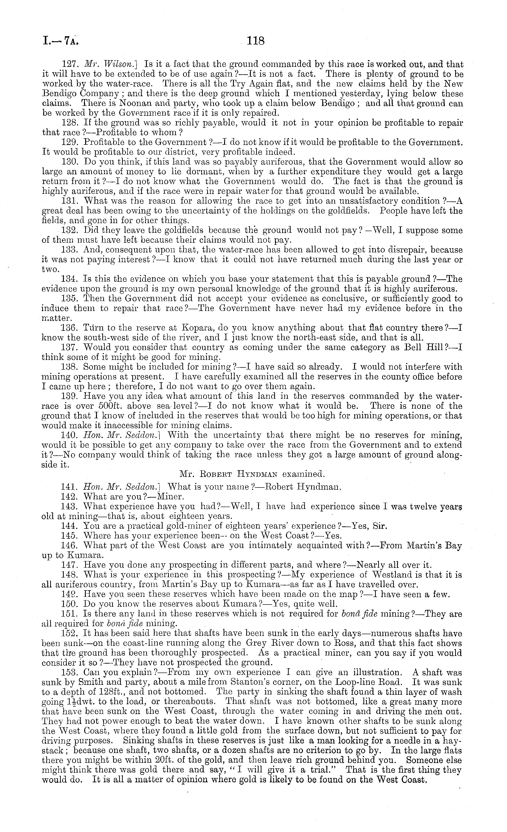127. Mr. Wilson.] Is it a fact that the ground commanded by this race is worked out, and that it will have to be extended to be of use again?—lt is not a fact. There is plenty of ground to be worked by the water-race. There is all the Try Again flat, and the new claims held by the New Bendigo Company ; and there is the deep ground which I mentioned yesterday, lying below these claims. There is Noonan and party, who took up a claim below Bendigo ; and all that ground can be worked by the Government race if it is only repaired. 128. If the ground was so richly payable, would it not in your opinion be profitable to repair that race ? —Profitable to whom ? 129. Profitable to the Government ?—I do not know if it would be profitable to the Government. It would be profitable to our district, very profitable indeed. 130. Do you think, if this land was so payably auriferous, that the Government would allow so large an amount of money to lie dormant, when by a further expenditure they would get a large return from it ? —I do not know what the Government would do. The fact is that the ground is highly auriferous, and if the race were in repair water for that ground would be available. 131. What was the reason for allowing the race to get into an unsatisfactory condition ?—A great deal has been owing to the uncertainty of the holdings on the goldfields. People have left the fields, and gone in for other things. 132. Did they leave the goldfields because the ground would not pay?— Well, I suppose some of them must have left because their claims would not pay. 133. And, consequent upon that, the water-race has been allowed to get into disrepair, because it was not paying interest ? —I know that it could not have returned much during the last year or two. 134. Is this the evidence on which you base your statement that this is payable ground ?—The evidence upon the ground is my own personal knowledge of the ground that it is highly auriferous. 135. Then the Government did not accept your evidence as conclusive, or sufficiently good to induce them to repair that race? —The Government have never had my evidence before in the matter. 136. Turn to the reserve at Kopara, do you know anything about that flat country there?—l know the south-west side of the river, and I just know the north-east side, and that is all. 137. Would you consider that country as coming under the same category as Bell Hill?—I think some of it might be good for mining. 138. Some might be included for mining ?—I have said so already. I would not interfere with mining operations at present. I have carefully examined all the reserves in the county office before I came up here ; therefore, I do not want to go over them again. 139. Have you any idea what amount of this land in the reserves commanded by the waterrace is over 500 ft. above sea level?—l do not know what it would be. There is none of the ground that I know of included in the reserves that would be too high for mining operations, or that would make it inaccessible for mining claims. 140. Hon. Mr. Seddon.] With the uncertainty that there might be no reserves for mining, would it be possible to get any company to take over the race from the Government and to extend it ? —No company would think of taking the race unless they got a large amount of ground alongside it. Mr. EoBEBT Hyndman examined. 141. Hon. Mr. Seddon.] What is your name? —Eobert Hyndman. 142. What are you?— Miner. 143. Wha.t experience have you had?— Well, I have had experience since I was twelve years old at mining—that is, about eighteen years. 144. You are a practical gold-miner of eighteen years' experience ?—Yes, Sir. 145. Where has your experience been— on the West Coast?— Yes. 146. What part of the West Coast are you intimately acquainted with?— From Martin's Bay up to Kumara. 147. Have you done any prospecting in different parts, and where?— Nearly all over it. 148. What is your experience in this prospecting ?—My experience of Westland is that it is all auriferous country, from Martin's Bay up to Kumara —as far as I have travelled over. 149. Have you seen these reserves which have been made on the map? —I have seen a few. 150. Do you know the reserves about Kumara? —Yes, quite well. 151. Is there any land in these reserves which is not required for bond fide mining?— They are all required for bond fide mining. 152. It has been said here that shafts have been sunk in the early days—numerous shafts have been sunk —on the coast-line running along the Grey Eiver down to Eoss, and that this fact shows that the ground has been thoroughly prospected. As a practical miner, can you say if you would consider it so ? —They have not prospected the ground. 153. Can you explain ?—From my own experience I can give an illustration. A shaft was sunk by Smith and party, about a mile from Stanton's corner, on the Loop-line Eoad. It was sunk to a depth of 128 ft., and not bottomed. The party in sinking the shaft found a thin layer of wash going 1-Jdwt. to the load, or thereabouts. That shaft was not bottomed, like a great many more that have been sunk on the West Coast, through the water coming in and driving the men out. They had not power enough to beat the water down. I have known other shafts to be sunk along the West Coast, where they found a little gold from the surface down, but not sufficient to pay for driving purposes. Sinking shafts in these reserves is just like a man looking for a needle in a haystack ; because one shaft, two shafts, or a dozen shafts are no criterion to go by. In the large flats there you might be within 20ft. of the gold, and then leave rich ground behind you. Someone else might think there was gold there and say, "I will give it a trial." That is the first thing they would do. It is all a matter of opinion where gold is likely to be found on the West Coast,