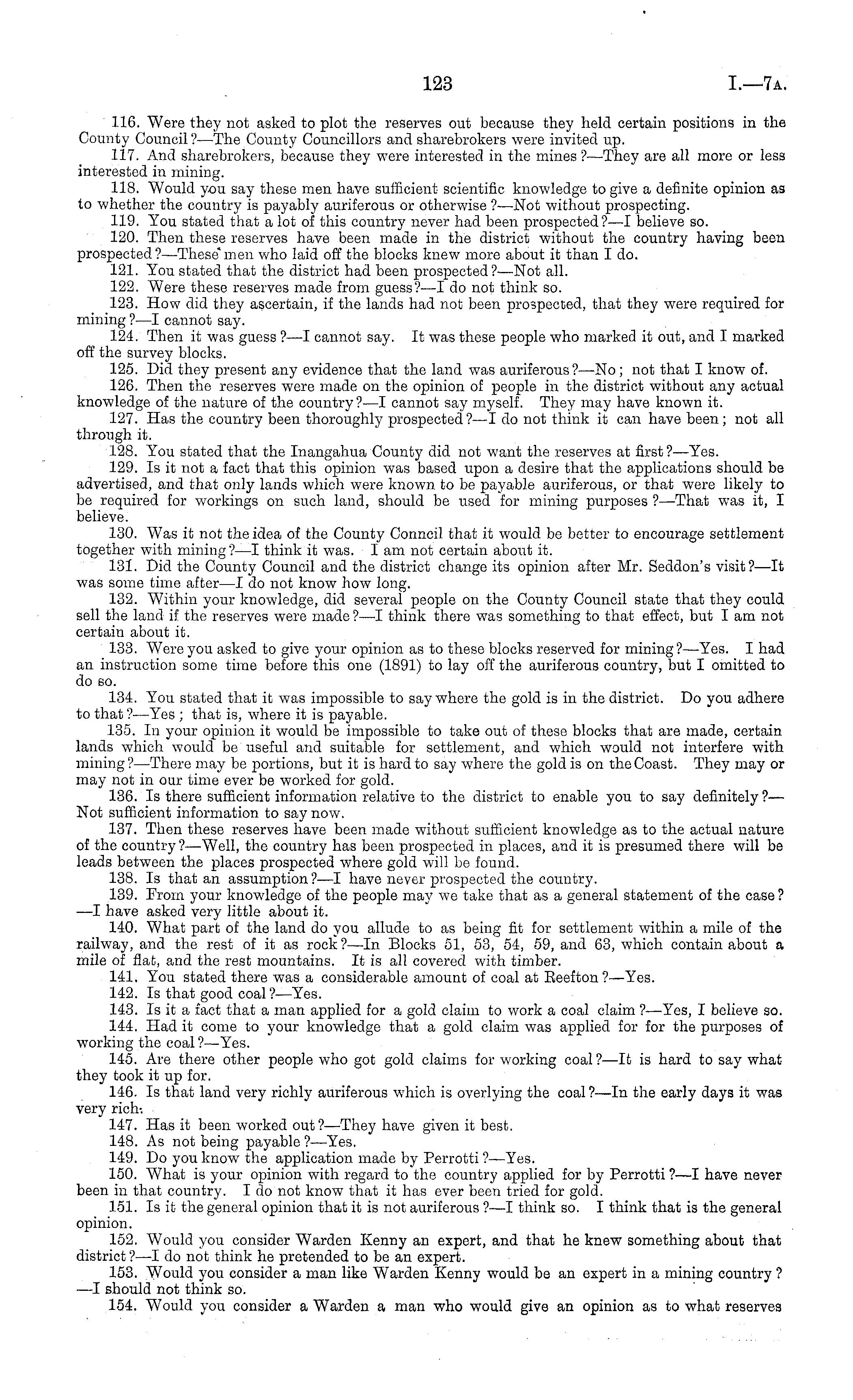 116. Were they not asked to plot the reserves out because they held certain positions in the County Council ? —The County Councillors and sharebrokers were invited up. 117. And sharebrokers, because they were interested in the mines?— They are all more or less interested in mining. 118. Would you say these men have sufficient scientific knowledge to give a definite opinion as to whether the country is payably auriferous or otherwise ?—Not without prospecting. 119. You stated that a lot of this country never had been prospected?—l believe so. 120. Then these reserves have been made in the district without the country having been prospected?—These*men who laid off the blocks knew more about it than I do. 121. You stated that the district had been prospected?— Not all. 122. Were these reserves made from guess?—l do not think so. 123. How did they ascertain, if the lands had not been prospected, that they were required for mining ? —I cannot say. 124. Then it was guess ? —I cannot say. It was these people who marked it out, and I marked off the survey blocks. 125. Did. they present any evidence that the land was auriferous?—No; not that I know of. 126. Then the reserves were made on the opinion of people in the district without any actual knowledge of the nature of the country?—l cannot say myself. They may have known it. 127. Has the country been thoroughly prospected? —I do not think it can have been ; not all through it. 128. You stated that the Inangah.ua County did not want the reserves at first?— Yes. 129. Is it not a fact that this opinion was based upon a desire that the applications should be advertised, and that only lands which were known to be payable auriferous, or that were likely to be required for workings on such land, should be used for mining purposes ?—That was it, I believe. 130. Was it not the idea of the County Conncil that it would be better to encourage settlement together with mining?—il think it was. lam not certain about it. 131. Did the County Council and the district change its opinion after Mr. Seddon's visit?—lt was some time after—l do not know how long. 132. Within your knowledge, did several people on the County Council state that they could sell the land if the reserves were made ? —I think there was something to that effect, but lam not certain about it. 133. Were you asked to give your opinion as to these blocks reserved for mining ?—Yes. I had an instruction some time before this one (1891) to lay off the auriferous country, but I omitted to do so. 134. You stated that it was impossible to say where the gold is in the district. Do you adhere to that ?—Yes ; that is, where it is payable. 135. In your opinion it would be impossible to take out of these blocks that are made, certain lands which would be useful and suitable for settlement, and which would not interfere with mining? —There may be portions, but it is hard to say where the gold is on the Coast. They may or may not in our time ever be worked for gold. 136. Is there sufficient information relative to the district to enable you to say definitely ?— Not sufficient information to say now. 137. Then these reserves have been made without sufficient knowledge as to the actual nature of the country ?—Well, the country has been prospected in places, and it is presumed there will be leads between the places prospected where gold will be found. 138. Is that an assumption ?—I have never prospected the country. 139. From your knowledge of the people may we take that as a general statement of the case ? —I have asked very little about it. 140. What part of the land do you allude to as being fit for settlement within a mile of the railway, and the rest of it as rock?—ln Blocks 51, 53, 54, 59, and 63, which contain about a mile of flat, and the rest mountains. It is all covered with timber. 141. You stated there was a considerable amount of coal at Eeefton?—Yes. 142. Is that good coal ?—Yes. 143. Is it a fact that a man applied for a gold claim to work a coal claim ? —Yes, I believe so. 144. Had it come to your knowledge that a gold claim was applied for for the purposes of working the coal ?—Yes. 145. Are there other people who got gold claims for working coal ?—lt is hard to say what they took it up for. 146. Is that land very richly auriferous which is overlying the coal ?—ln the early days it was very rich-. 147. Has it been worked out?— They have given it best. 148. As not being payable ?—Yes. 149. Do you know the application made by Perrotti ?—Yes. 150. What is your opinion with regard to the country applied for by Perrotti ?—I have never been in that country. Ido not know that it has ever been tried for gold. 151. Is it the general opinion that it is not auriferous ?—I think so. I think that is the general opinion. 152. Would you consider Warden Kenny an expert, and that he knew something about that district ? —I do not think he pretended to be an expert. 153. Would you consider a man like Warden Kenny would be an expert in a mining country ? —I should not think so. 154. Would you consider a Warden a man who would give an opinion as to what reserves