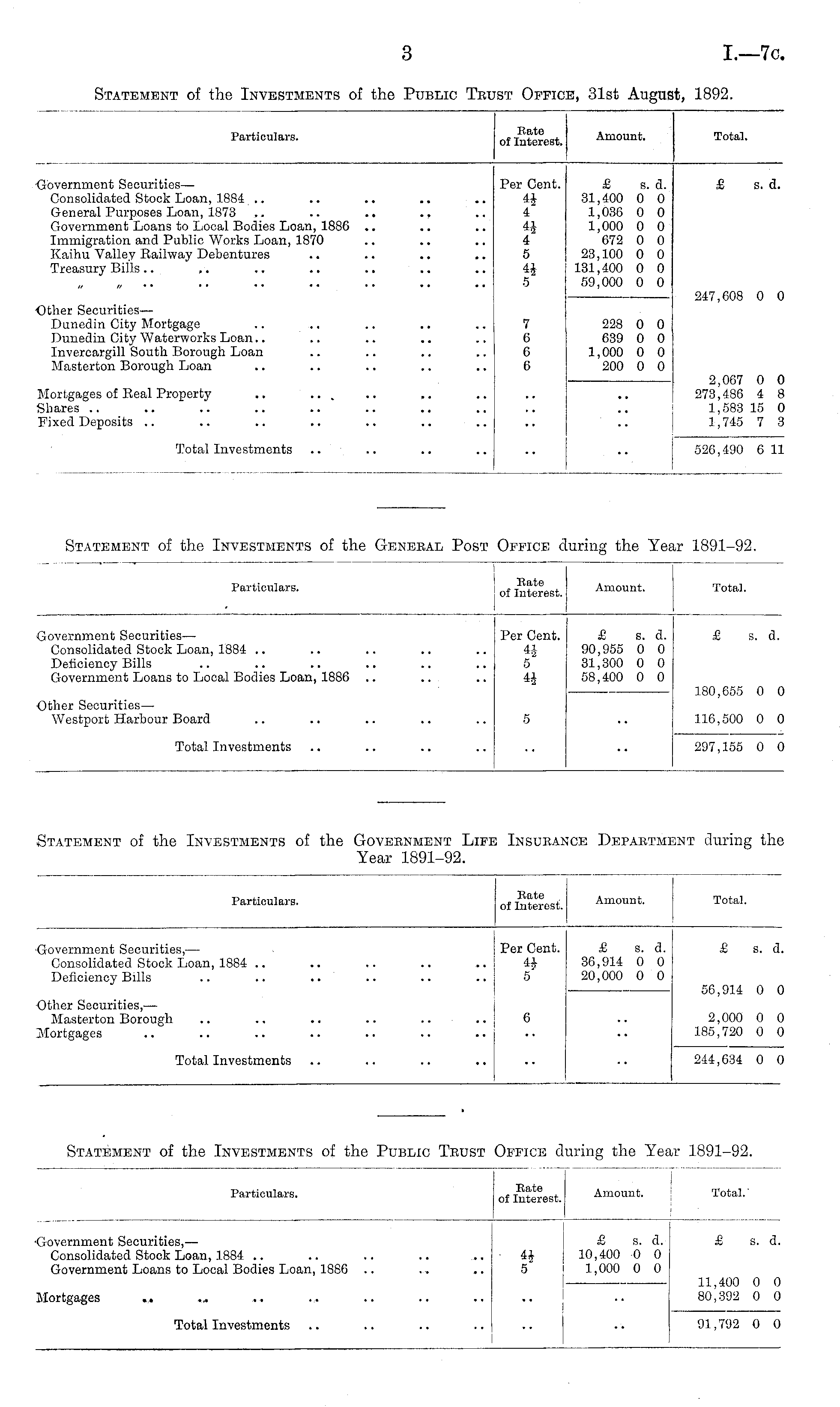 Statement of the Investments of the Government Life Insurance Department during the Year 1891-92.