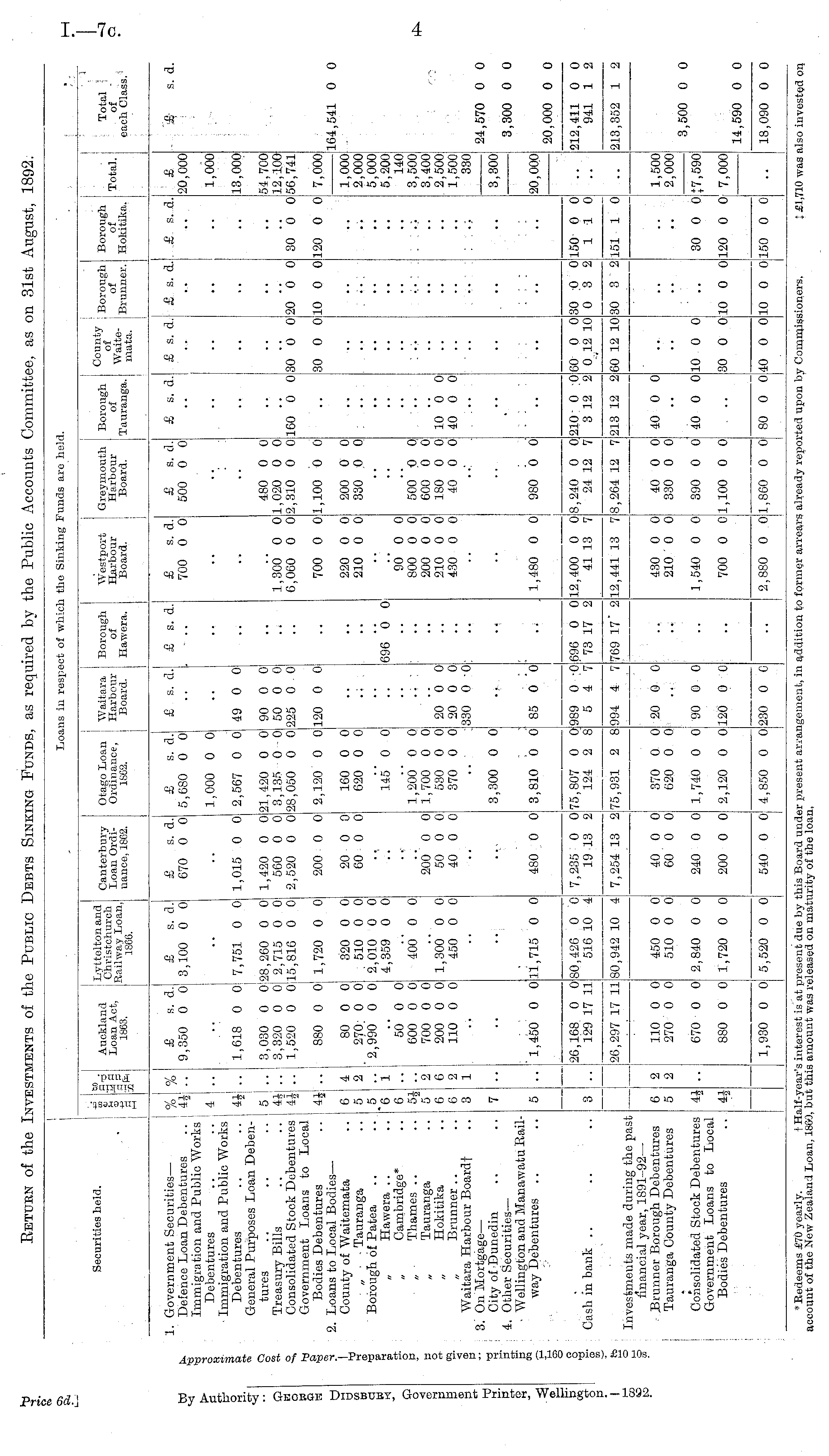 Return of the Investments of the Public Debts Sinking Funds, as required by the Public Accounts Committee, as on 31st August, 1892.