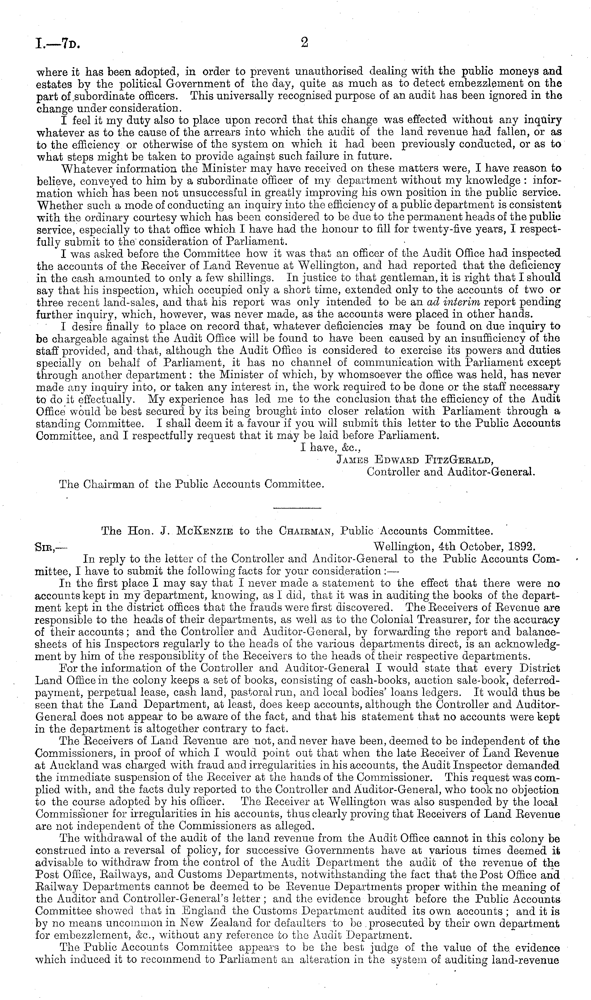 where it has been adopted, in order to prevent unauthorised dealing with the public moneys and estates by the political Government of the day, quite as much as to detect embezzlement on the part of .subordinate officers. This universally recognised purpose of an audit has been ignored in the change under consideration. I feel it my duty also to place upon record that this change was effected without any inquiry whatever as to the cause of the arrears into which the audit of the land revenue had fallen, or as to the efficiency or otherwise of the system on which it had been previously conducted, or as to what steps might be taken to provide against such failure in future. Whatever information the Minister may have received on these matters were, I have reason to believe, conveyed to him by a subordinate officer of my department without my knowledge : information which has been not unsuccessful in greatly improving his own position in the public service. Whether such a mode of conducting an inquiry into the efficiency of a public department is consistent with the ordinary courtesy which has been considered to be due to the permanent heads of the public service, especially to that office which I have had the honour to fill for twenty-five years, I respectfully submit to the consideration of Parliament. I was asked before the Committee how it was that an officer of the Audit Office had inspected the accounts of the Eeceiver of Land Eevenue at Wellington, and had reported that the deficiency in the cash amounted to only a few shillings. In justice to that gentleman, it is right that I should say that his inspection, which occupied only a short time, extended only to the accounts of two or three recent land-sales, and that his report was only intended to be an ad interim report pending further inquiry, which, however, was never made, as the accounts were placed in other hands. I desire finally to place on record that, whatever deficiencies may be found on due inquiry to be chargeable against the Audit Office will be found to have been caused by an insufficiency of the staff provided, and that, although the Audit Office is considered to exercise its powers and duties specially on behalf of Parliament, it has no channel of communication with Parliament except through another department: the Minister of which, by whomsoever the office was held, has never made any inquiry into, or taken any interest in, the work required to be done or the staff necessary to do it effectually. My experience has led me to the conclusion that the efficiency of the Audit Office would be best secured by its being brought into closer relation with Parliament through a standing Committee. I shall deem it a favour if you will submit this letter to the Public Accounts Committee, and I respectfully request that it may be laid before Parliament. I have, &c, James Bdwabd FitzGebald, Controller and Auditor-General. The Chairman of the Public Accounts Committee.