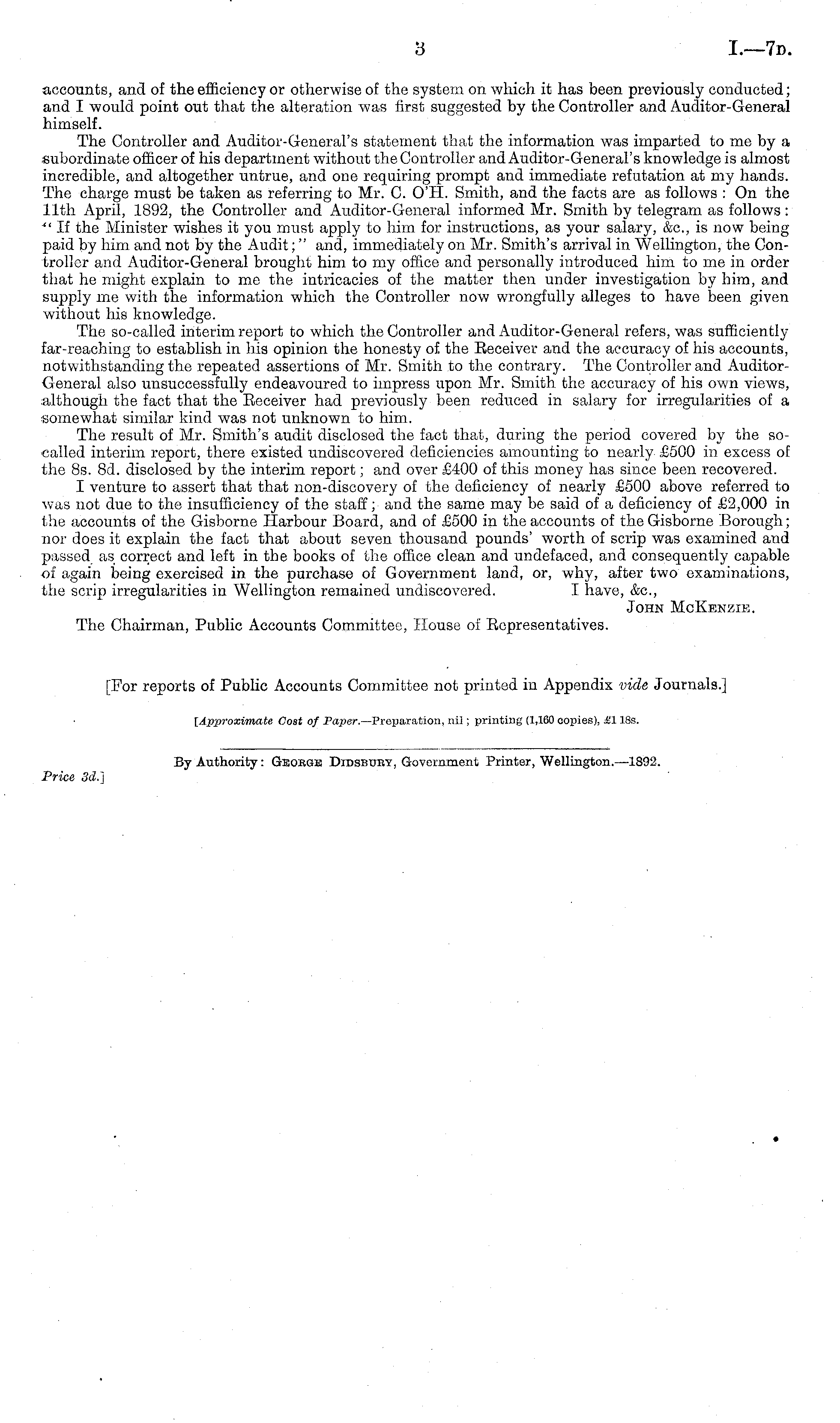 accounts, and of the efficiency or otherwise of the system on which it has been previously conducted; and I would point out that the alteration was first suggested by the Controller and Auditor-General himself. The Controller and Auditor-General's statement that the information was imparted to me by a -subordinate officer of his department without the Controller and Auditor-General's knowledge is almost incredible, and altogether untrue, and one requiring prompt and immediate refutation at my hands. The charge must be taken as referring to Mr. C. OH. Smith, and the facts are as follows : On the 11th April, 1892, the Controller and Auditor-General informed Mr. Smith by telegram as follows : " If the Minister wishes it you must apply to him for instructions, as your salary, &c, is now being paid by him and not by the Audit;" and, immediately on Mr. Smith's arrival in Wellington, the Controller and Auditor-General brought him to my office and personally introduced him to me in order that he might explain to me the intricacies of the matter then under investigation by him, and supply me with the information which the Controller now wrongfully alleges to have been given without his knowledge. The so-called interim report to which the Controller and Auditor-General refers, was sufficiently far-reaching to establish in his opinion the honesty of the Eeceiver and the accuracy of his accounts, notwithstanding the repeated assertions of Mr. Smith to the contrary. The Controller and AuditorGeneral also unsuccessfully endeavoured to impress upon Mr. Smith the accuracy of his own views, although the fact that the Eeceiver had previously been reduced in salary for irregularities of a somewhat similar kind was not unknown to him. The result of Mr. Smith's audit disclosed the fact that, during the period covered by the socalled interim report, there existed undiscovered deficiencies amounting to nearly £500 in excess of the Bs. Bd. disclosed by the interim report; and over £400 of this money has since been recovered. I venture to assert that that non-discovery of the deficiency of nearly £500 above referred to was not due to the insufficiency of the staff; and the same may be said of a deficiency of £2,000 in the accounts of the Gisborne Harbour Board, and of £500 in the accounts of the Gisborne Borough; nor does it explain the fact that about seven thousand pounds' worth of scrip was examined and passed as correct and left in the books of the office clean and undefaced, and consequently capable of again being exercised in the purchase of Government land, or, why, after two examinations, the scrip irregularities in Wellington remained undiscovered. I have, &c, John McKenzie. The Chairman, Public Accounts Committee, House of Representatives. [For reports of Public Accounts Committee not printed in Appendix vide Journals.] {Approximate Cost of Paper.— Preparation, nil; printing (1,100 copies), .£llBs.