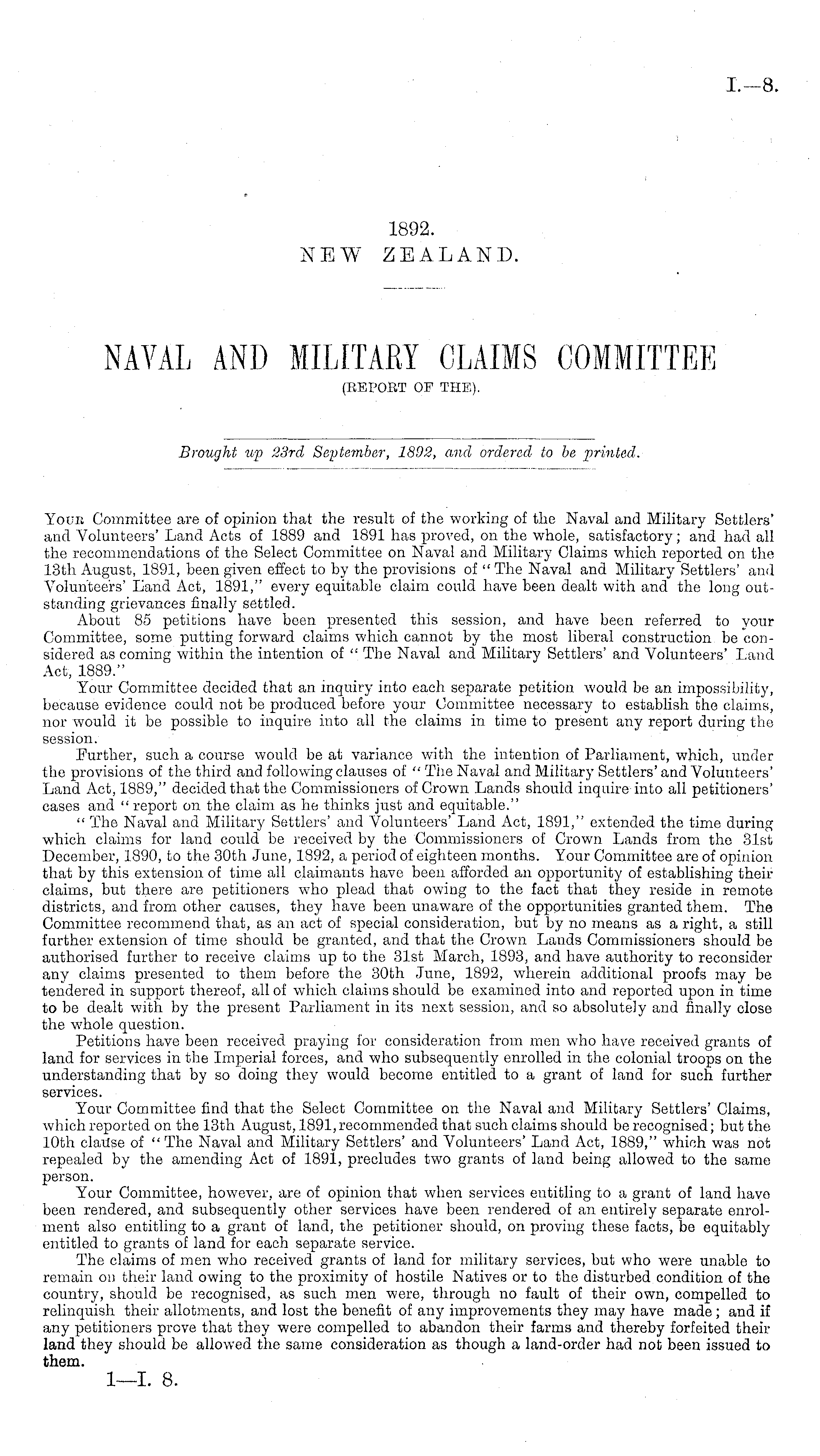 Youe Committee are of opinion that the result of the working of the Naval and Military Settlers' and Volunteers' Land Acts of 1889 and 1891 has proved, on the whole, satisfactory; and had all the recommendations of the Select Committee on Naval and Military Claims which reported on the 13th August, 1891, been given effect to by the provisions of "The Naval and Military Settlers' and Volunteers' Land Act, 1891," every equitable claim could have been dealt with and the long outstanding grievances finally settled. About 85 petitions have been presented this session, and have been referred to your Committee, some putting forward claims which cannot by the most liberal construction be considered as coming within the intention of " The Naval and Military Settlers' and Volunteers' Land Act, 1889." Your Committee decided that an inquiry into each separate petition would be an impossibility, because evidence could not be produced before your Committee necessary to establish the claims, nor would it be possible to inquire into all the claims in time to present any report during the session. Further, such a course would be at variance with the intention of Parliament, which, under the provisions of the third and following clauses of " Tiie Naval and Military Settlers' and Volunteer's' Land Act, 1889," decided that the Commissioners of Crown Lands should inquire into all petitioners' cases and " report on the claim as he thinks just and equitable." " The Naval and Military Settlers' and Volunteers' Land Act, 1891," extended the time during which claims for land could be received by the Commissioners of Crown Lands from the 31st December, 1890, to the 30th June, 1892, a period of eighteen months. Your Committee are of opinion that by this extension of time all claimants have been afforded an opportunity of establishing their claims, but there are petitioners who plead that owing to the fact that they reside in remote districts, and from other causes, they have been unaware of the opportunities granted them. The Committee recommend that, as an act of special consideration, but by no means as a right, a still further extension of time should be granted, and that the Crown Lands Commissioners should be authorised further to receive claims up to the 31st March, 1893, and have authority to reconsider any claims presented to them before the 30th June, 1892, wherein additional proofs may be tendered in support thereof, all of which claims should be examined into and reported upon in time to be dealt with by the present Parliament in its next session, and so absolutely and finally close the whole question. Petitions have been received praying for consideration from men who have received grants of land for services in the Imperial forces, and who subsequently enrolled in the colonial troops on the understanding that by so doing they would become entitled to a grant of land for such further services. Your Committee find that the Select Committee on the Naval and Military Settlers' Claims, which reported on the 13th August, 1891, recommended that such claims should be recognised; but the 10th clause of " The Naval and Military Settlers' and Volunteers' Land Act, 1889," which was not repealed by the amending Act of 1891, precludes two grants of land being allowed to the same person. Your Committee, however, are of opinion that when services entitling to a grant of land have been rendered, and subsequently other services have been rendered of an entirely separate enrolment also entitling to a grant of land, the petitioner should, on proving these facts, be equitably entitled to grants of land for each separate service. The claims of men who received grants of land for military services, but who were unable to remain on their land owing to the proximity of hostile Natives or to the disturbed condition of the country, should be recognised, as such men were, through no fault of their own, compelled to relinquish their allotments, and lost the benefit of any improvements they may have made; and if any petitioners prove that they were compelled to abandon their farms and thereby forfeited their land they should be allowed the same consideration as though a land-order had not been issued to them. I—l. 8.