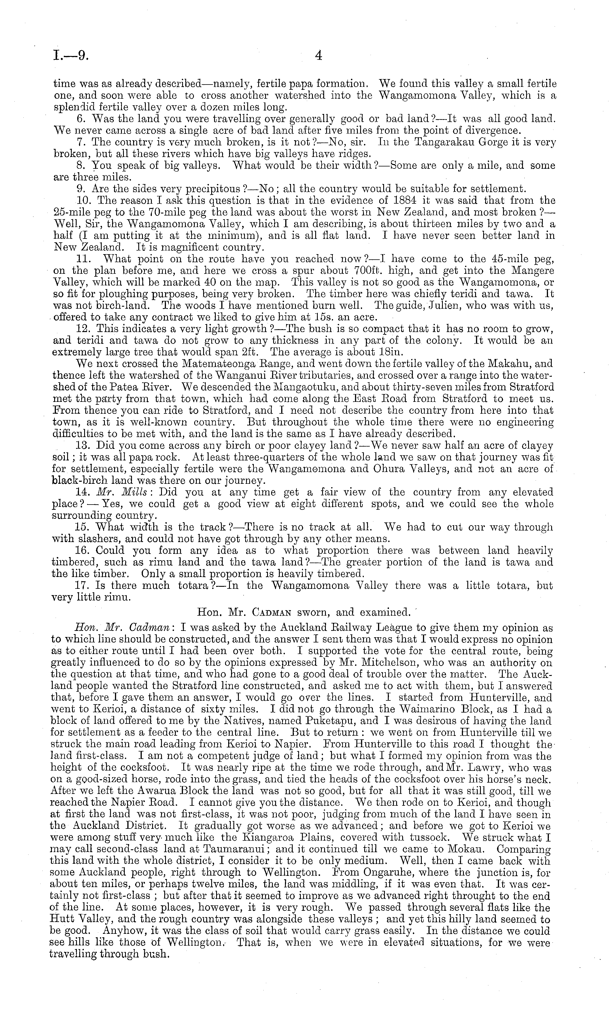 time was as already described —namely, fertile papa formation. We found this valley a small fertile one, and soon were able to cross another watershed into the Wangamomona Valley, which is a splendid fertile valley over a dozen miles long. 6. Was the land you were travelling over generally good or bad land?—lt was all good land. We never came across a single acre of bad land after five miles from the point of divergence. 7. The country is very much broken, is it not?—No, sir. In the Tangarakau Gorge it is very broken, but all these rivers which have big valleys have ridges. 8. You speak of big valleys. What would be their width ? —Some are only a mile, and some are three miles. 9. Are the sides very precipitous ?—No ; all the country would be suitable for settlement. 10. The reason I ask this question is that in the evidence of 1884 it was said that from the 25-mile peg to the 70-mile peg the land was about the worst in New Zealand, and most broken ?— Well, Sir, the Wangamomona Valley, which I am describing, is about thirteen miles by two and a half (I am putting it at the minimum), and is all flat land. I have never seen better land in New Zealand. It is magnificent country. 11. What point on the route have you reached now?—l have come to the 45-mile peg, on the plan before me, and here we cross a spur about 700 ft. high, and get into the Mangere Valley, which will be marked 40 on the map. This valley is not so good as the Wangamomona, or so fit for ploughing purposes, being very broken. The timber here was chiefly teridi and tawa. It was not birch-lanrl. The woods I have mentioned burn well. The guide, Julien, who was with us, offered to take any contract we liked to give him at 15s. an acre. 12. This indicates a very light growth ? —The bush is so compact that it has no room to grow, and teridi and tawa do not grow to any thickness in any part of the colony. It would be an extremely large tree that would span 2ft. The average is about 18in. We next crossed the Matemateonga Bange, and went down the fertile valley of the Makahu, and thence left the watershed of the Wanganui Eiver tributaries, and crossed over a range into the watershed of the Patea Biver. We descended the Mangaotuku, and about thirty-seven miles from Stratford met the party from that town, which had come along the East Boad from Stratford to meet us. Prom thence you can ride to Stratford, and I need not describe the country from here into that town, as it is well-known country. But throughout the whole time there were no engineering difficulties to be met with, and the land is the same as I have already described. 13. Did you come across any birch or poor clayey land ?—We never saw half an acre of clayey soil; it was all papa rock. At least three-quarters of the whole land we saw on that journey was fit for settlement, especially fertile were the Wangamomona and Ohura Valleys, and not an acre of black-birch land was there on our journey. 14. Mr. Mills : Did you at any time get a fair view of the country from any elevated place ? — Yes, we could get a good view at eight different spots, and we could see the whole surrounding country. 15. What width is the track ?—There is no track at all. We had to cut our way through with slashers, and could not have got through by any other means. 16. Could you form any idea as to what proportion there was between land heavily timbered, such as rimu land and the tawa land?— The greater portion of the land is tawa and the like timber. Only a small proportion is heavily timbered. 17. Is there much totara ?—ln the Wangamomona Valley there was a little totara, but very little rimu. Hon. Mr. Cadman sworn, and examined. Hon. Mr. Cadman: I was asked by the Auckland Eailway League to give them my opinion as to which line should be constructed, and the answer I sent them was that I would express no opinion as to either route until I had been over both. I supported the vote for the central route, being greatly influenced to do so by the opinions expressed by Mr. Mitchelson, who was an authority on the question at that time, and who had gone to a good deal of trouble over the matter. The Auckland people wanted the Stratford line constructed, and asked me to act with them, but I answered that, before I gave them an answer, I would go over the lines. I started from Hunterville, and went to Kerioi, a distance of sixty miles. I did not go through the Waimarino Block, as I had a block of land offered to me by the Natives, named Puketapu, and I was desirous of having the land for settlement as a feeder to the central line. But to return :we went on from Hunterville till we struck the main road leading from Kerioi to Napier. Prom Hunterville to this road I thought the land first-class. lam not a competent judge of land ; but what I formed my opinion from was the height of the cocksfoot. It was nearly ripe at the time we rode through, and Mr. La wry, who was on a good-sized horse, rode into the grass, and tied the heads of the cocksfoot over his horse's neck. After we left the Awarua Block the land was not so good, but for all that it was still good, till we reached the Napier Eoad. I cannot give you the distance. We then rode on to Kerioi, and though at first the land was not first-class, it was not poor, judging from much of the land I have seen in the Auckland District. It gradually got worse as we advanced; and before we got to Kerioi we were among stuff very much like the Kiangaroa Plains, covered with tussock. We struck what I may call second-class land at Taumaranui; and it continued till we came to Mokau. Comparing this land with the whole district, I consider it to be only medium. Well, then I came back with some Auckland people, right through to Wellington. Prom Ongaruhe, where the junction is, for about ten miles, or perhaps twelve miles, the land was middling, if it was even that. It was certainly not first-class ; but after that it seemed to improve as we advanced r