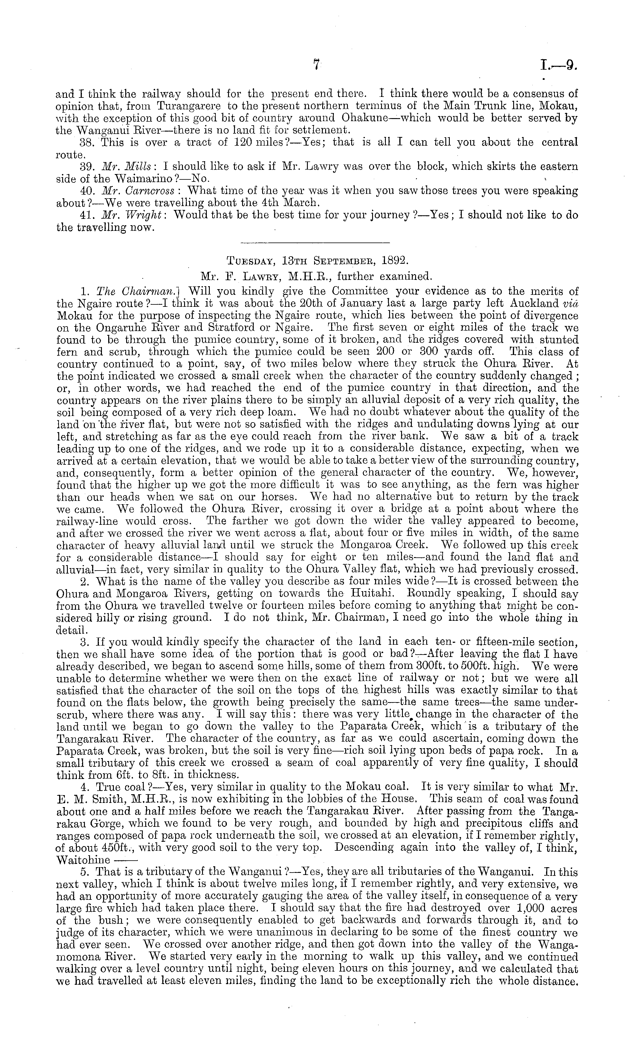 Tuesday, 13th Septembee, 1892. Mr. F. Lawey, M.H.E., further examined. 1. The Chairman.] Will you kindly give the Committee your evidence as to the merits of the Ngaire route ? —I think it was about the 20th of January last a large party left Auckland via Mokau for the purpose of inspecting the Ngaire route, which lies between the point of divergence on the Ongaruhe Biver and Stratford or Ngaire. The first seven or eight miles of the track we found to be through the pumice country, some of it broken, and the ridges covered with stunted fern and scrub, through which the pumice could be seen 200 or 300 yards off. This class of country continued to a point, say, of two miles below where they struck the Ohura Biver. At the point indicated we crossed a small creek when the character of the country suddenly changed ; or, in other words, we had reached the end of the pumice country in that direction, and the country appears on the river plains there to be simply an alluvial deposit of a very rich quality, the soil being composed of a very rich deep loam. We had no doubt whatever about the quality of the land on 'the river flat, but were not so satisfied with the ridges and undulating downs lying at our left, and stretching as far as the eye could reach from the river bank. We saw a bit of a track leading up to one of the ridges, and we rode up it to a considerable distance, expecting, when we arrived at a certain elevation, that we would be able to take a better view of the surrounding country, and, consequently, form a better opinion of the general character of the country. We, however, found that the higher up we got the more difficult it was to see anything, as the fern was higher than our heads when we sat on our horses. We had no alternative but to return by the track we came. We followed the Ohura Eiver, crossing it over a bridge at a point about where the railway-line would cross. The farther we got down the wider the valley appeared to become, and after we crossed the river we went across a flat, about four or five miles in width, of the same character of heavy alluvial land until we struck the Mongaroa Creek. We followed up this creek for a considerable distance —I should say for eight or ten miles—and found the land flat and alluvial —in fact, very similar in quality to the Ohura Valley flat, which we had previously crossed. 2. What is the name of the valley you describe as four miles wide?—lt is crossed between the Ohura and Mongaroa Bivers, getting on towards the Huitahi. Eoundly speaking, I should say from the Ohura we travelled twelve or fourteen miles before coming to anything that might be considered hilly or rising ground. Ido not think, Mr. Chairman, I need go into the whole thing in detail. 3. If you would kindly specify the character of the land in each ten- or fifteen-mile section, then we shall have some idea of the portion that is good or bad ?—After leaving the flat I have already described, we began to ascend some hills, some of them from 300 ft. to 500 ft. high. We were unable to determine whether we were then on the exact line of railway or not; but we were all satisfied that the character of the soil on the tops of the highest hills was exactly similar to that found on the flats below, the growth being precisely the same —the same trees—the same underscrub, where there was any. I will say this : there was very change in the character of the land until we began to go down the valley to the Paparata Creek, which is a tributary of the Tangarakau Eiver. The character of the country, as far as we could ascertain, coining down the Paparata Creek, was broken, but the soil is very fine —rich soil lying upon beds of papa rock. In a small tributary of this creek we crossed a seam of coal apparently of very fine quality, I should think from 6ft. to Bft. in thickness. 4. True coal ?—Yes, very similar in quality to the Mokau coal. It is very similar to what Mr. E. M. Smith, M.H.E., is now exhibiting in the lobbies of the House. This seam of coal was found about one and a half miles before we reach the Tangarakau Eiver. After passing from the Tangarakau Gorge, which we found to be very rough, and bounded by high and precipitous cliffs and ranges composed of papa rock underneath the soil, we crossed at an elevation, if I remember rightly, of about 450 ft., with very good soil to the very top. Descending again into the valley of, I think, Waitohine 5. That is a tributary of the Wanganui ? —Yes, they are all tributaries of the Wanganui. In this next valley, which I think is about twelve miles long, if I remember rightly, and very extensive, we had an opportunity of more accurately gauging the area of the valley itself, in consequence of a very large fire which had taken place there. I should say that the fire had destroyed over 1,000 acres of the bush; we were consequently enabled to get backwards and forwards through it, and to judge of its character, which we were unanimous in declaring to bo some of the finest country we had ever seen. We crossed over another ridge, and then got down into the valley of the Wangamomona Eiver. We started very early in the morning to walk up this valley, and we continued walking over a level country until night, being eleven hours on this journey, and we calculated that we had travelled at least eleven miles, finding the land to be exceptionally rich the whole distance.