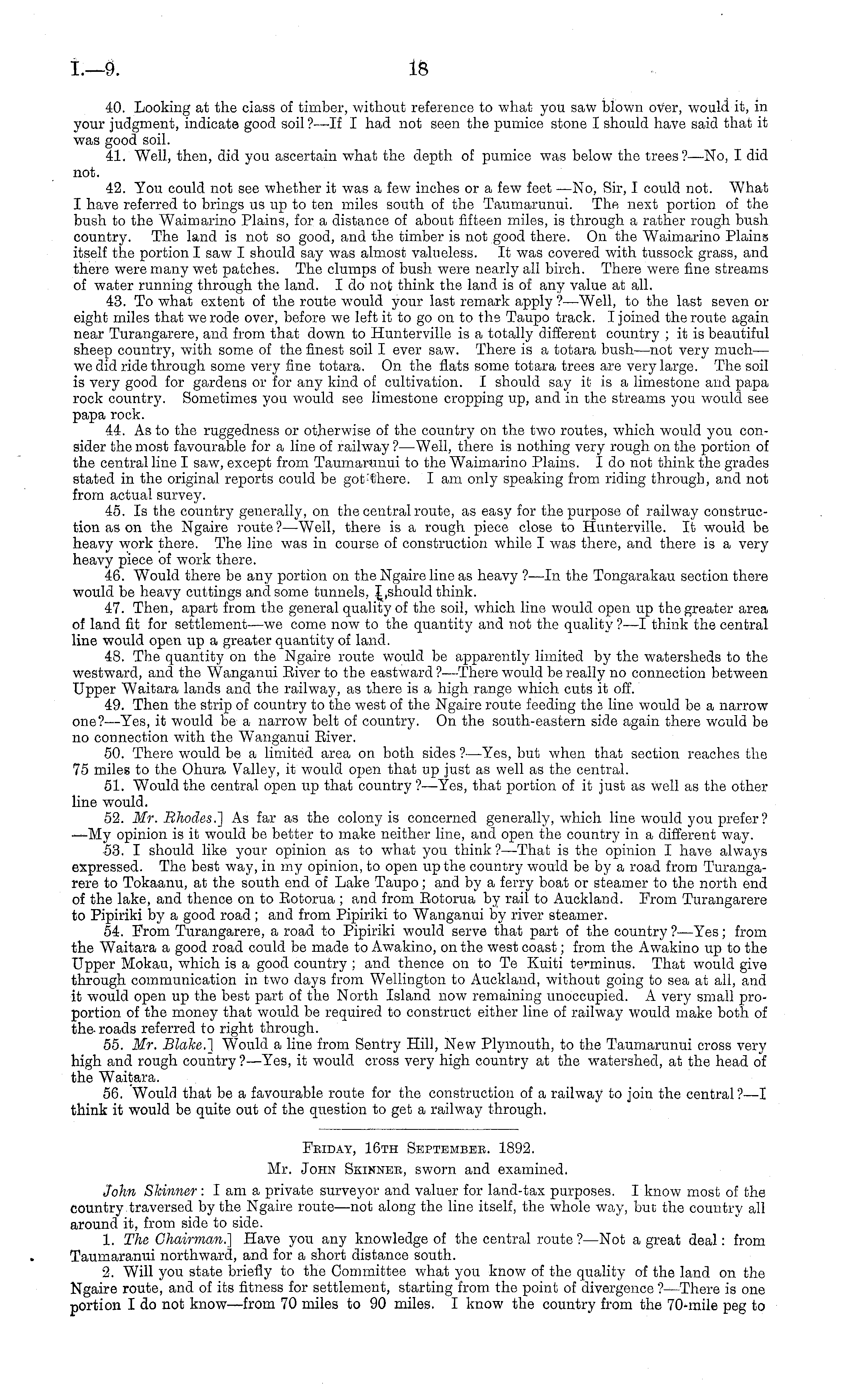 Feiday, 16th Septembee. 1892. Mr. John Skinnee, sworn and examined. John Skinner: lam a private surveyor and valuer for land-tax purposes. I know most of the country traversed by the Ngaire route—not along the line itself, the whole way, but the country all around it, from side to side. 1. The Chairman.] Have you any knowledge of the central route ?—Not a great deal: from Taumaranui northward, and for a short distance south. 2. Will you state briefly to the Committee what you know of the quality of the land on the Ngaire route, and of its fitness for settlement, starting from the point of divergence ?—There is one portion Ido not know—from 70 miles to 90 miles. I know the country from the 70-mile peg to