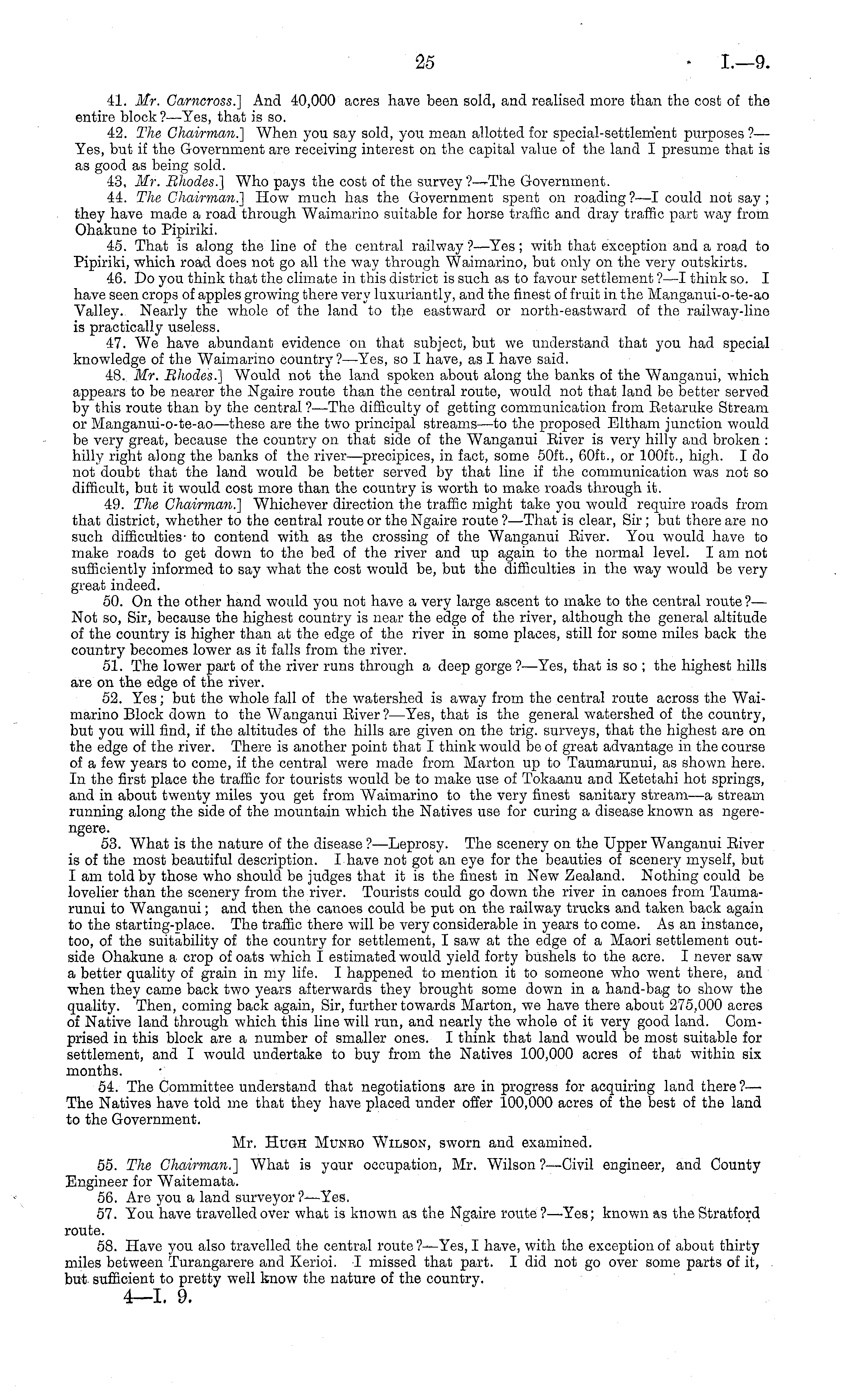 41. Mr. Carncross.] And 40,000 acres have been sold, and realised more than the cost of the entire block ?—Yes, that is so. 42. The Chairman.] When you say sold, you mean allotted for special-settlement purposes ?— Yes, but if the Government are receiving interest on the capital value of the land I presume that is as good as being sold. 43. Mr. Bhodes.] Who pays the cost of the survey ?—The Government. 44. The Chairman.] How much has the Government spent on roading ?—I could not say ; they have made a road through Waimarino suitable for horse traffic and dray traffic part way from Ohakune to Pipiriki. 45. That is along the line of the central railway'?-—Yes; with that exception and a road to Pipiriki, which road does not go all the way through Waimarino, but only on the very outskirts. 46. Do you think that the climate in this district is such as to favour settlement ? —I think so. I have seen crops of apples growing there very luxuriantly, and the finest of fruit in the Manganui-o-te-ao Valley. Nearly the whole of the land to the eastward or north-eastward of the railway-line is practically useless. 47. We have abundant evidence on that subject, but we understand that you had special knowledge of the Waimarino country?— Yes, so I have, as I have said. 48. Mr. Bhodes.] Would not the land spoken about along the banks of the Wanganui, which appears to be nearer the Ngaire route than the central route, would not that land be better served by this route than by the central ?—The difficulty of getting communication from Eetaruke Stream or Manganui-o-te-ao—these are the two principal streams —to the proposed Eltharn junction would be very great, because the country on that side of the Wanganui Biver is very hilly and broken : hilly right along the banks of the river—precipices, in fact, some 50ft., 60ft., or 100 ft., high. Ido not doubt that the land would be better served by that line if the communication was not so difficult, but it would cost more than the country is worth to make roads through it. 49. The Chairman.] Whichever direction the traffic might take you would require roads from that district, whether to the central route or the Ngaire route ?—That is clear, Sir; but there are no such difficulties- to contend with as the crossing of the Wanganui Biver. You would have to make roads to get down to the bed of the river and up again to the normal level. lam not sufficiently informed to say what the cost would be, but the difficulties in the way would be very great indeed. 50. On the other hand would you not have a very large ascent to make to the central route ?— Not so, Sir, because the highest country is near the edge of the river, although the general altitude of the country is higher than at the edge of the river in some places, still for some miles back the country becomes lower as it falls from the river. 51. The lower part of the river runs through a deep gorge ? —Yes, that is so ; the highest hills are on the edge of the river. 52. Yes; but the whole fall of the watershed is away from the central route across the Waimarino Block down to the Wanganui Biver ? —Yes, that is the general watershed of the country, but you will find, if the altitudes of the hills are given on the trig, surveys, that the highest are on the edge of the river. There is another point that I think would be of great advantage in the course of a few years to come, if the central were made from Marton up to Taumarunui, as shown here. In the first place the traffic for tourists would be to make use of Tokaanu and Ketetahi hot springs, and in about twenty miles you get from Waimarino to the very finest sanitary stream—a stream running along the side of the mountain which the Natives use for curing a disease known as ngerengere. 53. What is the nature of the disease ?—Leprosy. The scenery on the Upper Wanganui Biver is of the most beautiful description. I have not got an eye for the beauties of scenery myself, but lam told by those who should be judges that it is the finest in New Zealand. Nothing could be lovelier than the scenery from the river. Tourists could go down the river in canoes from Taumarunui to Wanganui; and then the canoes could be put on the railway trucks and taken back again to the starting-place. The traffic there will be very considerable in years to come. As an instance, too, of the suitability of the country for settlement, I saw at the edge of a Maori settlement outside Ohakune a crop of oats which I estimated would yield forty bushels to the acre. I never saw a better quality of grain in my life. I happened to mention it to someone who went there, and when they came back two years afterwards they brought some down in a hand-bag to show the quality. Then, coming back again, Sir, further towards Marton, we have there about 275,000 acres of Native land through which this line will run, and nearly the whole of it very good land. Comprised in this block are a number of smaller ones. I think that land would be most suitable for settlement, and I would undertake to buy from the Natives 100,000 acres of that within six months. 54. The Committee understand that negotiations are in progress for acquiring land there ?— The Natives have told me that they have placed under offer 100,000 acres of the best of the land to the Government. Mr. Hugh Muneo Wilson, sworn and examined. 55. The Chairman.] What is your occupation, Mr. Wilson ? —Civil engineer, and County Engineer for Waitemata. 56. Are you a land surveyor ?—Yes. 57. You have travelled over what is known as the Ngaire route ?—Yes; known as the Stratford route. 58. Have you also travelled the central route ?—Yes, I have, with the exception of about thirty miles between Turangarere and Kerioi. I missed that part. I did not go over some parts of it, but sufficient to pretty well know the nature of the country.