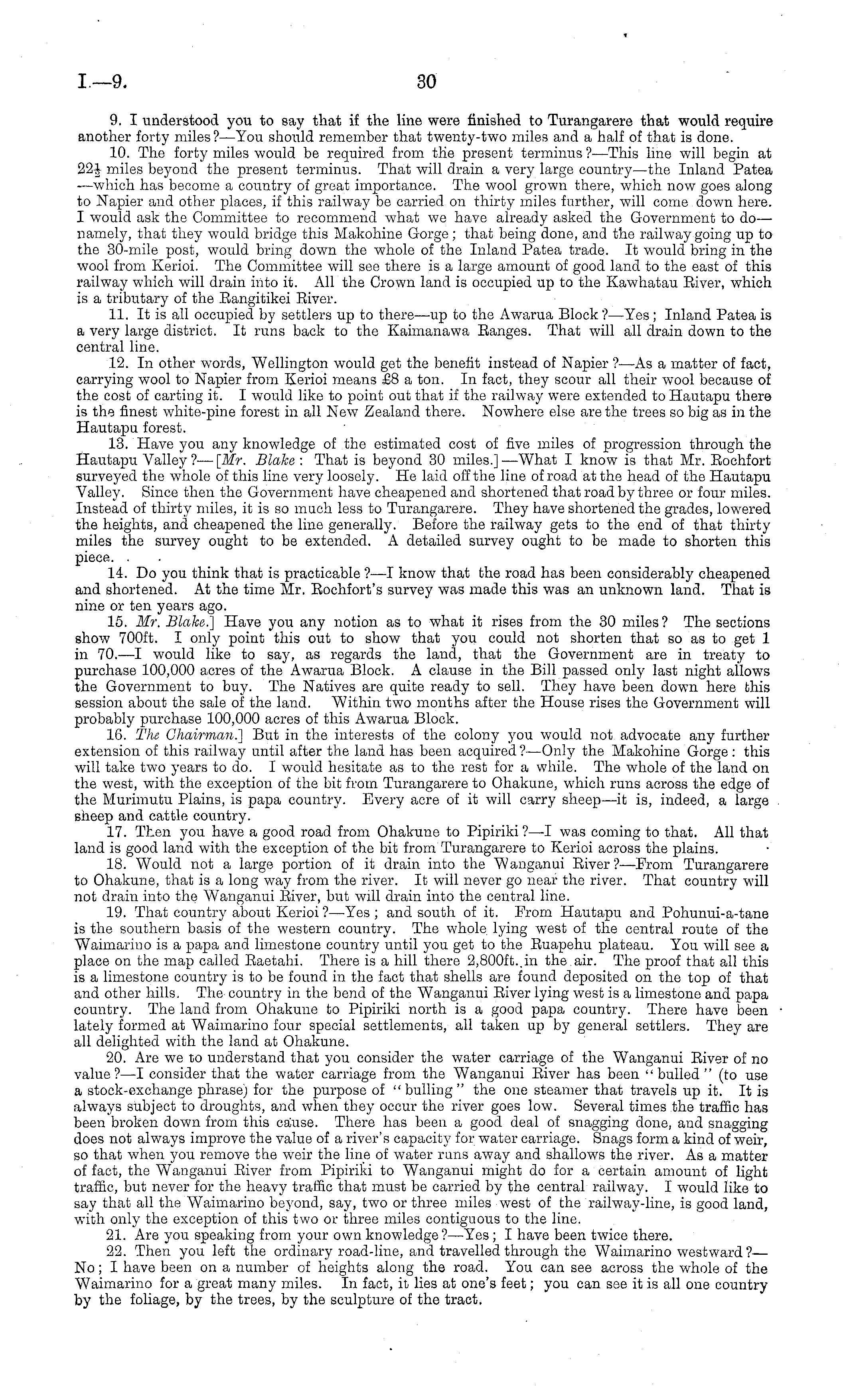 9. I understood you to say that if the line were finished to Turangarere that would require another forty miles?— You should remember that twenty-two miles and a half of that is done. 10. The forty miles would be required from the present terminus ?—This line will begin at miles beyond the present terminus. That will drain a very large country —the Inland Patea —which has become a country of great importance. The wool grown there, which now goes along to Napier and other places, if this railway be carried on thirty miles further, will come down here. I would ask the Committee to recommend what we have already asked the Government to do— namely, that they would bridge this Makohine Gorge; that being done, and the railway going up to the 30-mile post, would bring down the whole of the Inland Patea trade. It would bring in the wool from Kerioi. The Committee will see there is a large amount of good land to the east of this railway which will drain into it. All the Crown land is occupied up to the Kawhatau Eiver, which is a tributary of the Eangitikei Biver. 11. It is all occupied by settlers up to there—up to the Awarua Block ?—Yes; Inland Patea is a very large district. It runs back to the Kaimanawa Banges. That will all drain down to the central line. 12. In other words, Wellington would get the benefit instead of Napier ? —As a matter of fact, carrying wool to Napier from Kerioi means £8 a ton. In fact, they scour all their wool because of the cost of carting it. I would like to point out that if the railway were extended to Hautapu there is the finest white-pine forest in all New Zealand there. Nowhere else are the trees so big as in the Hautapu forest. 13. Have you any knowledge of the estimated cost of five miles of progression through the Hautapu Valley ?— [Mr. Blake : That is beyond 30 miles.] —What I know is that Mr. Eochfort surveyed the whole of this line very loosely. He laid off the line of road at the head of the Hautapu Valley. Since then the Government have cheapened and shortened that road by three or four miles. Instead of thirty miles, it is so much less to Turangarere. They have shortened the grades, lowered the heights, and cheapened the line generally. Before the railway gets to the end of that thirty miles the survey ought to be extended. A detailed survey ought to be made to shorten this piece. . 14. Do you think that is practicable ? —I know that the road has been considerably cheapened and shortened. At the time Mr. Bochfort's survey was made this was an unknown land. That is nine or ten years ago. 15. Mr. Blake.] Have you any notion as to what it rises from the 30 miles? The sections show 700 ft. I only point this out to show that you could not shorten that so as to get 1 in 70.—1 would like to say, as regards the land, that the Government are in treaty to purchase 100,000 acres of the Awarua Block. A clause in the Bill passed only last night allows the Government to buy. The Natives are quite ready to sell. They have been down here this session about the sale of the land. Within two months after the House rises the Government will probably purchase 100,000 acres of this Awarua Block. 16. The Chairman.] But in the interests of the colony you would not advocate any further extension of this railway until after the land has been acquired ? —Only the Makohine Gorge : this will take two years to do. I would hesitate as to the rest for a while. The whole of the land on the west, with the exception of the bit from Turangarere to Ohakune, which runs across the edge of the Murimutu Plains, is papa country. Every acre of it will carry sheep—it is, indeed, a large sheep and cattle country. 17. Then you have a good road from Ohakune to Pipiriki ?—I was coming to that. All that land is good land with the exception of the bit from Turangarere to Kerioi across the plains. 18. Would not a large portion of it drain into the Wanganui Biver? —From Turangarere to Ohakune, that is a long way from the river. It will never go near the river. That country will not drain into the W'anganui Biver, but will drain into the central line. 19. That country about Kerioi ?—Yes ; and south of it. From Hautapu and Pohunui-a-tane is the southern basis of the western country. The whole lying west of the central route of the Waimarino is a papa and limestone country until you get to the Buapehu plateau. You will see a place on the map called Baetahi. There is a hill there 2,800 ft..in the air. The proof that all this is a limestone country is to be found in the fact that shells are found deposited on the top of that and other hills. The country in the bend of the Wanganui Eiver lying west is a limestone and papa country. The land from Ohakune to Pipiriki north is a good papa country. There have been lately formed at Waimarino four special settlements, all taken up by general settlers. They are all delighted with the land at Ohakune. 20. Are we to understand that you consider the water carriage of the Wanganui Eiver of no value? —I consider that the water carriage from the Wanganui Eiver has been "bulled " (to use a stock-exchange phrasej for the purpose of " bulling " the one steamer that travels up it. It is always subject to droughts, and when they occur the river goes low. Several times the traffic has been broken down from this cause. There has been a good deal of snagging done, and snagging does not always improve the value of a river's capacity for water carriage. Snags form a kind of weir, so that when you remove the weir the line of water runs away and shallows the river. As a matter of fact, the Wanganui Biver from Pipiriki to Wanganui might do for a certain amount of light traffic, but never for the heavy traffic that must be carried by the central railway. I would like to say that all the Waimarino beyond, say, two or three miles west of the railway-line, is good land, with only the exception of this two or three miles contiguous to the line. 21. Are yo