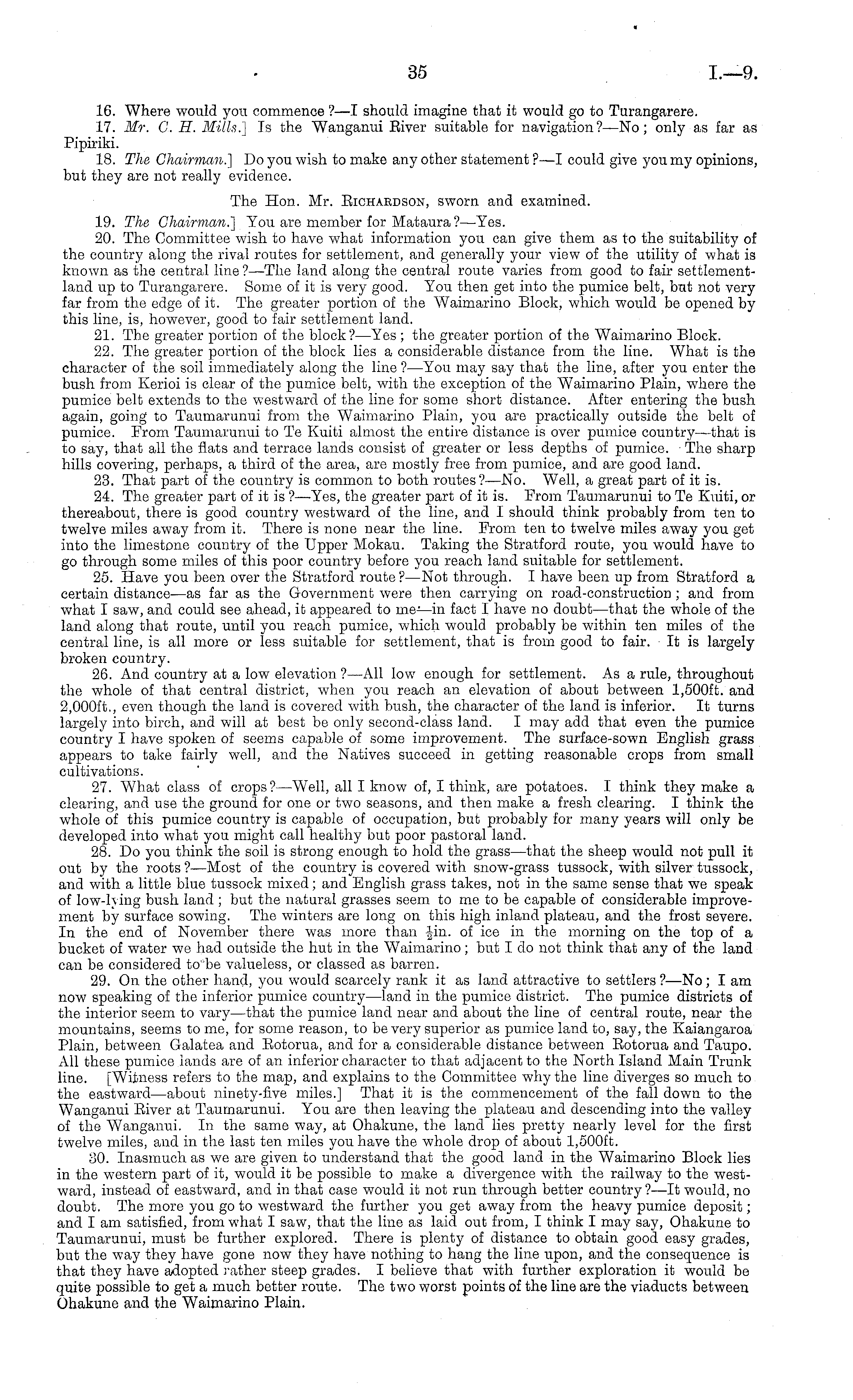 16. Where would you commence ?—I should imagine that it would go to Turangarere. 17. Mr. C. H. Mills.] Is the Wanganui Biver suitable for navigation?—No; only as far as Pipiriki. 18. The Chairman.] Do you wish to make any other statement ?—I could give you my opinions, but they are not really evidence. The Hon. Mr. Bichaedson, sworn and examined. 19. The Chairman.] You are member for Mataura ?—Yes. 20. The Committee wish to have what information you can give them as to the suitability of the country along the rival routes for settlement, and generally your view of the utility of what is known as the central line ? —The land along the central route varies from good to fair settlementland up to Turangarere. Some of it is very good. You then get into the pumice belt, but not very far from the edge of it. The greater portion of the Waimarino Block, which would be opened by this line, is, however, good to fair settlement land. 21. The greater portion of the block?— Yes ; the greater portion of the Waimarino Block. 22. The greater portion of the block lies a considerable distance from the line. What is the character of the soil immediately along the line ? —You may say that the line, after you enter the bush from Kerioi is clear of the pumice belt, with the exception of the Waimarino Plain, where the pumice belt extends to the westward of the line for some short distance. After entering the bush again, going to Taumarunui from the Waimarino Plain, you are practically outside the belt of pumice. From Taumarunui to Te Kuiti almost the entire distance is over pumice country—that is to say, that all the flats and terrace lands consist of greater or less depths of pumice. The sharp hills covering, perhaps, a third of the area, are mostly free from pumice, and are good land. 23. That part of the country is common to both routes?— No. Well, a great part of it is. 24. The greater part of it is ?—Yes, the greater part of it is. From Taumarunui to Te Kuiti, or thereabout, there is good country westward of the line, and I should think probably from ten to twelve miles away from it. There is none near the line. From ten to twelve miles away you get into the limestone country of the Upper Mokau. Taking the Stratford route, you would have to go through some miles of this poor country before you reach land suitable for settlement. 25. Have you been over the Stratford route? —Not through. I have been up from Stratford a certain distance—as far as the Government were then carrying on road-construction ; and from what I saw, and could see ahead, it appeared to nic—in fact I have no doubt—that the whole of the land along that route, until you reach pumice, which would probably be within ten miles of the central line, is all more or less suitable for settlement, that is from good to fair. It is largely broken country. 26. And country at a low elevation ? —All low enough for settlement. As a rule, throughout the whole of that central district, when you reach an elevation of about between 1,500 ft. and 2,000 ft., even though the land is covered with bush, the character of the land is inferior. It turns largely into birch, and will at best be only second-class land. I may add that even the pumice country I have spoken of seems capable of some improvement. The surface-sown English grass appears to take fairly well, and the Natives succeed in getting reasonable crops from small cultivations. 27. What class of crops?— Well, all I know of, I think, are potatoes. I think they make a clearing, and use the ground for one or two seasons, and then make a fresh clearing. I think the whole of this pumice country is capable of occupation, but probably for many years will only be developed into what you might call healthy but poor pastoral land. 28. Do you think the soil is strong enough to hold the grass—that the sheep would not pull it out by the roots ?—Most of the country is covered with snow-grass tussock, with silver tussock, and with a little blue tussock mixed; and English grass takes, not in the same sense that we speak of low-lying bush land ; but the natural grasses seem to me to be capable of considerable improvement by surface sowing. The winters are long on this high inland plateau, and the frost severe. In the end of November there was more than Jin. of ice in the morning on the top of a bucket of water we had outside the hut in the Waimarino; but Ido not think that any of the land can be considered to be valueless, or classed as barren. 29. On the other hand, you would scarcely rank it as land attractive to settlers ? —No ; I am now speaking of the inferior pumice country —land in the pumice district. The pumice districts of the interior seem to vary—that the pumice land near and about the line of central route, near the mountains, seems to me, for some reason, to be very superior as pumice land to, say, the Kaiangaroa Plain, between Galatea and Botorua, and for a considerable distance between Botorua and Taupo. All these pumice lands are of an inferior character to that adjacent to the North Island Main Trunk line. [Witness refers to the map, and explains to the Committee why the line diverges so much to the eastward—about ninety-five miles.] That it is the commencement of the fall down to the Wanganui Eiver at Taumarunui. You are then leaving the plateau and descending into the valley of the Wanganui. In the same way, at Ohakune, the land lies pretty nearly level for the first twelve miles, and in the last ten miles you have the whole drop of about 1,500 ft. 30. Inasmuch as we are given to understand that the good land in the Waimarino Block lies in the western part of it, would it be possible to make a divergence with the railway to the westward, instead of eastward, and in that case would it not run through better country ?—lt would, no doubt. The more you go to westward the further you get away from the heavy pumice deposit; and I am satisfied, from what I saw, t