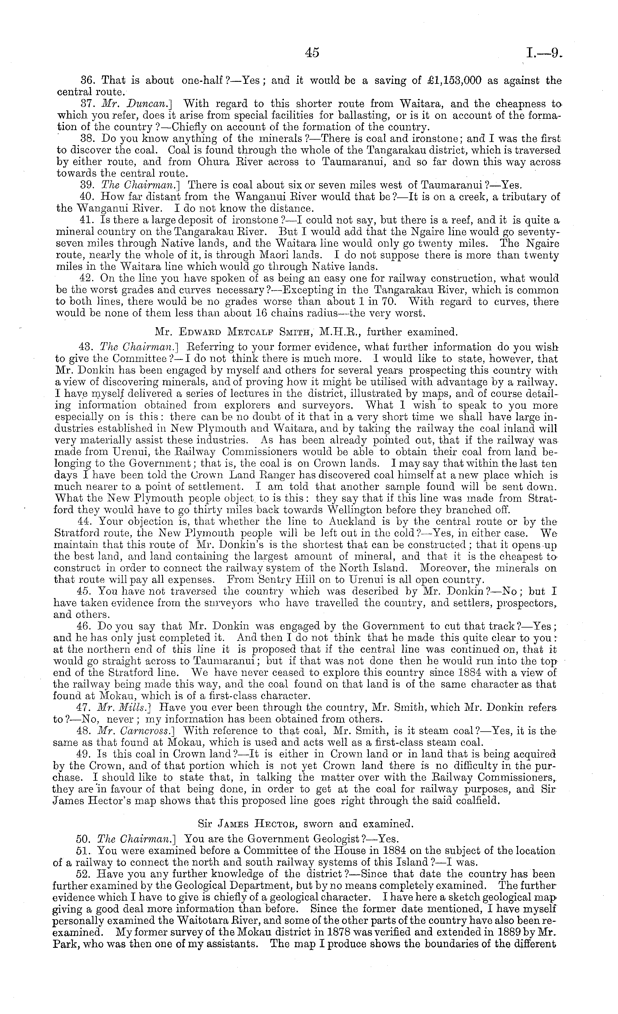 36. That is about one-half?— Yes; and it would be a saving of £1,153,000 as against the central route. 37. Mr. Duncan.] With regard to this shorter route from Waitara, and the cheapness to which you refer, does it arise from special facilities for ballasting, or is it on account of the formation of the country ?—Chiefly on account of the formation of the country. 38. Do you know anything of the minerals ?—There is coal and ironstone; and I was the first to discover the coal. Coal is found through the whole of the Tangarakau district, which is traversed by either route, and from Ohura Eiver across to Taumaranui, and so far down this way across towards the central route. 39. The Chairman.] There is coal about six or seven miles west of Taumaranui ?—Yes. 40. How far distant from the Wanganui Biver would that be ?—lt is on a creek, a tributary of the Wanganui Biver. Ido not know the distance. 41. Is there a large deposit of ironstone ?—I could not say, but there is a reef, and it is quite a mineral country on the Tangarakau Biver. But I would add that the Ngaire line would go seventyseven miles through Native lands, and the Waitara line would only go twenty miles. The Ngaire route, nearly the whole of it, is through Maori lands. Ido not suppose there is more than twenty miles in the Waitara line which would go through Native lands. 42. On the line you have spoken of as being an easy one for railway construction, what would be the worst grades and curves necessary? —Excepting in the Tangarakau Eiver, which is common to both lines, there would be no grades worse than about lin 70. With regard to curves, there would be none of them less than about 16 chains radius—the very worst. Mr. Edwaed Metcalp Smith, M.H.8., further examined. 43. The Chairman.] Beferring to your former evidence, what further information do you wish to give the Committee?—l do not think there is much more. 1 would like to state, however, that Mr. Donkin has been engaged by myself and others for several years prospecting this country with a view of discovering minerals, and of proving how it might be utilised with advantage by a railway. I have myself delivered a series of lectures in the district, illustrated by maps, and of course detailing information obtained from explorers and surveyors. What 1 wish to speak to you more especially on is this: there can be no doubt of it that in a very short time we shall have large industries established in New Plymouth and Waitara, and by taking the railway the coal inland will very materially assist these industries. As has been already pointed out, that if the railway was made from Urenui, the Eailway Commissioners would be able to obtain their coal from land belonging to the Government; that is, the coal is on Crown lands. I may say that within the last ten days I have been told the Grown Land Banger has discovered coal himself at a new place which is much nearer to a point of settlement. I am told that another sample found will be sent down. What the New Plymouth people object, to is this: they say that if this line was made from Stratford they would have to go thirty miles back towards Wellington before they branched off. 44. Your objection is, that whether the line to Auckland is by the central route or by the Stratford route, the New Plymouth people will be left out in the cold?— Yes, in either case. We maintain that this route of Mr. Donkin's is the shortest that can be constructed ; that it opens up the best land, and land containing the largest amount of mineral, and that it is the cheapest toconstruct in order to connect the railway system of the North Island. Moreover, the minerals on that route will pay all expenses. From Sentry Hill on to Urenui is all open country. 45. You have not traversed the country which was described by Mr. Donkin?—No; but I have taken evidence from the surveyors who have travelled the country, and settlers, prospectors, and others. 46. Do you say that Mr. Donkin was engaged by the Government to cut that track ?—Yes; and he has only just completed it. And then Ido not think that he made this quite clear to you : at the northern end of this line it is proposed that if the central line was continued on, that it would go straight across to Taumaranui; but if that was not done then he would run into the top end of the Stratford line. We have never ceased to explore this country since 1884 with a view of the railway being made this way, and the coal found on that land is of the same character as that found at Mokau, which is of a first-class character. 47. Mr. Mills.] Have you ever been through the country, Mr. Smith, which Mr. Donkin refers to ?—No, never ; my information has been obtained from others. 48. Mr. Camcross.] With reference to that coal, Mr. Smith, is it steam coal? —Yes, it is the same as that found at Mokau, which is used and acts well as a first-class steam coal. 49. Is this coal in Crown land ?—lt is either in Crown land or in land that is being acquired by the Crown, and of that portion which is not yet Crown land there is no difficulty in the purchase. I should like to state that, in talking the matter over with the Eailway Commissioners,, they are in favour of that being done, in order to get at the coal for railway purposes, and Sir James Hector's map shows that this proposed line goes right through the said coalfield. Sir James Hectoe, sworn and examined. 50. The Chairman.] You are the Government Geologist ?—Yes. 51. You were examined before a Committee of the House in 1884 on the subject of the location of a railway to connect the north and south railway systems of this Island ?—I was. 52. Have you any further knowledge of the district ? —Since that date the country has been further examined by the Geological Department, but by no means completely examined. The further evidence which I have to give is chiefly of a geological character. I have here a sketch geological mapgiving a good deal more 