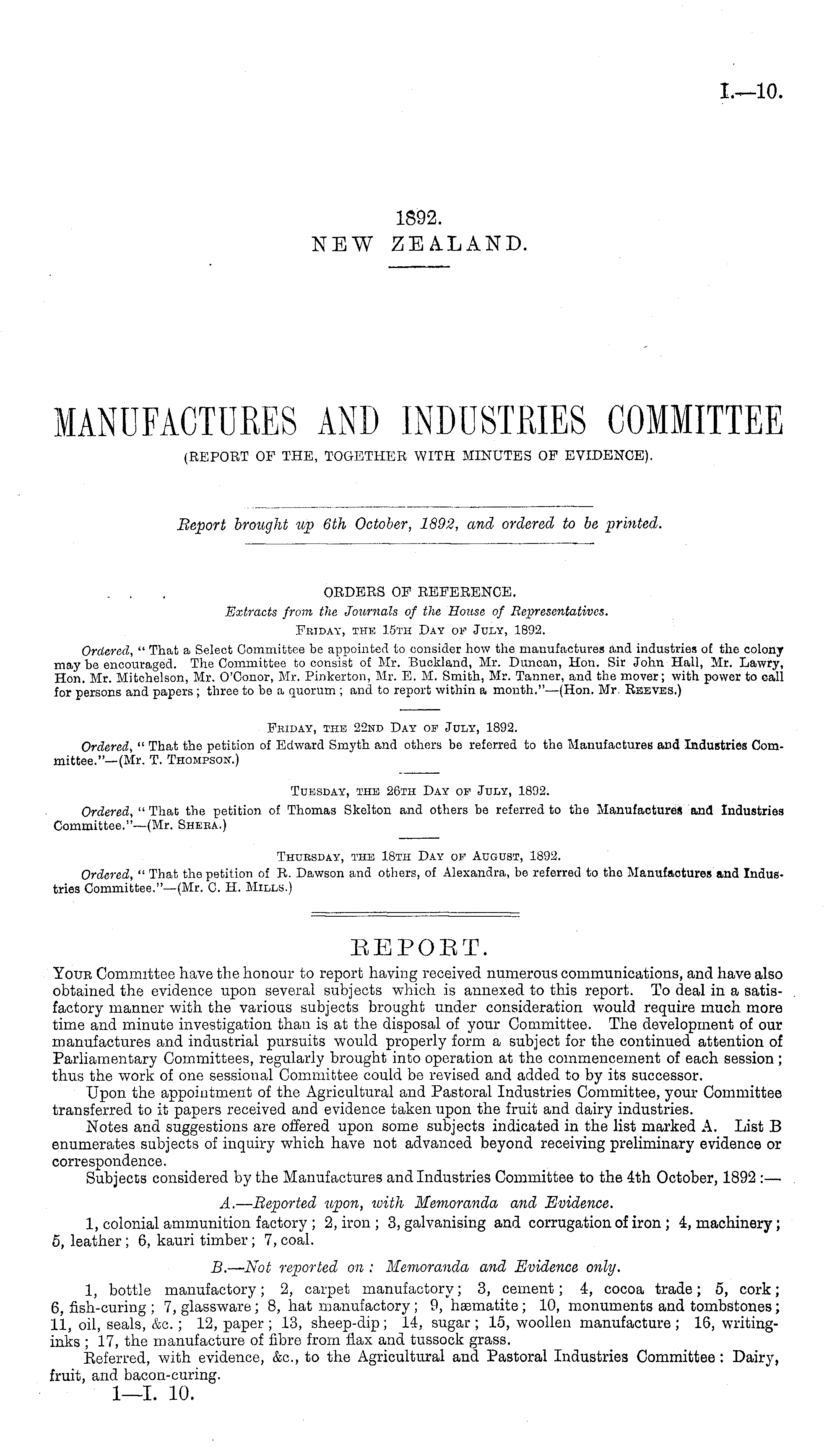 Report brought up 6th October, 1892, and ordered to be printed. OEDERS OF REFERENCE. Extracts from the Journals of the House of Representatives. Fkiday, the 15th Day of July, 1892. Ordered, " That a Select Committee be appointed to consider how the manufactures and industries of the colony may be encouraged. The Committee to consist of Mr. Buckland, Mr. Duncan, Hon. Sir John Hall, Mr. Lawry, Hon. Mr. Mitchelson, Mr. O'Conor, Mr. Pinkerton, Mr. E. M. Smith, Mr. Tanner, and the mover; with power to call for persons and papers ; three to be a quorum ; and to report within a month." —(Hon. Mr. Reeves.)