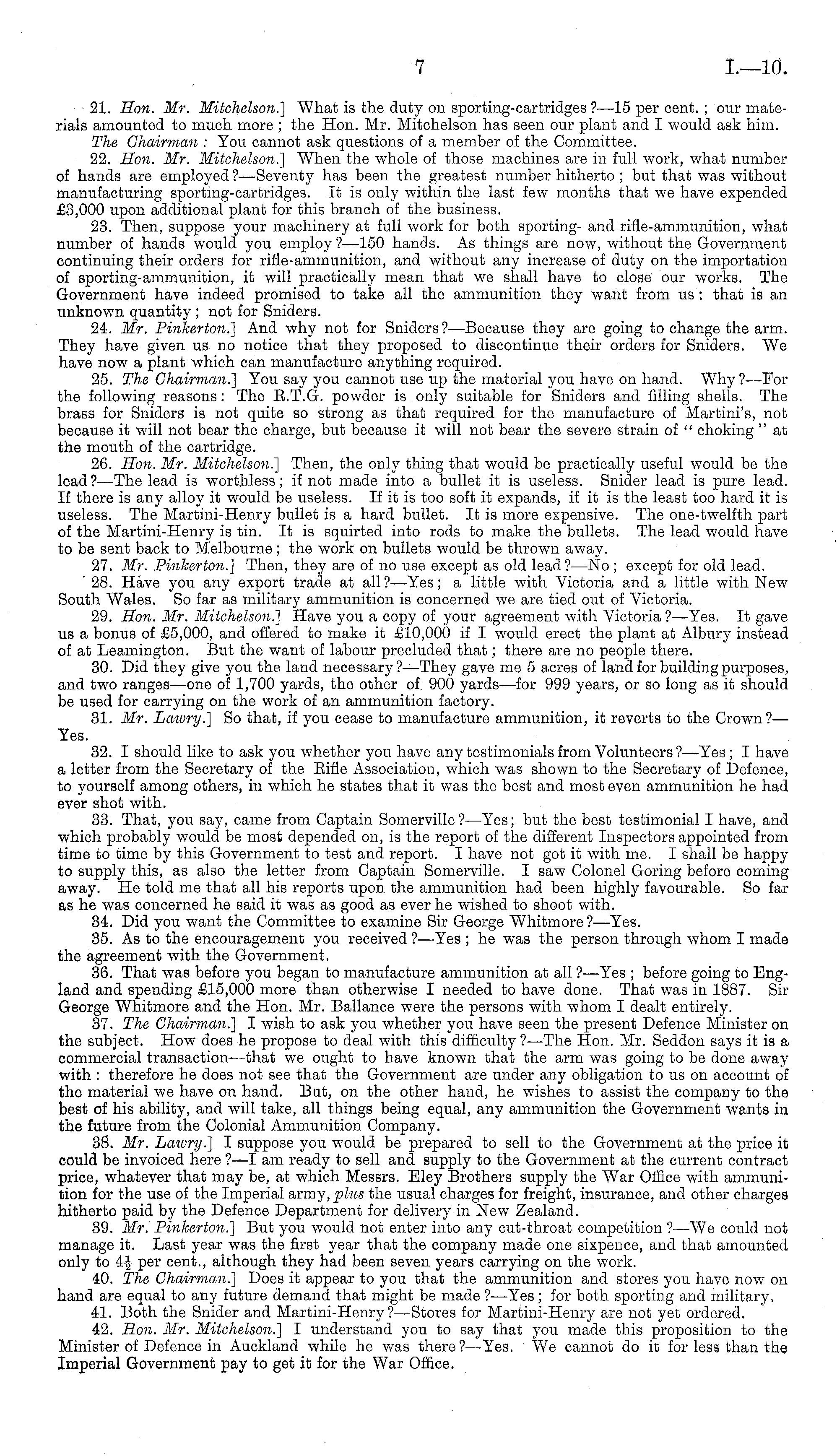 21. Hon. Mr. Mitchelson.] What is the duty on sporting-cartridges ?—l5 per cent.; our materials amounted to much more ; the Hon. Mr. Mitchelson has seen our plant and I would ask him. The Chairman : You cannot ask questions of a member of the Committee. 22. Hon. Mr. Mitchelson.] When the whole of those machines are in full work, what number of hands are employed ?—Seventy has been the greatest number hitherto ; but that was without manufacturing sporting-cartridges. It is only within the last few months that we have expended £3,000 upon additional plant for this branch of the business. 23. Then, suppose your machinery at full work for both sporting- and rifle-ammunition, what number of hands would you employ?—lso hands. As things are now, without the Government continuing their orders for rifle-ammunition, and without any increase of duty on the importation of sporting-ammunition, it w r ill practically mean that we shall have to close our works. The Government have indeed promised to take all the ammunition they want from us : that is an unknown quantity ; not for Sniders. 24. Mr. Pinherton.] And why not for Sniders?—Because they are going to change the arm. They have given us no notice that they proposed to discontinue their orders for Sniders. We have now a plant which can manufacture anything required. 25. The Chairman.] You say you cannot use up the material you have on hand. Why ?—For the following reasons: The E.T.G. powder is only suitable for Sniders and filling shells. The brass for Sniders is not quite so strong as that required for the manufacture of Martini's, not because it will not bear the charge, but because it will not bear the severe strain of " choking " at the mouth of the cartridge. 26. Hon. Mr. Mitchelson.] Then, the only thing that would be practically useful would be the lead?— The lead is worthless; if not made into a bullet it is useless. Snider lead is pure lead. If there is any alloy it would be useless. If it is too soft it expands, if it is the least too hard it is useless. The Martini-Henry bullet is a hard bullet. It is more expensive. The one-twelfth part of the Martini-Henry is tin. It is squirted into rods to make the bullets. The lead would have to be sent back to Melbourne; the work on bullets would be thrown away. 27. Mr. Pinherton.] Then, they are of no use except as old lead? —No; except for old lead. ' 28. Have you any export trade at all ?—Yes; a little with Victoria and a little with New South Wales. So far as military ammunition is concerned we are tied out of Victoria. 29. Hon. Mr. Mitchelson.] Have you a copy of your agreement with Victoria ?—Yes. It gave us a bonus of £5,000, and offered to make it £10,000 if I would erect the plant at Albury instead of at Leamington. But the want of labour precluded that; there are no people there. 30. Did they give you the land necessary?— They gave me 5 acres of land for building purposes, and two ranges—one of 1,700 yards, the other of 900 yards—for 999 years, or so long as it should be used for carrying on the work of an ammunition factory. 31. Mr. Laivry.] So that, if you cease to manufacture ammunition, it reverts to the Crown? — Yes. 32. I should like to ask you whether you have any testimonials from Volunteers ?—Yes; I have a letter from the Secretary of the Eifle Association, which was shown to the Secretary of Defence, to yourself among others, in which he states that it was the best and most even ammunition he had ever shot with. 33. That, you say, came from Captain Somerville?—Yes; but the best testimonial I have, and which probably would be most depended on, is the report of the different Inspectors appointed from time to time by this Government to test and report. I have not got it with me. I shall be happy to supply this, as also the letter from Captain Somerville. I saw Colonel Goring before coming away. He told me that all his reports upon the ammunition had been highly favourable. So far as he was concerned he said it was as good as ever he wished to shoot with. 34. Did you want the Committee to examine Sir George Whitmore ?—Yes. 35. As to the encouragement you received ?—Yes ; he was the person through whom I made the agreement with the Government. 36. That was before you began to manufacture ammunition at all ? —Yes ; before going to England and spending £15,000 more than otherwise I needed to have done. That was in 1887. Sir George Whitmore and the Hon. Mr. Ballance were the persons with whom I dealt entirely. 37. The Chairman.] I wish to ask you whether you have seen the present Defence Minister on the subject. How does he propose to deal with this difficulty ?—The Hon. Mr. Seddon says it is a commercial transaction-—that we ought to have known that the arm was going to be done away with : therefore he does not see that the Government are under any obligation to us on account of the material we have on hand. But, on the other hand, he wishes to assist the company to the best of his ability, and will take, all things being equal, any ammunition the Government wants in the future from the Colonial Ammunition Company. 38. Mr. Lawry.] I suppose you would be prepared to sell to the Government at the price it could be invoiced here ? —I am ready to sell and supply to the Government at the current contract price, whatever that may be, at which Messrs. Eley Brothers supply the War Office with ammunition for the use of the Imperial army, plus the usual charges for freight, insurance, and other charges hitherto paid by the Defence Department for delivery in New Zealand. 39. Mr. Pinherton.] But you would not enter into any cut-throat competition ? —We could not manage it. Last year was the first year that the company made one sixpence, and that amounted only to 4f per cent., although they had been seven years carrying on the work. 40. The Chairman.] Does it appear to you that the ammunition and stores you have now on hand are equal to any future de