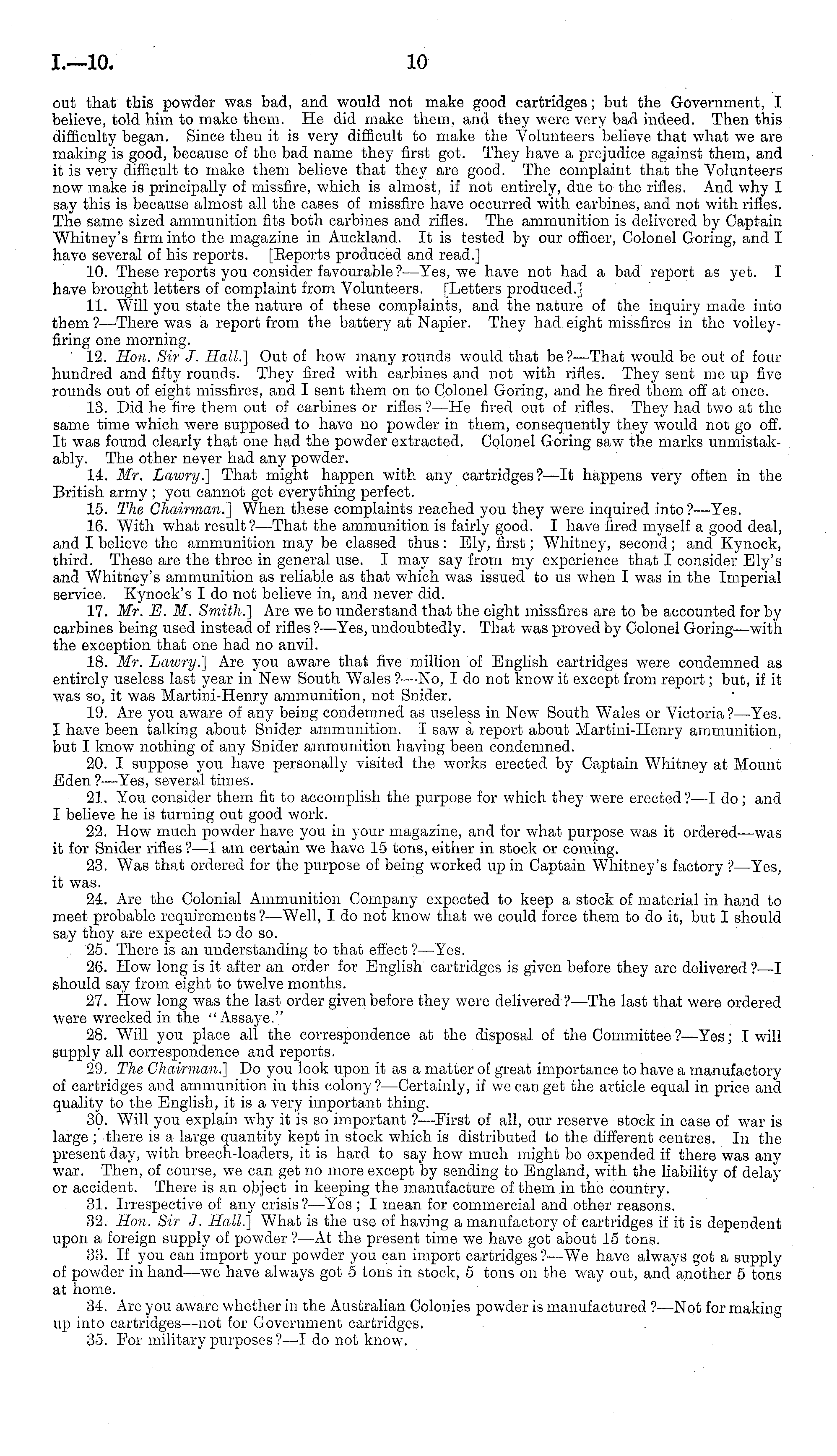 out that this powder was bad, and would not make good cartridges; but the Government, I believe, told him to make them. He did make them, and they were very bad indeed. Then this difficulty began. Since then it is very difficult to make the Volunteers believe that what we are making is good, because of the bad name they first got. They have a prejudice against them, and it is very difficult to make them believe that they are good. The complaint that the Volunteers now make is principally of missfire, which is almost, if not entirely, due to the rifles. And why I say this is because almost all the cases of missfire have occurred with carbines, and not with rifles. The same sized ammunition fits both carbines and rifles. The ammunition is delivered by Captain "Whitney's firm into the magazine in Auckland. It is tested by our officer, Colonel Goring, and I have several of his reports. [Reports produced and read.] 10. These reports you consider favourable ?—Yes, we have not had a bad report as yet. I have brought letters of complaint from Volunteers. [Letters produced.] 11. Will you state the nature of these complaints, and the nature of the inquiry made into them ?—There was a report from the battery at Napier. They had eight missfires in the volleyfiring one morning. 12. Hon. Sir J. Hall.] Out of how many rounds would that be?— That would be out of four hundred and fifty rounds. They fired with carbines and not with rifles. They sent me up five rounds out of eight missfires, and I sent them on to Colonel Goring, and he fired them off at once. 13. Did he fire them out of carbines or rifles?—He fired out of rifles. They had two at the same time which were supposed to have no powder in them, consequently they would not go off. It was found clearly that one had the powder extracted. Colonel Goring saw the marks unmistakably. The other never had any powder. 14. Mr. Laivry.] That might happen with any cartridges ?—lt happens very often in the British army ; you cannot get everything perfect. 15. The Chairman.] When these complaints reached you they were inquired into?— Yes. 16. With what result? —That the ammunition is fairly good. I have fired myself a good deal, and I believe the ammunition may be classed thus: Ely, first; Whitney, second; and Kynock, third. These are the three in general use. I may say from my experience that I consider Ely's and Whitney's ammunition as reliable as that which was issued to us when I was in the Imperial service. Kynock's Ido not believe in, and never did. 17. Mr. E. M. Smith.] Are we to understand that the eight missfires are to be accounted for by carbines being used instead of rifles ?—Yes, undoubtedly. That was proved by Colonel Goring— with the exception that one had no anvil. 18. Mr. Lawry.] Are you aware that five million of English cartridges were condemned as entirely useless last year in New South Wales ?—No, Ido not know it except from report; but, if it was so, it was Martini-Henry ammunition, not Snider. 19. Are you aware of any being condemned as useless in New South Wales or Victoria?— Yes. I have been talking about Snider ammunition. I saw a report about Martini-Henry ammunition, but I know nothing of any Snider ammunition having been condemned. 20. I suppose you have personally visited the works erected by Captain Whitney at Mount Eden ? —Yes, several times. 21. You consider them fit to accomplish the purpose for which they were erected?—l do; and I believe he is turning out good work. 22. How much powder have you in your magazine, and for what purpose was it ordered—was it for Snider rifles ?—I am certain we have 15 tons, either in stock or coming. 23. Was that ordered for the purpose of being worked up in Captain Whitney's factory ? —Yes, it was. 24. Are the Colonial Ammunition Company expected to keep a stock of material in hand to meet probable requirements ?—Well, I do not know that we could force them to do it, but I should say they are expected to do so. 25. There is an understanding to that effect ?—Yes. 26. How long is it after an order for English cartridges is given before they are delivered ?—I should say from eight to twelve months. 27. How long was the last order given before they were delivered ?—The last that were ordered were wrecked in the "Assaye." 28. Will you place all the correspondence at the disposal of the Committee ?—Yes; I will supply all correspondence and reports. 29. The Chairman.] Do you look upon it as a matter of great importance to have a manufactory of cartridges and ammunition in this colony ?—Certainly, if we can get the article equal in price and quality to the English, it is a very important thing. 30. Will you explain why it is so important ?—First of all, our reserve stock in case of war is large ;' there is a large quantity kept in stock which is distributed to the different centres. In the present day, with breech-loaders, it is hard to say how much might be expended if there was any war. Then, of course, we can get no more except by sending to England, with the liability of delay or accident. There is an object in keeping the manufacture of them in the country. 31. Irrespective of any crisis?— Yes ; I mean for commercial and other reasons. 32. Hon. Sir J. Hall.} What is the use of having a manufactory of cartridges if it is dependent upon a foreign supply of powder?—At the present time we have got about 15 tons. 33. If you can import your powder you can import cartridges? —We have always got a supply of powder in hand—we have always got 5 tons in stock, 5 tons on the way out, and another 5 tons at homo. 34. Are you aware whether in the Australian Colonies powder is manufactured ?—Not for making up into cartridges—not for Government cartridges. 35. For military purposes ?—I do not know.