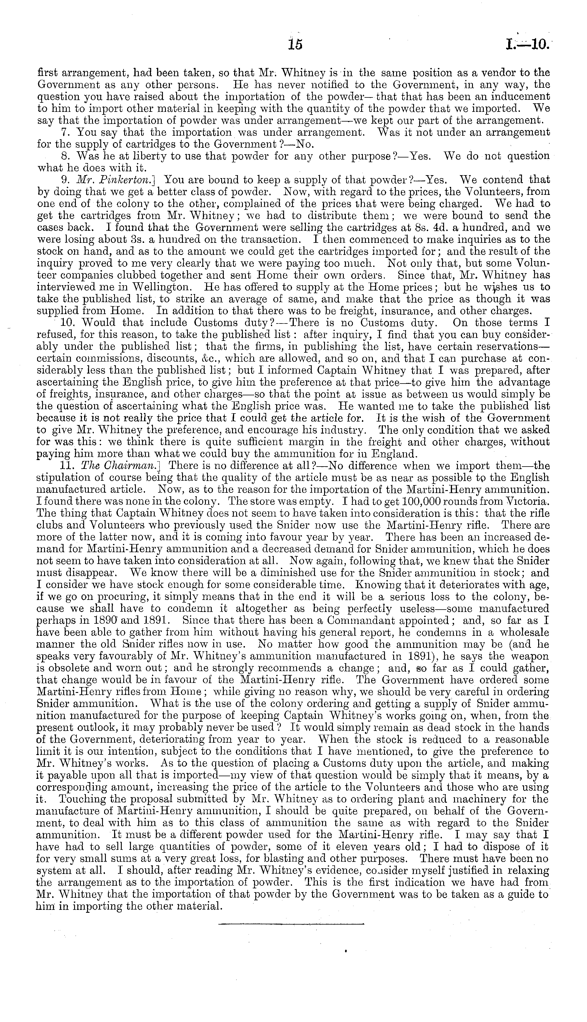 first arrangement, had been taken, so that Mr. Whitney is in the same position as a vendor to the Government as any other persons. He has never notified to the Government, in any way, the question you have raised about the importation of the powder —that that has been an inducement to him to import other material in keeping with the quantity of the powder that we imported. We say that the importation of powder was under arrangement—we kept our part of the arrangement. 7. You say that the importation was under arrangement. Was it not under an arrangement for the supply of cartridges to the Government ?—No. 8. Was he at liberty to use that powder for any other purpose? —Yes. We do not question what he does with it. 9. Mr. Pinkerton.] You are bound to keep a supply of that powder?— Yes. We contend that by doing that we get a better class of powder. Now, with regard to the prices, the Volunteers, from one end of the colony to the other, complained of the prices that were being charged. We had to get the cartridges from Mr. Whitney; we had to distribute them; we were bound to send the cases back. I found that the Government were selling the cartridges at Bs. 4d. a hundred, and we were losing about 3s. a hundred on the transaction. I then commenced to make inquiries as to the stock on hand, and as to the amount we could get the cartridges imported for; and the result of the inquiry proved to me very clearly that we were paying too much. Not only that, but some Volunteer companies clubbed together and sent Home their own orders. Since that, Mr. Whitney has interviewed me in Wellington. He has offered to supply at the Home prices ; but he washes us to take the published list, to strike an average of same, and make that the price as though it was supplied from Home. In addition to that there was to be freight, insurance, and other charges. 10. Would that include Customs duty? — There is no Customs duty. On those terms I refused, for this reason, to take the published list : after inquiry, I find that you can buy considerably under the published list; that the firms, in publishing the list, have certain reservations — certain commissions, discounts, &c, which are allowed, and so on, and that I can purchase at considerably less than the published list; but I informed Captain Whitney that I was prepared, after ascertaining the English price, to give him the preference at that price—to give him the advantage of freights, insurance, and other charges—so that the point at issue as between us would simply be the question of ascertaining what the English price was. He wanted me to take the published list because it is not really the price that I could get the article for. It is the wish of the Government to give Mr. Whitney the preference, and encourage his industry. The only condition that we asked for was this: we think there is quite sufficient margin in the freight and other charges, without paying him more than what we could buy the ammunition for in England. 11. The Chairman.} There is no difference at all ? —No difference when we import them —the stipulation of course being that the quality of the article must be as near as possible to the English manufactured article. Now, as to the reason for the importation of the Martini-Henry ammunition. I found there was none in the colony. The store was empty. I had to get 100,000 rounds from Victoria. The thing that Captain Whitney does not seem to have taken into consideration is this: that the rifle clubs and Volunteers who previously used the Snider now use the Martini-Henry rifle. There are more of the latter now, and it is coming into favour year by year. There has been an increased demand for Martini-Henry ammunition and a decreased demand for Snider ammunition, which he does not seem to have taken into consideration at all. Now again, following that, we knew that the Snider must disappear. We know there will be a diminished use for the Snider ammunition in stock; and I consider we have stock enough for some considerable time. Knowing that it deteriorates with age, if we go on procuring, it simply means that in the end it will be a serious loss to the colony, because we shall have to condemn it altogether as being perfectly useless —some manufactured perhaps in 1890 and 1891. Since that there has been a Commandant appointed; and, so far as I have been able to gather from him without having his general report, he condemns in a wholesale manner the old Snider rifles now in use. No matter how good the ammunition may be (and he speaks very favourably of Mr. Whitney's ammunition manufactured in 1891), he says the weapon is obsolete and worn out; and he strongly recommends a change; and, so far as I could gather, that change would be in favour of the Martini-Henry rifle. The Government have ordered some Martini-Henry rifles from Home; while giving no reason why, we should be very careful in ordering Snider ammunition. What is the use of the colony ordering and getting a supply of Snider ammunition manufactured for the purpose of keeping Captain Whitney's works going on, when, from the present outlook, it may probably never be used ? It would simply remain as dead stock in the hands of the Government, deteriorating from year to year. When the stock is reduced to a reasonable limit it is om intention, subject to the conditions that I have mentioned, to give the preference to Mr. Whitney's works. As to the question of placing a Customs duty upon the article, and making it payable upon all that is imported—my view of that question would be simply that it means, by a corresponding amount, increasing the price of the article to the Volunteers and those who are using it. Touching the proposal submitted by Mr. W T hitney as to ordering plant and machinery for the manufacture of Martini-Henry ammunition, I should be quite prepared, on behalf of the Government, to deal with him as to this class of ammunition the same as with regard to the S