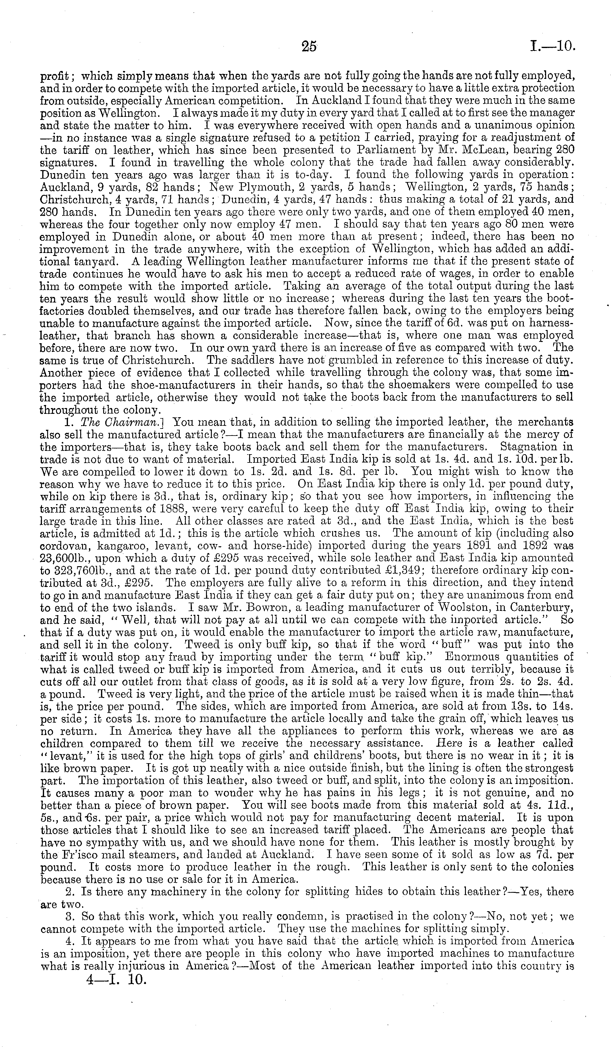 profit; which simply means that when the yards are not fully going the hands are not fully employed, and in order to compete with the imported article, it would be necessary to have a little extra protection from outside, especially American competition. In Auckland I found that they were much in the same position as Wellington. I always made it my duty in every yard that I called at to first see the manager and state the matter to him. I was everywhere received with open hands and a unanimous opinion —in no instance was a single signature refused to a petition I carried, praying for a readjustment of the tariff on leather, which has since been presented to Parliament by Mr. McLean, bearing 280 signatures. I found in travelling the whole colony that the trade had fallen away considerably. Dunedin ten years ago was larger than it is to-day. I found the following yards in operation: Auckland, 9 yards, 82 hands; New Plymouth, 2 yards, 5 hands; "Wellington, 2 yards, 75 hands; Christchurch, 4 yards, 71 hands; Dunedin, 4 yards, 47 hands : thus making a total of 21 yards, and 280 hands. In Dunedin ten years ago there were only two yards, and one of them employed 40 men, whereas the four together only now employ 47 men. I should say that ten years ago 80 men were employed in Dunedin alone, or about 40 men more than at present; indeed, there has been no improvement in the trade anywhere, with the exception of Wellington, which has added an additional tanyard. A leading Wellington leather manufacturer informs me that if the present state of trade continues he would have to ask his men to accept a reduced rate of wages, in order to enable him to compete with the imported article. Taking an average of the total output during the last ten years the result would show little or no increase; whereas during the last ten years the bootfactories doubled themselves, and our trade has therefore fallen back, owing to the employers being unable to manufacture against the imported article. Now, since the tariff of 6d. was put on harnessleather, that branch has shown a considerable increase—that is, where one man was employed before, there are now two. In our own yard there is an increase of five as compared with two. The same is true of Christchurch. The saddlers have not grumbled in reference to this increase of duty. Another piece of evidence that I collected while travelling through the colony was, that some importers had the shoe-manufacturers in their hands, so that the shoemakers were compelled to use the imported article, otherwise they would not take the boots back from the manufacturers to sell throughout the colony. 1. The Chairman.} You mean that, in addition to selling the imported leather, the merchants also sell the manufactured article ?—I mean that the manufacturers are financially at the mercy of the importers—that is, they take boots back and sell them for the manufacturers. Stagnation in trade is not due to want of material. Imported East India kip is sold at Is. 4d. and Is. 10d. perlb. We are compelled to lower it clown to Is. 2d. and Is. Bd. per lb. You might wish to know the reason why we have to reduce it to this price. On East India kip there is only Id. per pound duty, while on kip there is 3d., that is, ordinary kip; so that you see how importers, in influencing the tariff arrangements of 1888, were very careful to keep the duty off East India kip, owing to their large trade in this line. All other classes are rated at 3d., and the East India, which is the best article, is admitted at Id.; this is the article which crushes us. The amount of kip (including also cordovan, kangaroo, levant, cow- and horse-hide) imported during the years 1891 and 1892 was 23,6001b., upon which a duty of £295 was received, while sole leather and East India kip amounted to 323,7601b., and at the rate of Id. per pound duty contributed £1,349; therefore ordinary kip contributed at 3d., £295. The employers are fully alive to a reform in this direction, and they intend to go in and manufacture East India if they can get a fair duty put on; they are unanimous from end to end of the two islands. I saw Mr. Bowron, a leading manufacturer of Woolston, in Canterbury, and he said, " Well, that will not pay at all until we can compete with the imported article." So that if a duty was put on, it would enable the manufacturer to import the article raw, manufacture, and sell it in the colony. Tweed is only buff kip, so that if the word "buff" was put into the tariff it would stop any fraud by importing under the term "buff kip." Enormous quantities of what is called tweed or buff kip is imported from America, and it cuts us out terribly, because it cuts off all our outlet from that class of goods, as it is sold at a very low figure, from 2s. to 2s. 4d. a pound. Tweed is very light, and the price of the article must be raised when it is made thin—that is, the price per pound. The sides, which are imported from America, are sold at from 13s. to 14s. per side; it costs Is. more to manufacture the article locally and take the grain off, which leaves us no return. In America they have all the appliances to perform this work, whereas we are as children compared to them till we receive the necessary assistance. Here is a leather called " levant," it is used for the high tops of girls' and childrens' boots, but there is no wear in it; it is like brown paper. It is got up neatly with a nice outside finish, but the lining is often the strongest part. The importation of this leather, also tweed or buff, and split, into the colony is an imposition. It causes many a poor man to wonder why he has pains in his legs ; it is not genuine, and no better than a piece of brown paper. You will see boots made from this material sold at 4s. lid., 55., and'6s. per pair, a price which would not pay for manufacturing decent material. It is upon those articles that I should like to see an increased tariff placed. The Americans are people