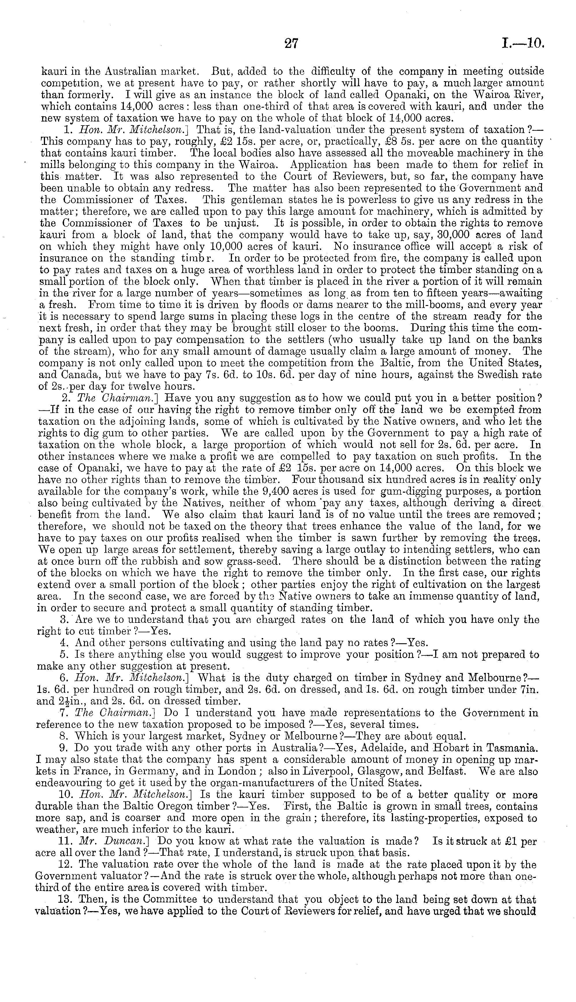 kauri in the Australian market. But, added to the difficulty of the company in meeting outside competition, we at present have to pay, or rather shortly will have to pay, a much larger amount than formerly. I will give as an instance the block of land called Opanaki, on the Wairoa River, which contains 14,000 acres : less than one-third of that area is covered with kauri, and under the new system of taxation we have to pay on the whole of that block of 14,000 acres. 1. Hon. Mr. Mitohelson.] That is, the land-valuation under the present system of taxation ?— This company has to pay, roughly, £2 15s. per acre, or, practically, £8 ss. per acre on the quantity that contains kauri timber. The local bodies also have assessed all the moveable machinery in the mills belonging to this company in the Wairoa. Application has been made to them for relief in this matter. It was also represented to the Court of Eeviewers, but, so far, the company have been unable to obtain any redress. The matter has also been represented to the Government and the Commissioner of Taxes. This gentleman states he is powerless to give us any redress in the matter; therefore, we are called upon to pay this large amount for machinery, which is admitted by the Commissioner of Taxes to be unjust. It is possible, in order to obtain the rights to remove kauri from a block of land, that the company would have to take up, say, 30,000 acres of land on which they might have only 10,000 acres of kauri. No insurance office will accept a risk of insurance on the standing timbr. In order to be protected from fire, the company is called upon to pay rates and taxes on a huge area of worthless land in order to protect the timber standing on a small portion of the block only. When that timber is placed in the river a portion of it will remain in the river for a large number of years—sometimes as long as from ten to fifteen years—awaiting a fresh. From time to time it is driven by floods or dams nearer to the mill-booms, and every year it is necessary to spend large sums in placing these logs in the centre of the stream ready for the next fresh, in order that they may be brought still closer to the booms. During this time the company is called upon to pay compensation to the settlers (who usually take up land on the banks of the stream), who for any small amount of damage usually claim a large amount of money. The company is not only called upon to meet the competition from the Baltic, from the United States, and Canada, but we have to pay 7s. 6d. to 10s. 6d. per day of nine hours, against the Swedish rate of 2s. per day for twelve hours. 2. The Chairman.] Have you any suggestion as to how we could put you in a better position? —If in the case of our having the right to remove timber only off the land we be exempted from taxation on the adjoining lands, some of which is cultivated by the Native owners, and who let the rights to dig gum to other parties. We are called upon by the Government to pay a high rate of taxation on the whole block, a large proportion of which would not sell for 2s. 6d. per acre. In other instances where we make a profit we are compelled to pay taxation on such profits. In the case of Opanaki, we have to pay at the rate of £2 15s. per acre on 14,000 acres. On this block we have no other rights than to remove the timber. Four thousand six hundred acres is in reality only available for the company's work, while the 9,400 acres is used for gum-digging purposes, a portion also being cultivated by the Natives, neither of whom pay any taxes, although, deriving a direct benefit from the land. We also claim that kauri land is of no value until the trees are removed; therefore, we should not be taxed on the theory that trees enhance the value of the land, for we have to pay taxes on our profits realised when the timber is sawn further by removing the trees. We open up large areas for settlement, thereby saving a large outlay to intending settlers, who can at once burn off the rubbish and sow grass-seed. There should be a distinction between the rating of the blocks on which we have the right to remove the timber only. In the first case, our rights extend over a small portion of the block ; other parties enjoy the right of cultivation on the largest area. In the second case, we are forced by tb.3 Native owners to take an immense quantity of land, in order to secure and protect a small quantity of standing timber. 3. Are we to understand that you are charged rates on the land of which you have only the right to cut timber ?—Yes. 4. And other persons cultivating and using the land pay no rates?— Yes. 5. Is there anything else you would suggest to improve your position ?—I am not prepared to make any other suggestion at present. 6. Hon. Mr. Mitohelson."] What is the duty charged on timber in Sydney and Melbourne?— Is. 6d. per hundred on rough timber, and 2s. 6d. on dressed, and Is. 6d. on rough timber under 7in. and 2fin., and 2s. 6d. on dressed timber. 7. The Chairman.] Do I understand you have made representations to the Government in reference to the new taxation proposed to be imposed ?—Yes, several times. 8. Which is your largest market, Sydney or Melbourne ?—They are about equal. 9. Do you trade with any other ports in Australia?— Yes, Adelaide, and Hobart in Tasmania. I may also state that the company has spent a considerable amount of money in opening up markets in France, in Germany, and in London ; also in Liverpool, Glasgow, and Belfast. We are also endeavouring to get it used by the organ-manufacturers of the United States. 10. Hon. Mr. Mitchelson.] Is the kauri timber supposed to be of a better quality or more durable than the Baltic Oregon timber ?—Yes. First, the Baltic is grown in small trees, contains more sap, and is coarser and more open in the grain ; therefore, its lasting-properties, exposed to weather, are much inferior to the kauri. 11. Mr. Duncan.] Do you know at what rate the 
