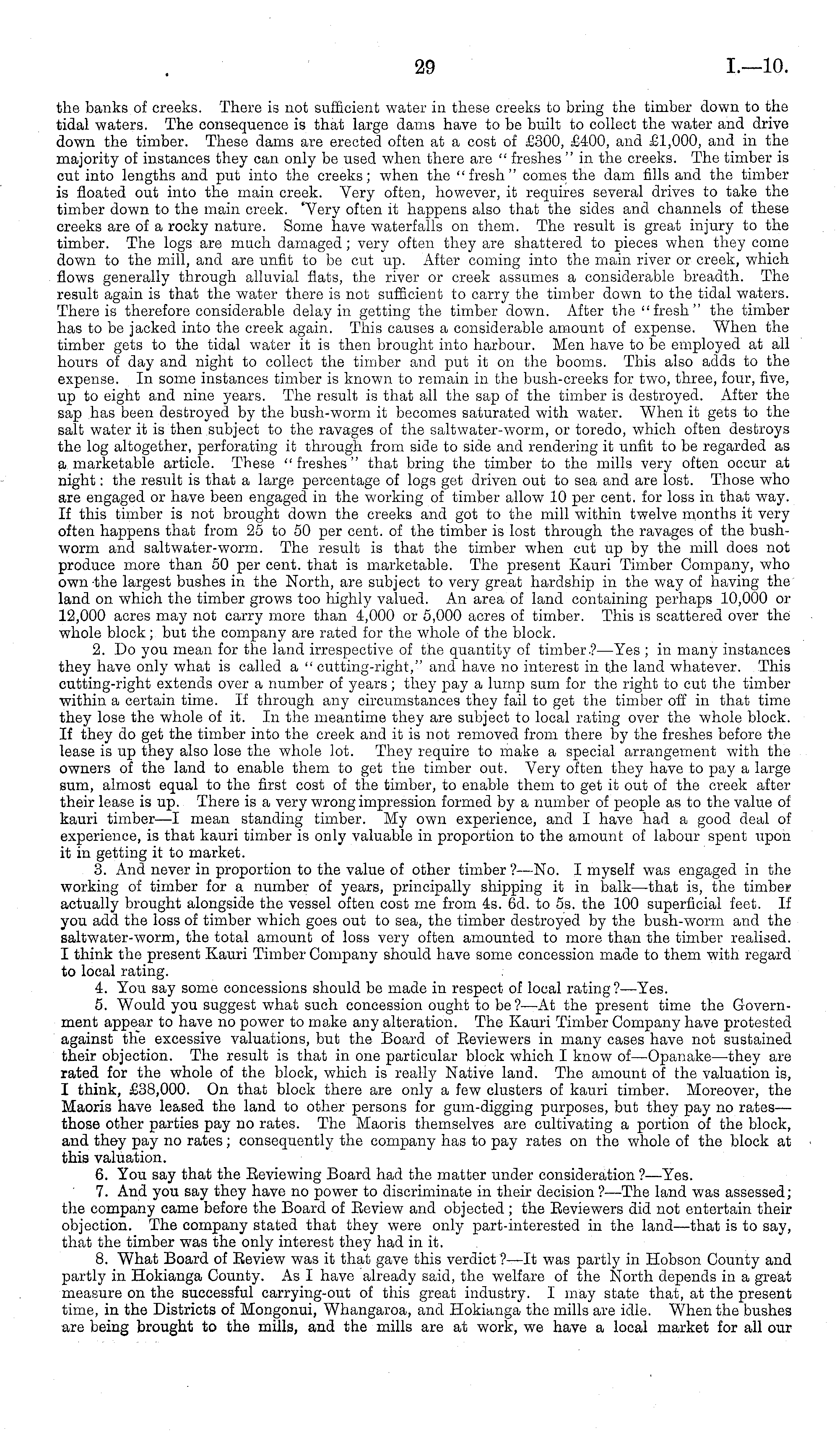 the banks of creeks. There is not sufficient water in these creeks to bring the timber down to the tidal waters. The consequence is that large dams have to be built to collect the water and drive down the timber. These dams are erected often at a cost of £300, £400, and £1,000, and in the majority of instances they can only be used when there are " freshes "in the creeks. The timber is cut into lengths and put into the creeks; when the "fresh" comes the dam fills and the timber is floated out into the main creek. Very often, however, it requires several drives to take the timber down to the main creek. "Very often it happens also that the sides and channels of these creeks are of a rocky nature. Some have waterfalls on them. The result is great injury to the timber. The logs are much damaged ; very often they are shattered to pieces when they come down to the mill, and are unfit to be cut up. After coming into the main river or creek, which flows generally through alluvial flats, the river or creek assumes a considerable breadth. The result again is that the water there is not sufficient to carry the timber down to the tidal waters. There is therefore considerable delay in getting the timber down. After the "fresh" the timber has to be jacked into the creek again. This causes a considerable amount of expense. When the timber gets to the tidal water it is then brought into harbour. Men have to be employed at all hours of day and night to collect the timber and put it on the booms. This also adds to the expense. In some instances timber is known to remain in the bush-creeks for two, three, four, five, up to eight and nine years. The result is that all the sap of the timber is destroyed. After the sap has been destroyed by the bush-worm it becomes saturated with water. "When it gets to the salt water it is then subject to the ravages of the saltwater-worm, or toredo, which often destroys the log altogether, perforating it through from side to side and rendering it unfit to be regarded as a marketable article. These " freshes " that bring the timber to the mills very often occur at night: the result is that a large percentage of logs get driven out to sea and are lost. Those who are engaged or have been engaged in the working of timber allow 10 per cent, for loss in that way. If this timber is not brought down the creeks and got to the mill within twelve months it very often happens that from 25 to 50 per cent, of the timber is lost through the ravages of the bushworm and saltwater-worm. The result is that the timber when cut up by the mill does not produce more than 50 per cent, that is marketable. The present Kauri Timber Company, who own -the largest bushes in the North, are subject to very great hardship in the way of having the land on which the timber grows too highly valued. An area of land containing perhaps 10,000 or 12,000 acres may not carry more than 4,000 or 5,000 acres of timber. This is scattered over the whole block; but the company are rated for the whole of the block. 2. Do you mean for the land irrespective of the quantity of timber.'? —Yes ; in many instances they have only what is called a "cutting-right," and have no interest in the land whatever. This cutting-right extends over a number of years; they pay a lump sum for the right to cut the timber within a certain time. If through any circumstances they fail to get the timber off in that time they lose the whole of it. In the meantime they are subject to local rating over the whole block. If they do get the timber into the creek and it is not removed from there by the freshes before the lease is up they also lose the whole lot. They require to make a special arrangement with the owners of the land to enable them to get the timber out. Very often they have to pay a large sum, almost equal to the first cost of the timber, to enable them to get it out of the creek after their lease is up. There is a very wrong impression formed by a number of people as to the value of kauri timber—l mean standing timber. My own experience, and I have had a good deal of experience, is that kauri timber is only valuable in proportion to the amount of labour spent upon it in getting it to market. 3. And never in proportion to the value of other timber ? —No. I myself was engaged in the working of timber for a number of years, principally shipping it in balk—that is, the timber actually brought alongside the vessel often cost me from 4s. 6d. to ss. the 100 superficial feet. If you add the loss of timber which goes out to sea, the timber destroyed by the bush-worm and the saltwater-worm, the total amount of loss very often amounted to more than the timber realised. I think the present Kauri Timber Company should have some concession made to them with regard to local rating. 4. You say some concessions should be made in respect of local rating?— Yes. 5. Would you suggest what such concession ought to be? —At the present time the Government appear to have no power to make any alteration. The Kauri Timber Company have protested against the excessive valuations, but the Board of Eeviewers in many cases have not sustained their objection. The result is that in one particular block which I know of—Opanake—they are rated for the whole of the block, which is really Native land. The amount of the valuation is, I think, £38,000. On that block there are only a few clusters of kauri timber. Moreover, the Maoris have leased the land to other persons for gum-digging purposes, but they pay no rates— those other parties pay no rates. The Maoris themselves are cultivating a portion of the block, and they pay no rates; consequently the company has to pay rates on the whole of the block at this valuation. 6. You say that the Eeviewing Board had the matter under consideration ?—Yes. 7. And you say they have no power to discriminate in their decision ?—The land was assessed; the company came before the Board of Eeview and objected; the Ee