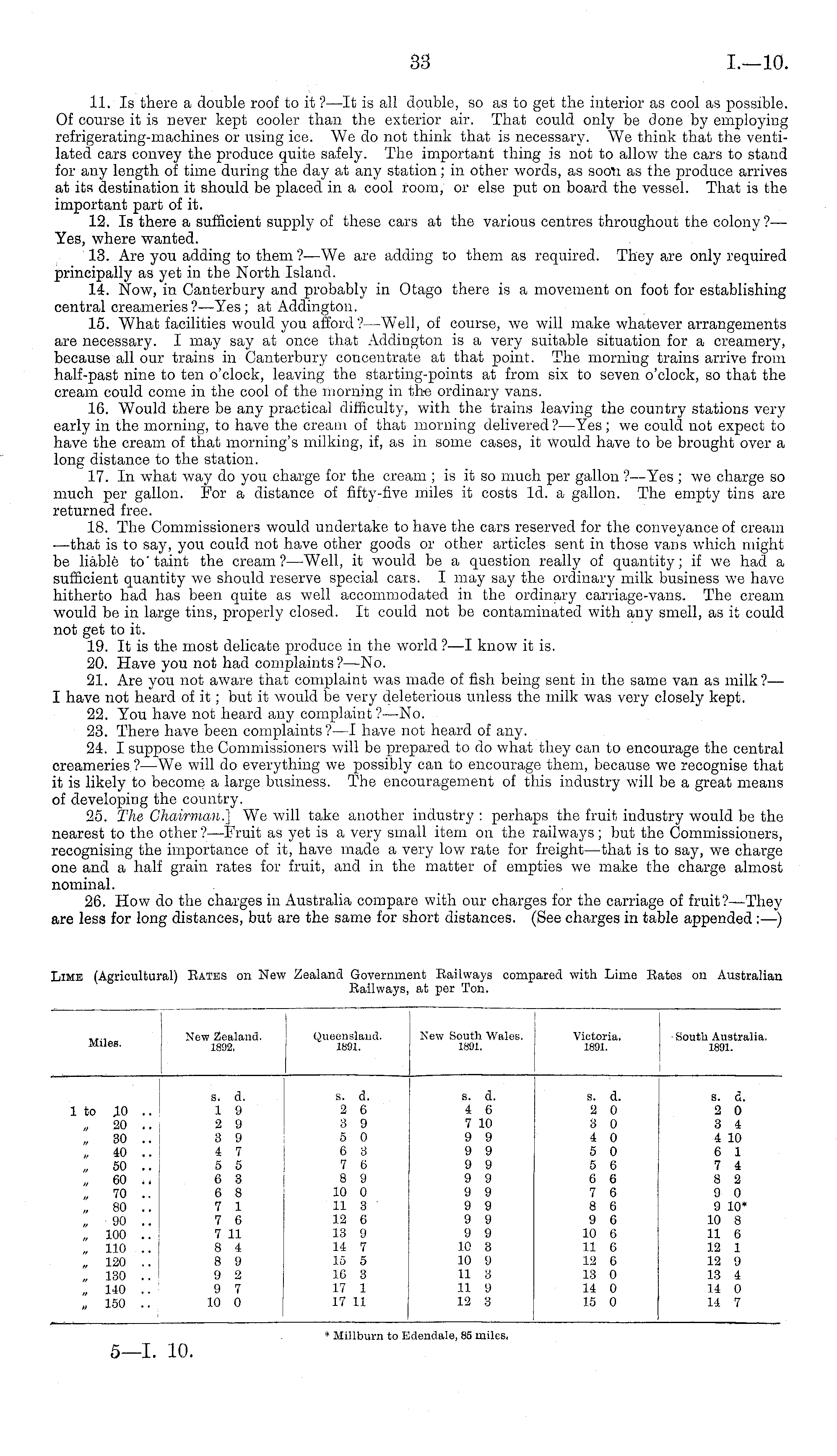 11. Is there a double roof to it ? —lt is all double, so as to get the interior as cool as possible. Of course it is never kept cooler than the exterior air. That could only be done by employing refrigerating-niachines or using ice. We do not think that is necessary. We think that the ventilated cars convey the produce quite safely. The important thing is not to allow the cars to stand for any length of time during the day at any station; in other words, as sooti as the produce arrives at its destination it should be placed in a cool room, or else put on board the vessel. That is the important part of it. 12. Is there a sufficient supply of these cars at the various centres throughout the colony ?— Yes, where wanted. 13. Are you adding to them ?—We are adding to them as required. They are only required principally as yet in the North Island. 14. Now, in Canterbury and probably in Otago there is a movement on foot for establishing central creameries?— Yes; at Addington. 15. What facilities would you afford?— Well, of course, we will make whatever arrangements are necessary. I may say at once that Addington is a very suitable situation for a creamery, because all our trains in Canterbury concentrate at that point. The morning trains arrive from half-past nine to ten o'clock, leaving the starting-points at from six to seven o'clock, so that the cream could come in the cool of the morning in the ordinary vans. 16. Would there be any practical difficulty, with the trains leaving the country stations very early in the morning, to have the cream of that morning delivered ?—Yes ; we could not expect to have the cream of that morning's milking, if, as in some cases, it would have to be brought over a long distance to the station. 17. In what way do you charge for the cream ; is it so much per gallon ?—Yes ; we charge so much per gallon. For a distance of fifty-five miles it costs Id. a gallon. The empty tins are returned free. 18. The Commissioners would undertake to have the ears reserved for the conveyance of cream —that is to say, you could not have other goods or other articles sent in those vans which might be liable to'taint the cream?— Well, it would be a question really of quantity; if we had a sufficient quantity we should reserve special cars. I may say the ordinary milk business we have hitherto had has been quite as well accommodated in the ordinary carriage-vans. The cream would be in large tins, properly closed. It could not be contaminated with any smell, as it could not get to it. 19. It is the most delicate produce in the world ?—I know it is. 20. Have you not had complaints? —No. 21. Are you not aware that complaint was made of fish being sent in the same van as milk?— I have not heard of it; but it would be very deleterious unless the milk was very closely kept. 22. You have not heard any complaint?— No. 23. There have been complaints ?—I have not heard of any. 24. I suppose the Commissioners will be prepared to do what they can to encourage the central creameries ?—We will do everything we possibly can to encourage them, because we recognise that it is likely to become a large business. The encouragement of this industry will be a great means of developing the country. 25. The Chairman.'] We will take another industry : perhaps the fruit industry would be the nearest to the other ?—Fruit as yet is a very small item on the railways; but the Commissioners, recognising the importance of it, have made a very low rate for freight—that is to say, we charge one and a half grain rates for fruit, and in the matter of empties we make the charge almost nominal. 26. How do the charges in Australia compare with our charges for the carriage of fruit?— They are less for long distances, but are the same for short distances. (See charges in table appended : —)