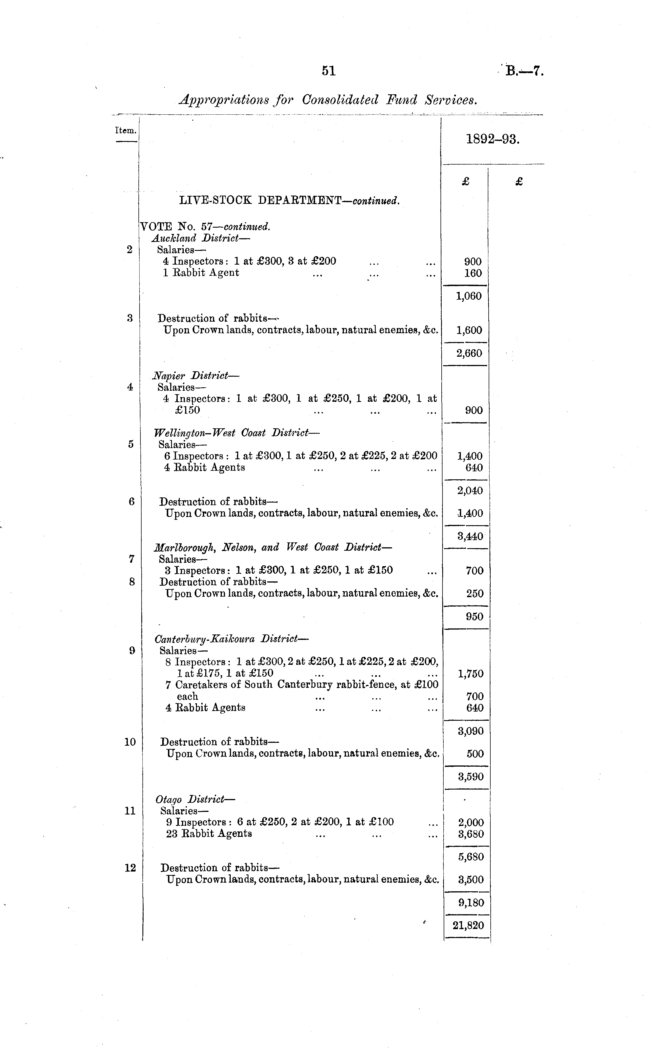 tern. 1892-93. LIVE-STOCK DEPABTMENT— continued. VOTE No. 57— continued. Auckland District — Salaries — 4 Inspectors: 1 at £300, 3 at £200 1 Babbit Agent 900 160 Destruction of rabbits— Upon Crown lands, contracts, labour, natural enemies, &c. 1,060 3 1,600 2,660 Napier District — Salaries— 4 Inspectors: 1 at £300, 1 at £250, 1 at £200, 1 at £150 900 Wellington-West Coast District — Salaries — 6 Inspectors : 1 at £300,1 at £250, 2 at £225, 2 at £200 4 Babbit Agents 1,400 640 Destruction of rabbits — Upon Crown lands, contracts, labour, natural enemies, &c. 2,040 1,400 3,440 7 8 Marlborough, Nelson, and West Coast District — Salaries — 3 Inspectors: 1 at £300, 1 at £250, 1 at £150 Destruction of rabbits — Upon Crown lands, contracts, labour, natural enemies, &c. 700 250 950 Canterbury-Kaikour a District — 8 Inspectors : 1 at £300,2 at £250,1 at £225,2 at £200, 1 at £175, 1 at £150 7 Caretakers of South Canterbury rabbit-fence, at £100 each 4 Babbit Agents 1,750 700 640 10 Destruction of rabbits — Upon Crown lands, contracts, labour, natural enemies, Ac. 3,090 500 Otago District — Salaries — 9 Inspectors : 6 at £250, 2 at £200, 1 at £100 23 Babbit Agents 3,590 11 2,000 3,680 12 Destruction of rabbits — Upon Crown lands, contracts, labour, natural enemies, &c. 5,680 3,500 • i. 9,180 > 21,820