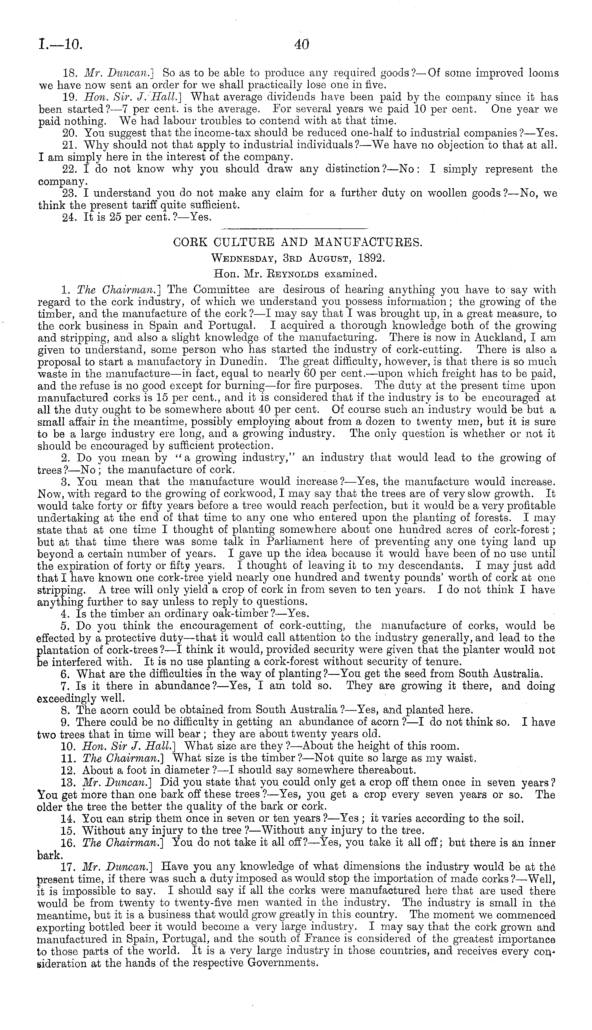 CORK CULTUEE AND MANUFACTURES. Wednesday, 3ed August, 1892. Hon. Mr. Reynolds examined. 1. The Chairman.] The Committee are desirous of hearing anything you have to say with regard to the cork industry, of which we understand you possess information ; the growing of the timber, and the manufacture of the cork ?—I may say that I was brought up, in a great measure, to the cork business in Spain and Portugal. I acquired a thorough knowledge both of the growing and stripping, and also a slight knowledge of the manufacturing. There is now in Auckland, lam given to understand, some person who has started the industry of cork-cutting. There is also a proposal to start a manufactory in Dunedin. The great difficulty, however, is that there is so much waste in the manufacture—in fact, equal to nearly 60 per cent.—upon which freight has to be paid, and the refuse is no good except for burning—for fire purposes. The duty at the present time upon manufactured corks is 15 per cent., and it is considered that if the industry is to be encouraged at all the duty ought to be somewhere about 40 per cent. Of course such an industry would be but a small affair in the meantime, possibly employing about from a dozen to twenty men, but it is sure to be a large industry ere long, and a growing industry. The only question is whether or not it should be encouraged by sufficient protection. 2. Do you mean by "a growing industry," an industry that would lead to the growing of trees ?—No ; the manufacture of cork. 3. You mean that the manufacture would increase ?—Yes, the manufacture would increase. Now, with regard to the growing of corkwood, I may say that the trees are of very slow growth. It would take forty or fifty years before a tree would reach perfection, but it would be a very profitable undertaking at the end of that time to any one who entered upon the planting of forests. I may state that at one time I thought of planting somewhere about one hundred acres of cork-forest; but at that time there was some talk in Parliament here of preventing any one tying land up beyond a certain number of years. I gave up the idea because it would have been of no use until the expiration of forty or fifty years. I thought of leaving it to my descendants. I may just add that I have known one cork-tree yield nearly one hundred and twenty pounds' worth of cork at one stripping. A tree will only yield a crop of cork in from seven to ten years. Ido not think I have anything further to say unless to reply to questions. 4. Is the timber an ordinary oak-timber?— Yes. 5. Do you think the encouragement of cork-cutting, the manufacture of corks, would be effected by a protective duty—that it would call attention to the industry generally, and lead to the plantation of cork-trees?—l think it would, provided security were given that the planter would not be interfered with. It is no use planting a cork-forest without security of tenure. 6. What are the difficulties in the way of planting? —You get the seed from South Australia. 7. Is it there in abundance? —Yes, lam told so. They are growing it there, and doing exceedingly well. 8. The acorn could be obtained from South Australia ?—Yes, and planted here. 9. There could be no difficulty in getting an abundance of acorn ?—I do not think so. I have two trees that in time will bear ; they are about twenty years old. 10. Hon. Sir J. Hall.] What size are they ? —About the height of this room. 11. The Chairman.] What size is the timber?— Not quite so large as my waist. 12. About a foot in diameter ?—I should say somewhere thereabout. 13. Mr. Duncan.] Did you state that you could only get a crop off them once in seven years ? You get more than one bark off these trees ?—Yes, you get a crop every seven years or so. The older the tree the better the quality of the bark or cork. 14. You can strip them once in seven or ten years ? —Yes ; it varies according to the soil. 15. Without any injury to the tree ?—Without any injury to the tree. 16. The Chairman.] You do not take it all off?— Yes, you take it all off; but there is an inner bark. 17. Mr. Duncan.] Have you any knowledge of what dimensions the industry would be at the present time, if there was such a duty imposed as would stop the importation of made corks ?—Well, it is impossible to say. I should say if all the corks were manufactured here that are used there Would be from twenty to twenty-five men wanted in the industry. The industry is small in the meantime, but it is a business that would grow greatly in this country. The moment we commenced exporting bottled beer it would become a very large industry. I may say that the cork grown and manufactured in Spain, Portugal, and the south of France is considered of the greatest importance to those parts of the world. It is a very large industry in those countries, and receives every coiv sideration at the hands of the respective Governments.