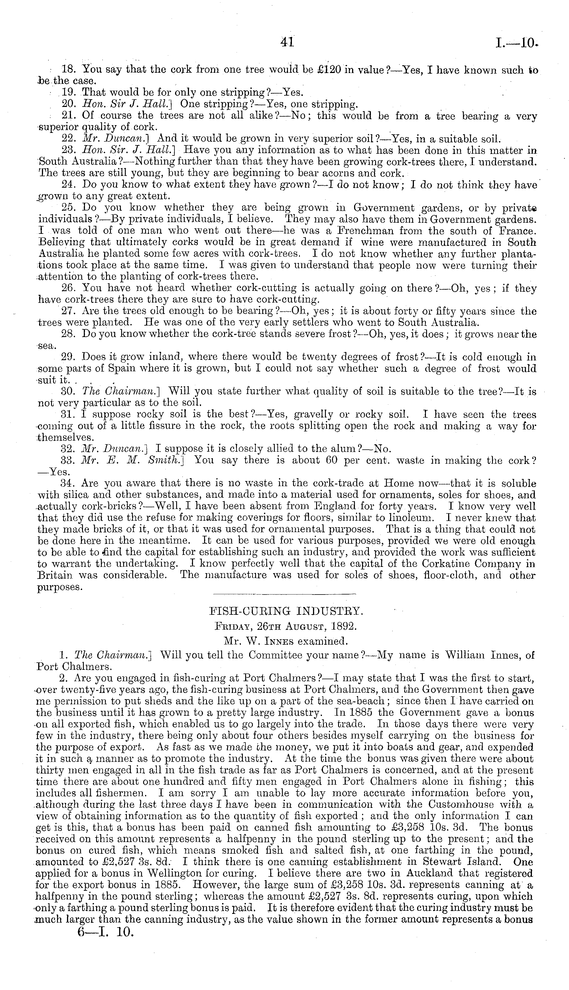 FISH-CUBING INDUBTEY. Fbiday, 26th August, 1892. Mr. W. Innes examined. 1. The Chairman.'] Will you tell the Committee your name ? —My name is William Innes, of Port Chalmers. 2. Are you engaged in fish-curing at Port Chalmers?—l may state that I was the first to start, •over twenty-five years ago, the fish-curing business at Port Chalmers, and the Government then gave me permission to put sheds and the like up on a part of the sea-beach; since then I have carried ou the business until it has grown to a pretty large industry. In 1885 the Government gave a bonus on all exported fish, which enabled us to go largely into the trade. In those days there were very few in the industry, there being only about four others besides myself carrying on the business for the purpose of export. As fast as we made the money, we put it into boats and gear, and expended it in such a. manner as to promote the industry. At the time the bonus was given there were about thirty men engaged in all in the fish trade as far as Port Chalmers is concerned, and at the present time there are about one hundred and fifty men engaged in Port Chalmers alone in fishing; this includes all fishermen. lam sorry I am unable to lay more accurate information before you, although during the last three days I have been in communication with the Customhouse with a view of obtaining information as to the quantity of fish exported ; and the only information I can get is this, that a bonus has been paid on canned fish amounting to £3,258 10s. 3d. The bonus received on this amount represents a halfpenny in the pound sterling up to the present; and the bonus on cured fish, which means smoked fish and salted fish, at one farthing in the pound, amounted to £2,527 3s. Bd. I think there is one canning establishment in Stewart Island. One applied for a bonus in Wellington for curing. I believe there are two in Auckland that registered for the export bonus in 1885. However, the large sum of £3,258 10s. 3d. represents canning at a halfpenny in the pound sterling; whereas the amount £2,527 3s. Bd. represents curing, upon which -only a farthing a pound sterling bonus is paid. It is therefore evident that the curing industry must be much larger than the canning industry, as the value shown in the former amount represents a bonus 6—l. 10.