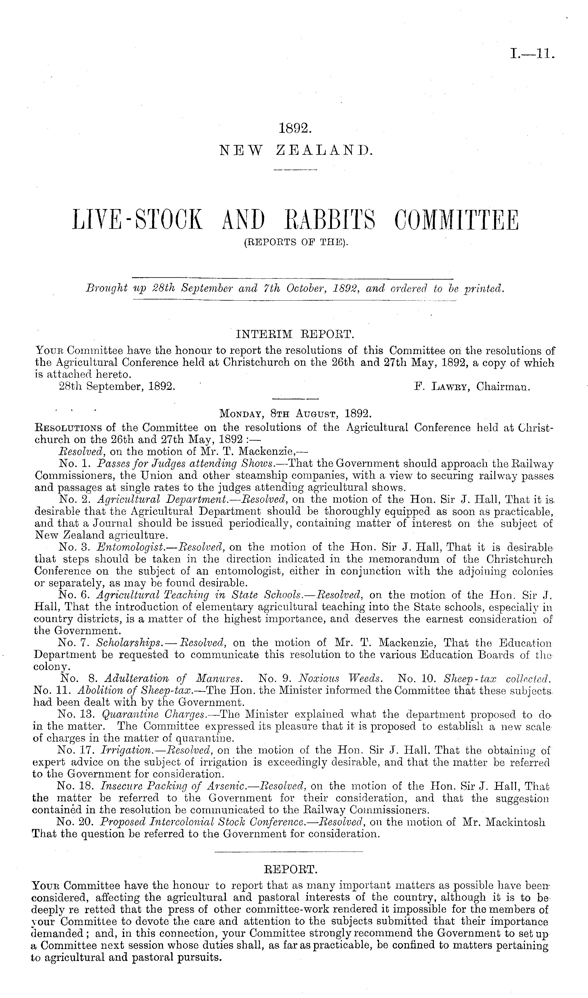 INTEBIM BEPOBT. Your Committee have the honour to report the resolutions of this Committee on the resolutions of the Agricultural Conference held at Christchureh on the 26th and 27th May, 1892, a copy of which is attached hereto. 28th September, 1892. F. Lawey, Chairman.