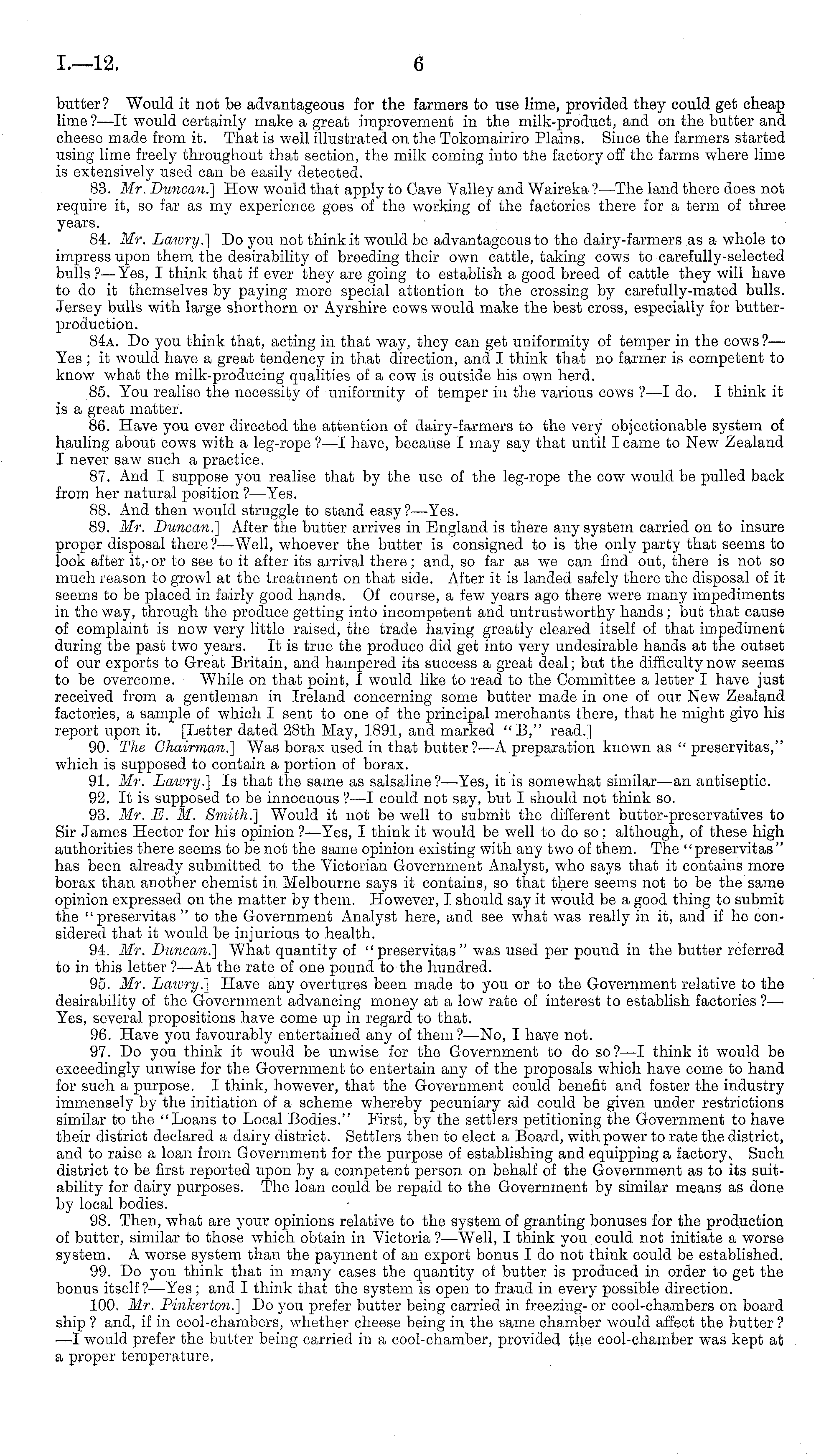 butter? Would it not be advantageous for the farmers to use lime, provided they could get cheap lime ?—lt would certainly make a great improvement in the milk-product, and on the butter and cheese made from it. That is well illustrated on the Tokomairiro Plains. Since the farmers started using lime freely throughout that section, the milk coming into the factory off the farms where lime is extensively used can be easily detected. 83. Mr. Duncan.] How would that apply to Cave Valley and Waireka ? —The land there does not require it, so far as my experience goes of the working of the factories there for a term of three years. 84. Air. Lawry.] Do you not think it would be advantageous to the dairy-farmers as a whole to impress upon them the desirability of breeding their own cattle, taking cows to carefully-selected bulls? —Yes, I think that if ever they are going to establish a good breed of cattle they will have to do it themselves by paying more special attention to the crossing by carefully-mated bulls. Jersey bulls with large shorthorn or Ayrshire cows would make the best cross, especially for butterproduction. 84a. Do you think that, acting in that way, they can get uniformity of temper in the cows ?— Yes ; it would have a great tendency in that direction, and I think that no farmer is competent to know what the milk-producing qualities of a cow is outside his own herd. 85. You realise the necessity of uniformity of temper in the various cows ? —I do. I think it is a great matter. 86. Have you ever directed the attention of dairy-farmers to the very objectionable system of hauling about cows with a leg-rope ?—I have, because I may say that until I came to New Zealand I never saw such a practice. 87. And I suppose you realise that by the use of the leg-rope the cow would be pulled back from her natural position ?—Yes. 88. And then would struggle to stand easy?— Yes. 89. Mr. Duncan.] After the butter arrives in England is there any system carried on to insure proper disposal there ?—Well, whoever the butter is consigned to is the only party that seems to look after it,-or to see to it after its arrival there; and, so far as we can find out, there is not so much reason to growl at the treatment on that side. After it is landed safely there the disposal of it seems to be placed in fairly good hands. Of course, a few years ago there were many impediments in the way, through the produce getting into incompetent and untrustworthy hands; but that cause of complaint is now very little raised, the trade having greatly cleared itself of that impediment during the past two years. It is true the produce did get into very undesirable hands at the outset of our exports to Great Britain, and hampered its success a great deal; but the difficulty now seems to be overcome. While on that point, I would like to read to the Committee a letter I have just received from a gentleman in Ireland concerning some butter made in one of our New Zealand factories, a sample of which I sent to one of the principal merchants there, that he might give his report upon it. [Letter dated 28th May, 1891, and marked "B," read.] 90. The Chairman.] Was borax used in that butter?—A preparation known as " preservitas," which is supposed to contain a portion of borax. 91. Mr. Lawry.] Is that the same as salsaline?—Yes, it is somewhat similar—an antiseptic. 92. It is supposed to be innocuous ?—I could not say, but I should not think so. 93. Mr. E. M. Smith.] Would it not be well to submit the different butter-preservatives to Sir James Hector for his opinion ?—Yes, I think it would be well to do so; although, of these high authorities there seems to be not the same opinion existing with any two of them. The "preservitas" has been already submitted to the Victorian Government Analyst, who says that it contains more borax than another chemist in Melbourne says it contains, so that there seems not to be the same opinion expressed on the matter by them. However, I should say it would be a good thing to submit the "preservitas " to the Government Analyst here, and see what was really in it, and if he considered that it would be injurious to health. 94. Mr. Duncan.] What quantity of "preservitas" was used per pound in the butter referred to in this letter ?—At the rate of one pound to the hundred. 95. Mr. Laivry.] Have any overtures been made to you or to the Government relative to the desirability of the Government advancing money at a low rate of interest to establish factories ?— Yes, several propositions have come up in regard to that. 96. Have you favourably entertained any of them?—No, I have not. 97. Do you think it would be unwise for the Government to do so? —I think it would be exceedingly unwise for the Government to entertain any of the proposals which have come to hand for such a purpose. I think, however, that the Government could benefit and foster the industry immensely by the initiation of a scheme whereby pecuniary aid could be given under restrictions similar to the "Loans to Local Bodies." First, by the settlers petitioning the Government to have their district declared a dairy district. Settlers then to elect a Board, with power to rate the district, and to raise a loan from Government for the purpose of establishing and equipping a factory.. Such district to be first reported upon by a competent person on behalf of the Government as to its suitability for dairy purposes. The loan could be repaid to the Government by similar means as done by local bodies. 98. Then, what are your opinions relative to the system of granting bonuses for the production of butter, similar to those which obtain in Victoria ? —Well, I think you could not initiate a worse system. A worse system than the payment of an export bonus Ido not think could be established. 99. Do you think that in many cases the quantity of butter is produced in order to get the bonus itself?— Yes; and I think that the system