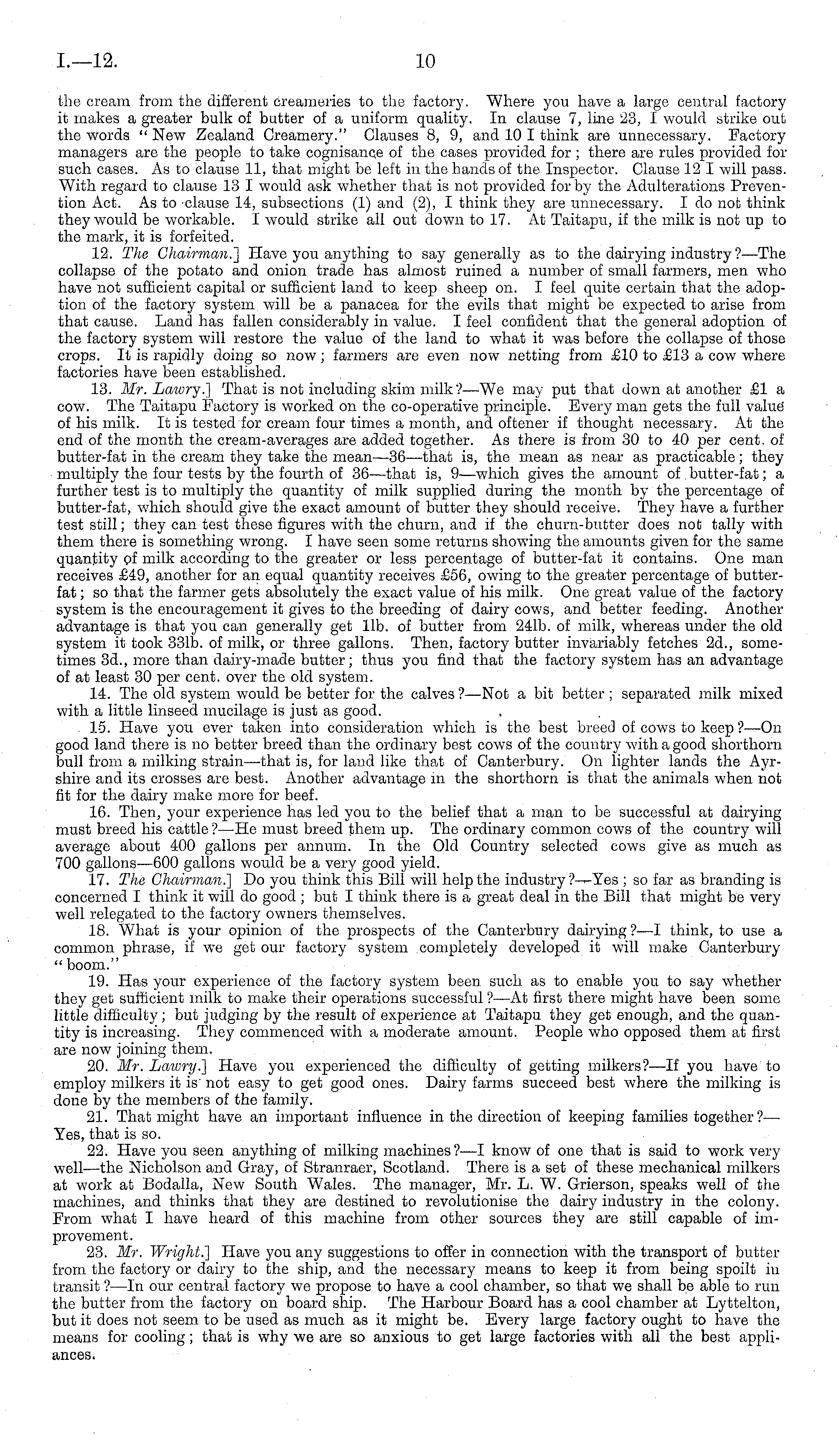 the cream from the different creameries to the factory. Where you have a large central factory it makes a greater bulk of butter of a uniform quality. In clause 7, line 23, I would strike out the words " New Zealand Creamery." Clauses 8, 9, and 10 I think are unnecessary. Factory managers are the people to take cognisance of the cases provided for ; there are rules provided for such cases. As to clause 11, that might be left in the hands of the Inspector. Clause 12 I -will pass. With regard to clause IS I would ask whether that is not provided for by the Adulterations Prevention Act. As to clause 14, subsections (1) and (2), I think they are unnecessary. Ido not think they would be workable. I would strike all out down to 17. At Taitapu, if the milk is not up to the mark, it is forfeited. 12. The Chairman.'] Have you anything to say generally as to the dairying industry ?—The collapse of the potato and onion trade has almost ruined a number of small farmers, men who have not sufficient capital or sufficient land to keep sheep on. I feel quite certain that the adoption of the factory system will be a panacea for the evils that might be expected to arise from that cause. Land has fallen considerably in value. I feel confident that the general adoption of the factory system will restore the value of the land to what it was before the collapse of those crops. It is rapidly doing so now; farmers are even now netting from £10 to £13 a cow where factories have been established. 13. Mr. Lawry.] That is not including skim milk ? —We may put that down at another £1 a cow. The Taitapu Factory is worked on the co-operative principle. Every man gets the full value' of his milk. It is tested for cream four times a month, and oftener if thought necessary. At the end of the month the cream-averages are added together. As there is from 30 to 40 per cent, of butter-fat in the cream they take the mean —36 —that is, the mean as near as practicable; they multiply the four tests by the fourth of 36 —that is, 9—which gives the amount of butter-fat; a further test is to multiply the quantity of milk supplied during the month by the percentage of butter-fat, which should give the exact amount of butter they should receive. They have a further test still; they can test these figures with the churn, and if the churn-butter does not tally with them there is something wrong. I have seen some returns showing the amounts given for the same quantity of milk according to the greater or less percentage of butter-fat it contains. One man receives £49, another for an equal quantity receives £56, owing to the greater percentage of butterfat ; so that the farmer gets absolutely the exact value of his milk. One great value of the factory system is the encouragement it gives to the breeding of dairy cows, and better feeding. Another advantage is that you can generally get lib. of butter from 241b. of milk, whereas under the old system it took 331b. of milk, or three gallons. Then, factory butter invariably fetches 2d., sometimes 3d., more than dairy-made butter; thus you find that the factory system has an advantage of at least 30 per cent, over the old system. 14. The old system would be better for the calves ?—Not a bit better ; separated milk mixed with a little linseed mucilage is just as good. . 15. Have you ever taken into consideration which is the best breed of cows to keep ?—On good land there is no better breed than the ordinary best cows of the country with a good shorthorn bull from a milking strain —that is, for land like that of Canterbury. On lighter lands the Ayrshire and its crosses are best. Another advantage in the shorthorn is that the animals when not fit for the dairy make more for beef. 16. Then, your experience has led you to the belief that a man to be successful at dairying must breed his cattle ? —He must breed them up. The ordinary common cows of the country will average about 400 gallons per annum. In the Old Country selected cows give as much as 700 gallons—6oo gallons would be a very good yield. 17. The Chairman.] Do you think this Bill will help the industry ?—Yea ; so far as branding is concerned I think it will do good ; but I think there is a great deal in the Bill that might be very well relegated to the factory owners themselves. 18. What is your opinion of the prospects of the Canterbury dairying ? —I think, to use a common phrase, if we get our factory system completely developed it will make Canterbury " boom." 19. Has your experience of the factory system been such as to enable you to say whether they get sufficient milk to make their operations successful ? —At first there might have been some little difficulty; but judging by the result of experience at Taitapu they get enough, and the quantity is increasing. They commenced with a moderate amount. People who opposed them at first are now joining them. 20. Mr. Lawry.] Have you experienced the difficulty of getting milkers?—lf you have to employ milkers it is' not easy to get good ones. Dairy farms succeed best where the milking is done by the members of the family. 21. That might have an important influence in the direction of keeping families together ?— Yes, that is so. 22. Have you seen anything of milking machines'? —I know of one that is said to work very well—the Nicholson and Gray, of Stranraer, Scotland. There is a set of these mechanical milkers at work at Bodalla, New South Wales. The manager, Mr. L. W. Grierson, speaks well of the machines, and thinks that they are destined to revolutionise the dairy industry in the colony. From what I have heard of this machine from other sources they are still capable of improvement. 23. Mr. Wright.] Have you any suggestions to offer in connection with the transport of butter from the factory or dairy to the ship, and the necessary means to keep it from being spoilt in transit ? —ln our central factory we propose to have a cool chamber, so that we