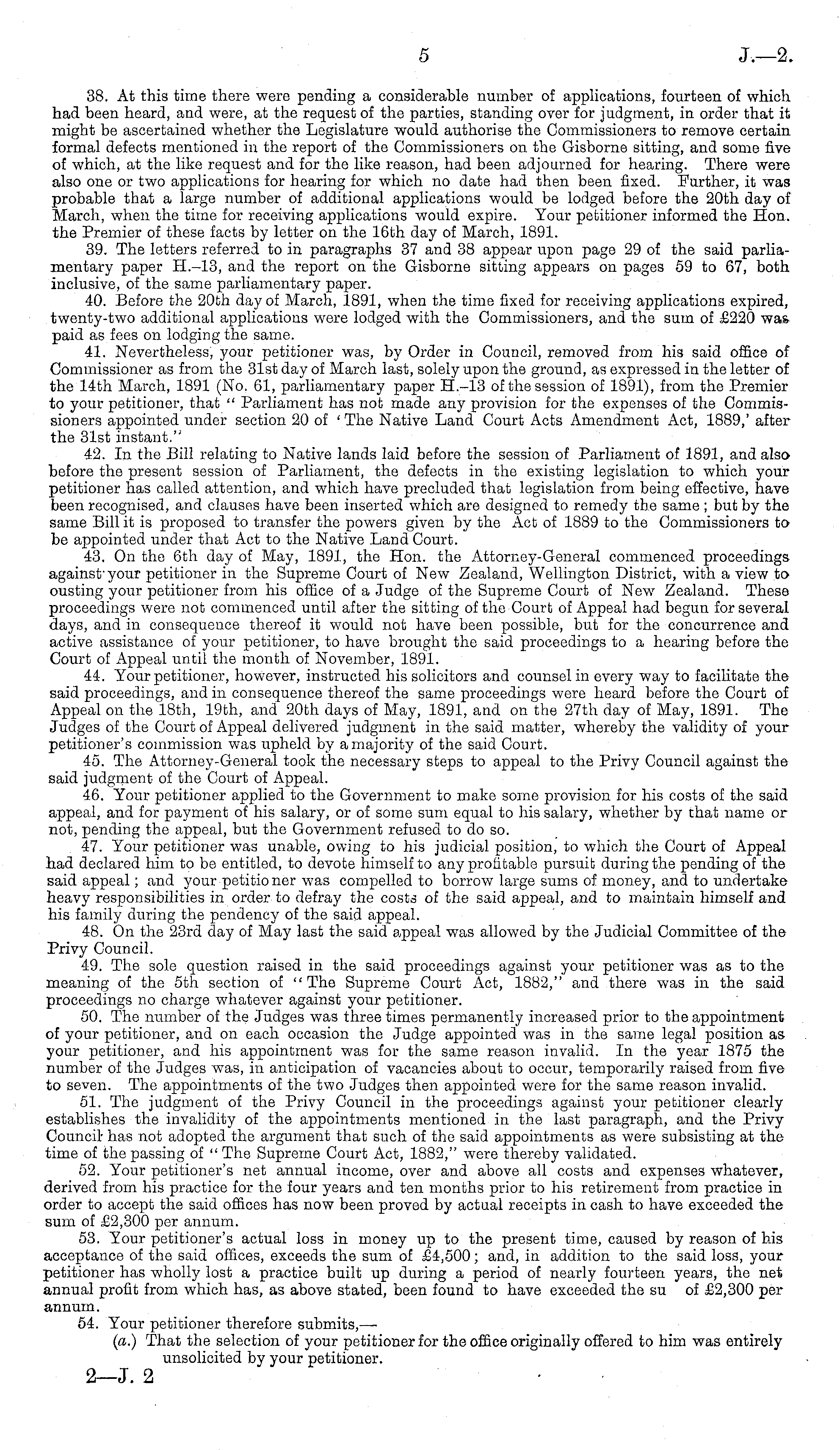 38. At this time there were pending a considerable number of applications, fourteen of which had been heard, and were, at the request of the parties, standing over for judgment, in order that it might be ascertained whether the Legislature would authorise the Commissioners to remove certain formal defects mentioned in the report of the Commissioners on the Gisborne sitting, and some five of which, at the like request and for the like reason, had been adjourned for hearing. There were also one or two applications for hearing for which no date had then been fixed. Further, it was probable that a large number of additional applications would be lodged before the 20th day of March, when the time for receiving applications would expire. Your petitioner informed the Hon. the Premier of these facts by letter on the 16th day of March, 1891. 39. The letters referred to in paragraphs 37 and 38 appear upon page 29 of the said parliamentary paper H.-13, and the report on the Gisborne sitting appears on pages 59 to 67, both inclusive, of the same parliamentary paper. 40. Before the 20th day of March, 1891, when the time fixed for receiving applications expired, twenty-two additional applications were lodged with the Commissioners, and the sum of £220 was paid as fees on lodging the same. 41. Nevertheless, your petitioner was, by Order in Council, removed from his said office of Commissioner as from the 31st day of March last, solely upon the ground, as expressed in the letter of the 14th March, 1891 (No. 61, parliamentary paper H.-13 of the session of 1891), from the Premier to your petitioner, that " Parliament has not made any provision for the expenses of the Commissioners appointed under section 20 of ' The Native Land Court Acts Amendment Act, 1889,' after the 31st instant." 42. In the Bill relating to Native lands laid before the session of Parliament of 1891, and also before the present session of Parliament, the defects in the existing legislation to which your petitioner has called attention, and which have precluded that legislation from being effective, have been recognised, and clauses have been inserted which are designed to remedy the same ; but by the same Bill it is proposed to transfer the powers given by the Act of 1889 to the Commissioners to be appointed under that Act to the Native Land Court. 43. On the 6th day of May, 1891, the Hon. the Attorney-General commenced proceedings against , your petitioner in the Supreme Court of New Zealand, Wellington District, with a view to ousting your petitioner from his office of a Judge of the Supreme Court of New Zealand. These proceedings were not commenced until after the sitting of the Court of Appeal had begun for several days, and in consequence thereof it would not have been possible, but for the concurrence and active assistance of your petitioner, to have brought the said proceedings to a hearing before the Court of Appeal until the month of November, 1891. 44-. Your petitioner, however, instructed his solicitors and counsel in every way to facilitate the said proceedings, and in consequence thereof the same proceedings were heard before the Court of Appeal on the 18th, 19th, and 20th days of May, 1891, and on the 27th day of May, 1891. The Judges of the Court of Appeal delivered judgment in the said matter, whereby the validity of your petitioner's commission was upheld by a majority of the said Court. 45. The Attorney-General took the necessary steps to appeal to the Privy Council against the said judgment of the Court of Appeal. 46. Your petitioner applied to the Government to make some provision for his costs of the said appeal, and for payment of his salary, or of some sum equal to his salary, whether by that name or not, pending the appeal, but the Government refused to do so. 47. Your petitioner was unable, owing to his judicial position, to which the Court of Appeal had declared him to be entitled, to devote himself to any profitable pursuit during the pending of the said appeal; and your petitioner was compelled to borrow large sums of money, and to undertake heavy responsibilities in order to defray the costs of the said appeal, and to maintain himself and his family during the pendency of the said appeal. 48. On the 23rd day of May last the said appeal was allowed by the Judicial Committee of the Privy Council. 49. The sole question raised in the said proceedings against your petitioner was as to the meaning of the sth section of " The Supreme Court Act, 1882," and there was in the said proceedings no charge whatever against your petitioner. 50. The number of the Judges was three times permanently increased prior to the appointment of your petitioner, and on each occasion the Judge appointed was in the same legal position as your petitioner, and his appointment was for the same reason invalid. In the year 1875 the number of the Judges was, in anticipation of vacancies about to occur, temporarily raised from five to seven. The appointments of the two Judges then appointed were for the same reason invalid. 51. The judgment of the Privy Council in the proceedings against your petitioner clearly establishes the invalidity of the appointments mentioned in the last paragraph, and the Privy Council' has not adopted the argument that such of the said appointments as were subsisting at the time of the passing of "The Supreme Court Act, 1882," were thereby validated. 52. Your petitioner's net annual income, over and above all costs and expenses whatever, derived from his practice for the four years and ten months prior to his retirement from practice in order to accept the said offices has now been proved by actual receipts in cash to have exceeded the sum of £2,300 per annum. 53. Your petitioner's actual loss in money up to the present time, caused by reason of his acceptance of the said offices, exceeds the sum of £4,500; and, in addition to the said loss, your petitioner has wholly lost a practice built up during a period of n