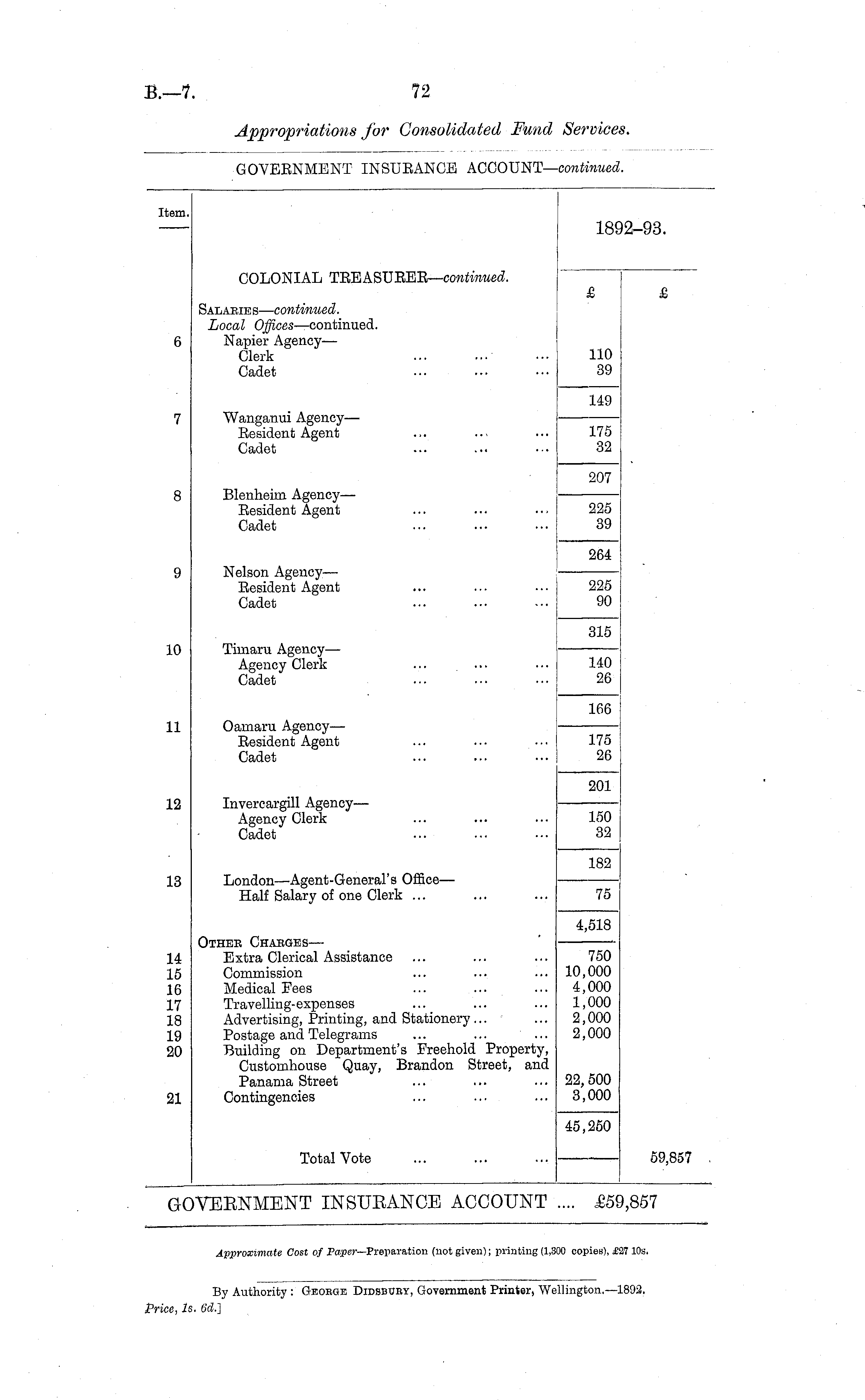 Item. 18' '2-93. COLONIAL TEEASUEEE— continued. Salaeies— continued. Local Offices —continued. Napier Agency— Clerk Cadet £ 110 39 £ Wanganui Agency — Eesident Agent Cadet 149 7 175 32 207 Blenheim Agency— Eesident Agent Cadet 225 39 Nelson Agency— Eesident Agent Cadet 264 225 90 Tiniaru Agency — Agency Clerk Cadet 315 10 140 26 Oamaru Agency— Eesident Agent Cadet 166 11 175 26 Invercargill Agency— Agency Clerk Cadet 201 12 150 32 London—Agent-General's Office— Half Salary of one Clerk ... 182 13 75 Other Chakges— Extra Clerical Assistance Commission Medical Fees Travelling-expenses Advertising, Printing, and Stationery... Postage and Telegrams Building on Department's Freehold Property, Customhouse Quay, Brandon Street, and Panama Street Contingencies 4,518 14 15 16 17 18 19 20 750 10,000 4,000 1,000 2,000 2,000 21 22,500 3,000 Total Vote 45,250 59,857 iVEENMENT INSUEANGB ACCOUNT .... £5'',857