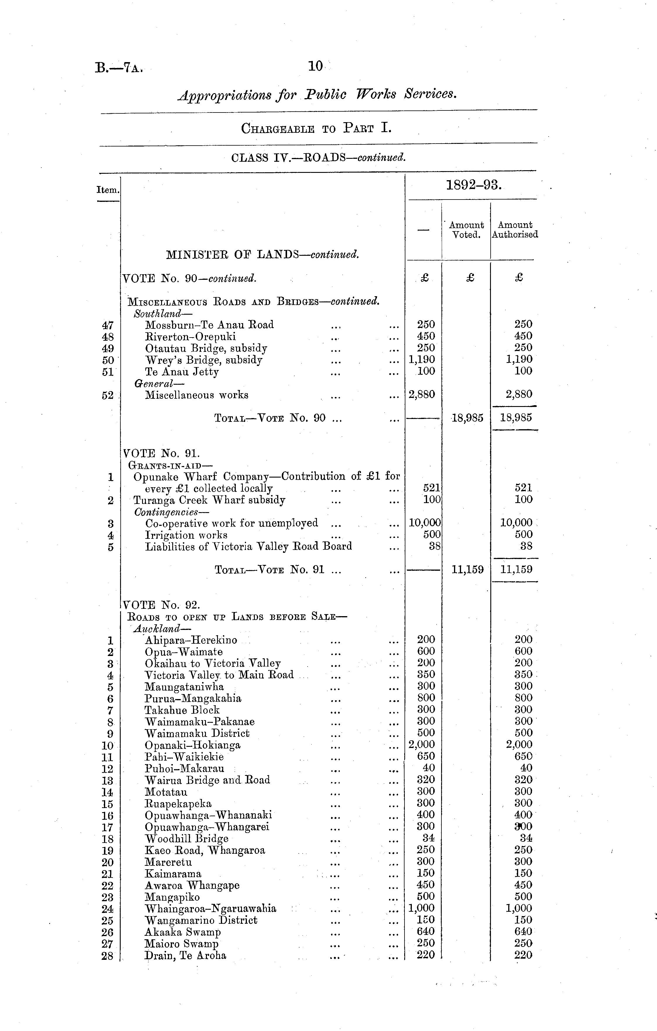 1892-93. .tern. Amount Voted. Amount Authorised MINISTER OF LAUDS—continued. VOTE No. 90— continued. £ £ £ 47 48 49 50 51 Miscellaneous Eoads and Beidges— continued. Southland — Mossburn-Te Anau Boad Eiverton-Orepuki Otautau Bridge, subsidy Wrey's Bridge, subsidy Te Anau Jetty General — Miscellaneous works ... 250 450 250 1,190 100 250 450 250 1,190 100 52 2,880 2,880 Totai,—Vote No. 90 ... 18,985 18,985 1 2 VOTE No. 91. GrRANTS-IN-AID — Opunake Wharf Company —Contribution of £1 for every £1 collected locally Turanga Creek Wharf subsidy Contingencies — Co-operative work for unemployed ... Irrigation works Liabilities of Victoria Valley Eoad Board 521 100 521 100 3 4 5 10,000 500 38 10,000 500 38 Total —Vote No. 91 ... 11,159 11,159 1 2 3 4 5 6 7 8 9 10 11 12 13 14 15 16 17 18 19 20 21 22 23 24 25 26 27 28 VOTE No. 92. Eoads to open up Lands befoee Sale — Auckland — Ahipara-IIerekino Opua-Waimate ... Okaihau to Victoria Valley Victoria Valley to Main Eoad , Maungataniwha Purua-Mangakahia Takahue Block Waimamaku-Pakanae Waimamaku District Opanaki-Hokianga Pahi-Waikiekie Puhoi—Makarau Wairua Bridge and Eoad Motatau Euapekapeka Opuawhanga-Whananaki Opuawhanga-Whangarei Woodhill Bridge Kaeo Eoad, Whangaroa Mareretu Kaimarama , ... Awaroa Whangape Mangapiko Whaingaroa-Ngaruawahia Wangamarino District Akaaka Swamp Maioro Swamp Drain, Te Aroha ... ... 200 600 200 350 300 800 300 300 500 2,000 650 40 320 300 300 400 300 34 250 300 150 450 500 1,000 1C0 640 250 220 200 600 200 350 300 800 300 S00 500 2,000 650 40 320 300 300 400 900 34 250 300 150 450 500 1,000 150 640 250 220