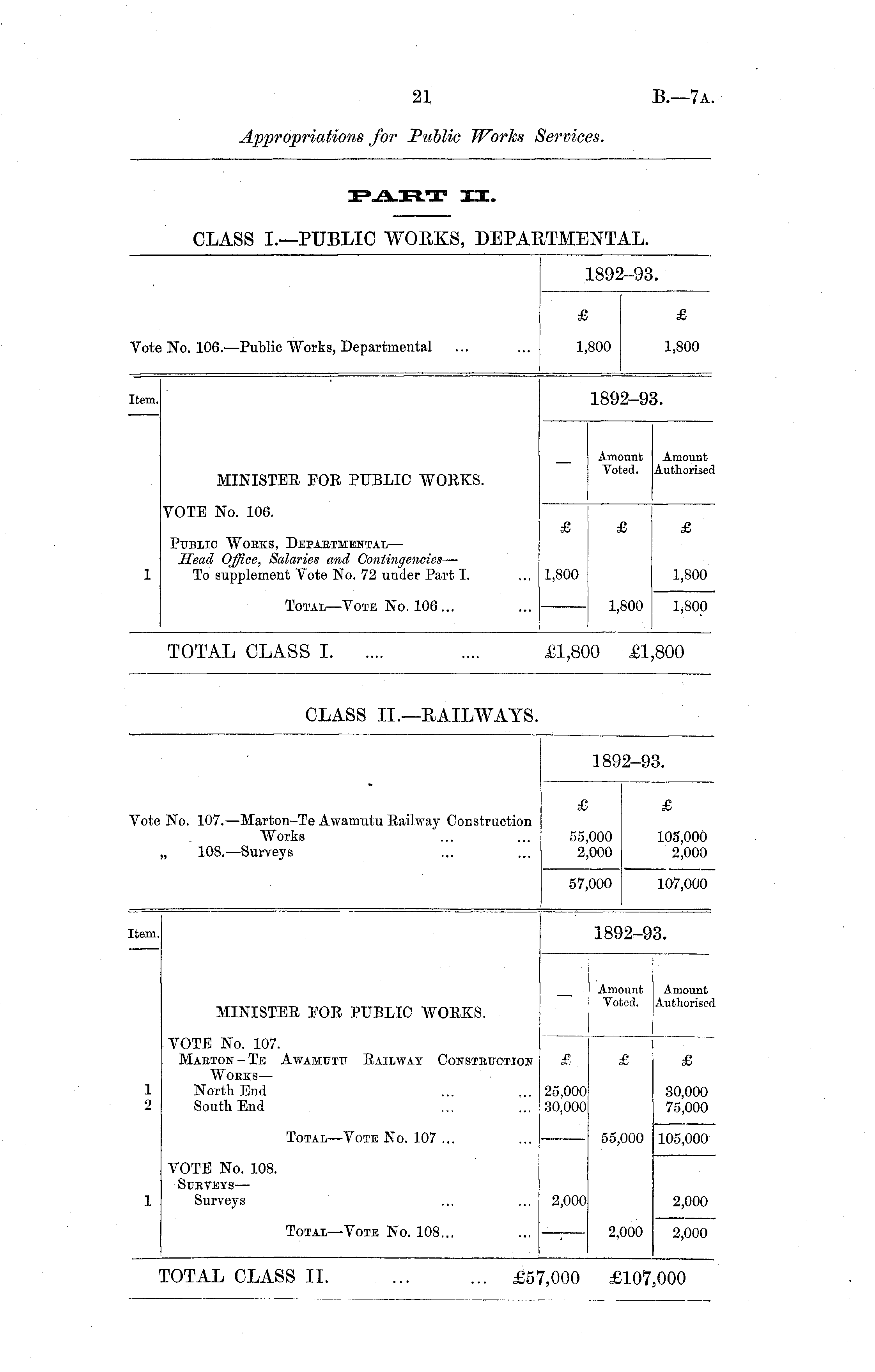 1892-93. 3 No. 106. —Public Works, Departmental £ 1,800 £ 1,800 'oti 'tem. 1892-9: MINISTER FOR PUBLIC WORKS. Amount Voted. Amount Authorised VOTE No. 106. Public Woeks, Depaetmental— Head Office, Salaries and Contingencies — To supplement Vote No. 72 under Part I. £ £ 1,800 1,800 Total—Vote No. 106... 1,800 1,800 TOTAL CLASS I. £1,& >0 £1 ,800 CLASS II.—RAILWAYS. 1892-93. ote No. 107. —Marton-Te Awamutu Railway Construction Works £ 55,000 2,000 £ 105,000 2,000 „ 108.—Surveys 57,000 107,000 :tem. 18' 12-9, Amount Toted. Amount Authorisei MINISTER FOR PUBLIC WORKS. VOTE No. 107. MaETON-Te AwAMTTTtT RAILWAY CONSTRUCTION WOBKS— North End South End Si £ 1 2 25,000 30,000 30,000 75,000 Total—Vote No. 107 ... 55,000 105,000 VOTE No. 108. Stjetets—■ Surveys 2,000 2,000 Total—Vote No. 108... 2,000 2,000 'OTAL CLASS II. £57,000 £107 000