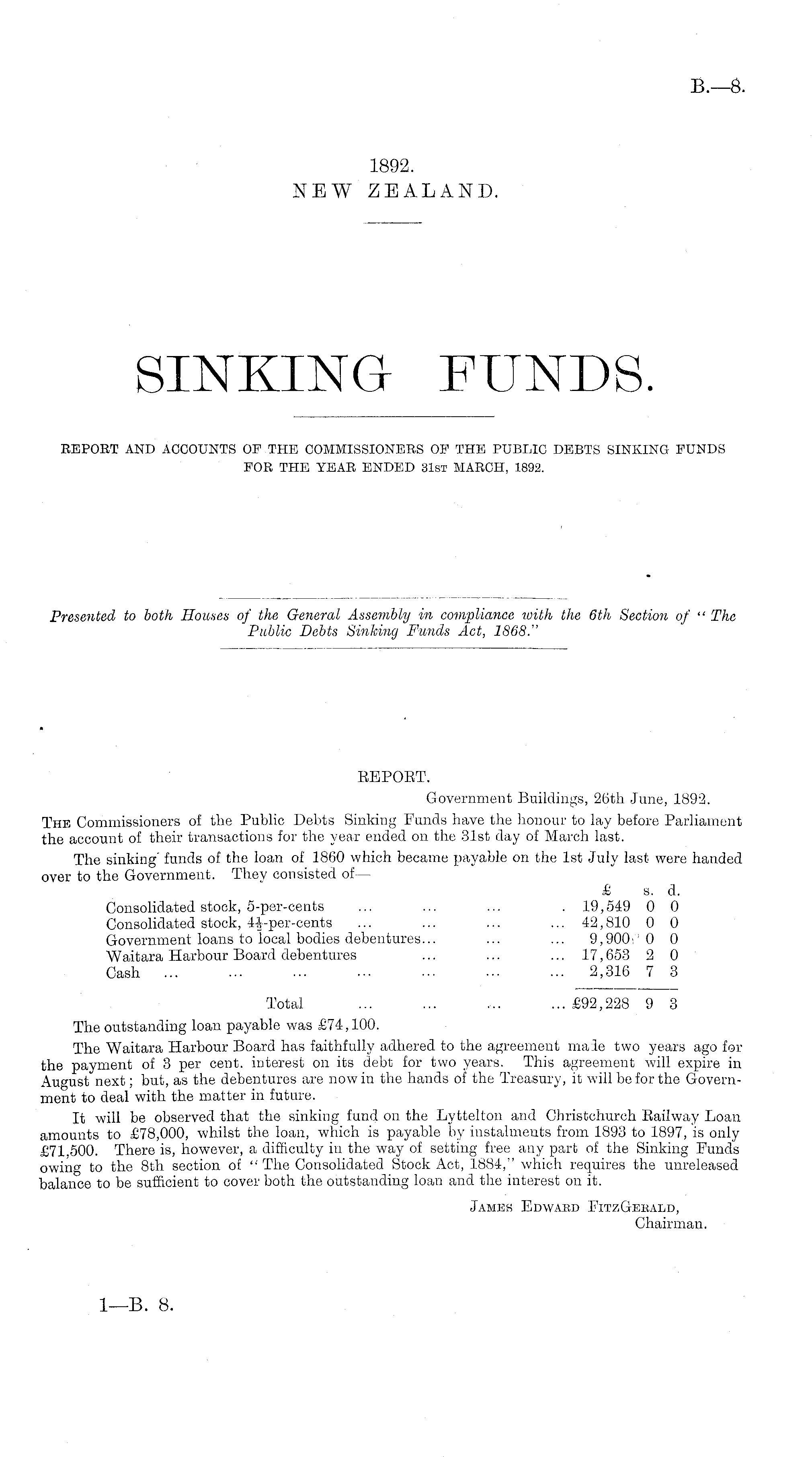 BEPOET. Government Buildings, 26th June, 1892. The Commissioners of the Public Debts Sinking Funds have the honour to lay before Parliament the account of their transactions for the year ended on the 31st clay of March last. The sinking' funds of the loan of 1860 which became payable on the Ist July last were handed over to the Government. They consisted of — £ s. d. Consolidated stock, 5-per-cents ... ... ... . 19,549 0 0 Consolidated stock, 4|-per-cents ... ... ... ... 42,810 0 0 Government loans to local bodies debentures... ... ... 9,900 0 0 Waitara Harbour Board debentures ... ... ... 17,653 2 0 Cash 2,316 7 3 Total. ... ... ... ... £92,228 9 3 The outstanding loan payable was £74,100. The Waitara Harbour Board has faithfully adhered to the agreement male two years ago for the payment of 3 per cent, interest on its debt for two years. This agreement will expire in August next; but, as the debentures are now in the hands of the Treasury, it will be for the Government to deal with the matter in future. It will be observed that the sinking fund on the Lyttelton and Christchurch Bailway Loan amounts to £78,000, whilst the loan, which is payable by instalments from 1893 to 1897, is only £71,500. There is, however, a difficulty in the way of setting free any part of the Sinking Funds owing to the Bth section of "The Consolidated Stock Act, 1884," which requires the unreleased balance to be sufficient to cover both the outstanding loan and the interest on it. James Edwaed FitzGekald, Chairman.