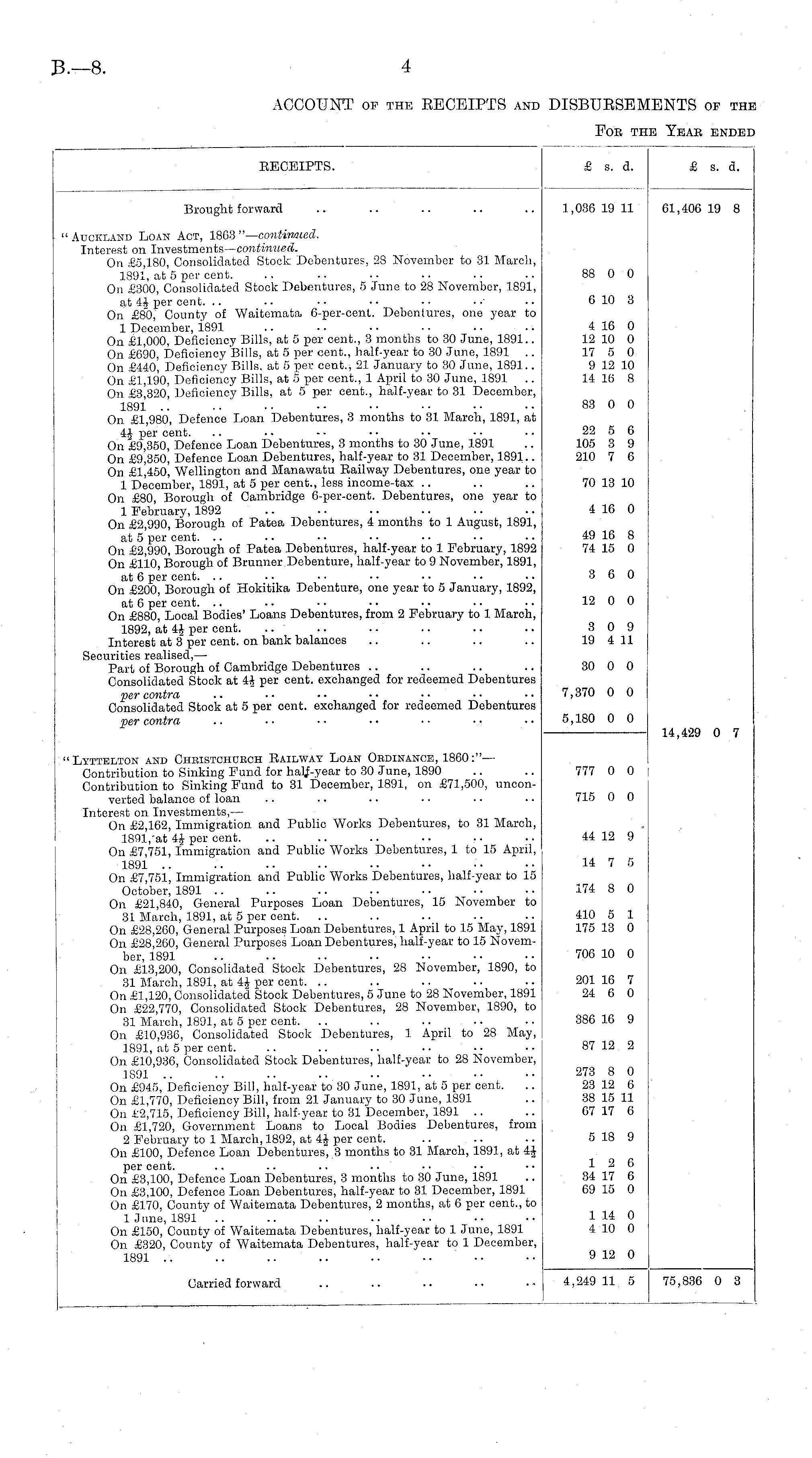 RECEIPTS. £ s. d. £ s. d. Brought forward 1,036 19 11 61,406 19 8 .uckland Loan Act, 1863 "— confirmed. Interest on Investments— continued. On £5,180, Consolidated Stock Debentures, 28 November to 31 March, 1891, at 5 per cent. On £300, Consolidated Stock Debentures, 5 June to 28 November, 1891, at 4J per cent. On £80, County of Waitemata 6-per-cent. Debentures, one year to 1 December, 1891 On £1,000, Deficiency Bills, at 5 per cent., 3 months to 30 June, 1891.. On £690, Deficiency Bills, at 5 per cent., half-year to 30 June, 1891 On £440, Deficiency Bills, at 5 per cent., 21 January to 30 June, 1891.. On £1,190, Deficiency Bills, at 5 per cent., 1 April to 30 June, 1891 On £3,320, Deficiency Bills, at 5 per cent., half-year to 31 December, 1891 .. On £1,980, Defence Loan Debentures, 3 months to 31 March, 1891, at 4J per cent. On £9,350, Defence Loan Debentures, 3 months to 30 June, 1891 On £9,350, Defence Loan Debentures, half-year to 31 December, 1891.. On £1,450, Wellington and Manawatu Railway Debentures, one year to 1 December, 1891, at 5 per cent., less income-tax On £80, Borough of Cambriago 6-per-cent. Debentures, one year to 1 February, 1892 On £2,990, Borough of Patea Debentures, 4 months to 1 August, 1891, at 5 per cent. On £2,990, Borough of Patea Debentures, half-year to 1 February, 1892 On £110, Borough of Brunner Debenture, half-year to 9 November, 1891, at 6 per cent. On £200, Borough of Hokitika Debenture, one year to 5 January, 1892, at 6 per cent. On £880, Local Boaies' Loans Debentures, from 2 February to 1 March, 1892, at 4J per cent. Interest at 3 per cent, on bank balances Securities realisea, — Part of Borough of Cambriage Debentures .. Consoliaatea Stock at 4J per cent, exchanged for redeemed Debentures per contra Consolidated Stock at 5 per cent, exchanged for reaeemea Debentures per contra 88 0 0 6 10 3 4 16 0 12 10 0 17 5 0 9 12 10 14 16 8 83 0 0 22 5 6 105 3 9 210 7 6 70 13 10 4 16 0 49 16 8 74 15 0 3 6 0 12 0 0 3 0 9 19 4 11 30 0 0 7,370 0 0 5,180 0 0 jYttelton and Chbistchubch Railway Loan Obdinance, I860:" — Contribution to Sinking Funa for half-year to 30 June, 1890 Contribution to Sinking Fund to 31 December, 1891, on £71,500, unconverted balance of loan Interest on Investments, — On £2,162, Immigration and Public Works Debentures, to 31 March, 1891,'at 4J per cent. On £7,751, Immigration and Public Works Debentures, 1 to 15 April, 1891 .. On £7,751, Immigration and Public Works Debentures, half-year to 15 October, 1891 On £21,840, General Purposes Loan Debentures, 15 November to 31 March, 1891, at 5 per cent. On £28,260, General Purposes Loan Debentures, 1 April to 15 May, 1891 On £28,260, General Purposes Loan Debentures, half-year to 15 November, 1891 On £13,200, Consolidated Stock Debentures, 28 November, 1890, to 31 March, 1891, at 4J per cent. On £1,120, Consolidated Stock Debentures, 5 June to 28 November, 1891 On £22,770, Consolidated Stock Debentures, 28 November, 1890, to 31 March, 1891, at 5 per cent. On £10,936, Consolidated Stock Debentures, 1 April to 28 May, 1891, at 5 per cent. On £10,936, Consolidated Stock Debentures, half-year to 28 November, 1S91 .. On £945, Deficiency Bill, half-year to 30 June, 1891, at 5 per cent. On £1,770, Deficiency Bill, from 21 January to 30 June, 1891 On £2,715, Deficiency Bill, half-year to 31 December, 1891 .. On £1,720, Government Loans to Local Bodies Debentures, from 2 February to 1 March, 1892, at 4J per cent. On £100, Defence Loan Debentures, 3 months to 31 March, 1891, at 4J per cent. .. .. .. On £3,100, Defence Loan Debentures, 3 months to 30 June, 1891 On £3,100, Defence Loan Debentures, half-year to 31 December, 1891 On £170, County of Waitemata Debentures, 2 months, at 6 per cent., to 1 June, 1891 .. On £150, County of Waitemata Debentures, half-year to 1 June, 1891 On £320, County of Waitemata Debentures, half-year to 1 December, 1891 .. 14,429 0 7 777 0 0 715 0 0 44 12 9 14 7 5 174 8 0 410 5 1 175 13 0 706 10 0 201 16 7 24 6 0 386 16 9 87 12 2 273 8 0 23 12 6 38 15 11 67 17 6 5 18 9 12 6 34 17 6 69 15 0 1 14 0 4 10 0 9 12 0 Carried forward 4,249 11 5 75,836 0 3