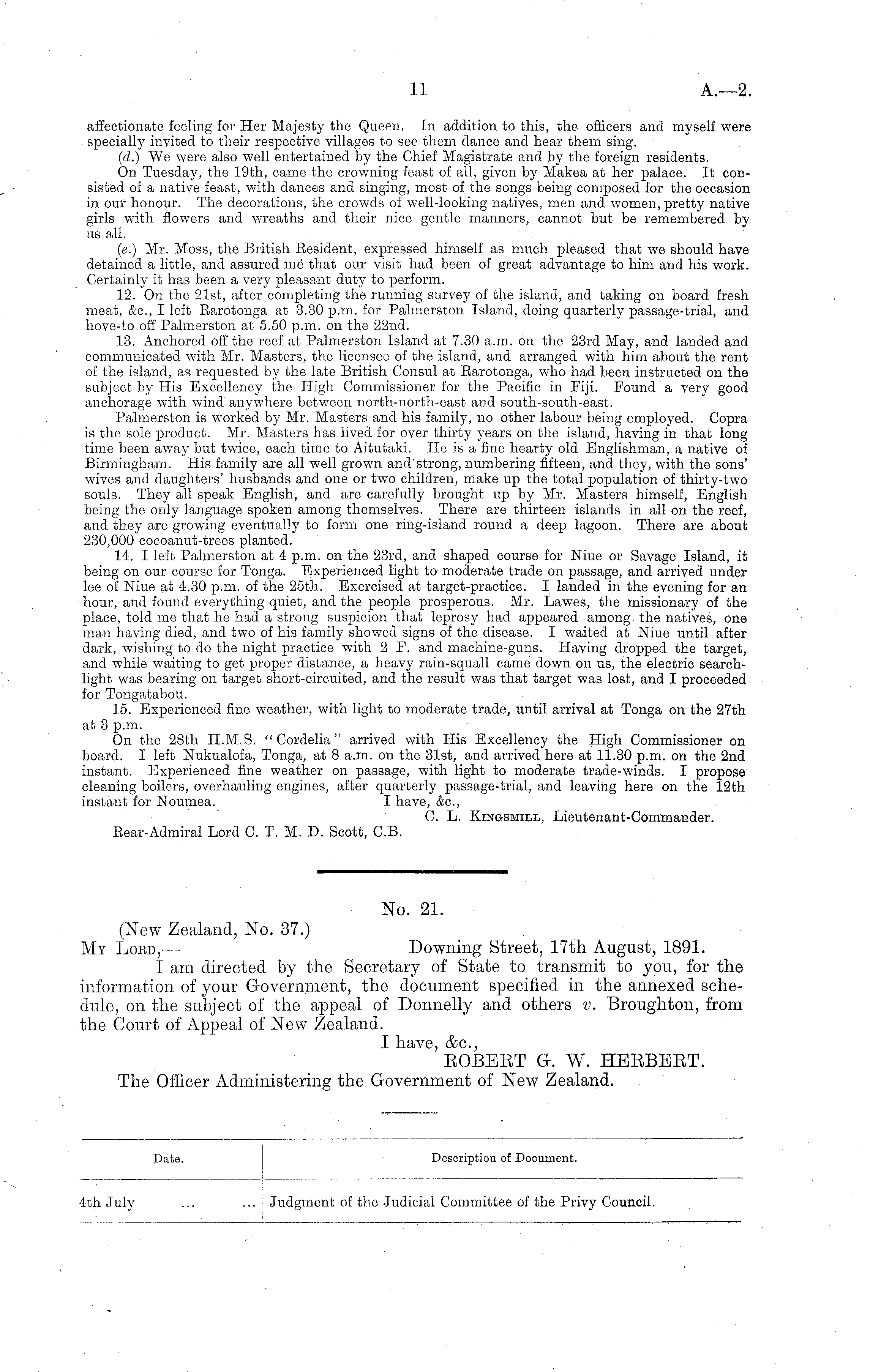 affectionate feeling for Her Majesty the Queen. In addition to this, the officers and myself were specially invited to their respective villages to see them dance and hear them sing. (d.) We were also well entertained by the Chief Magistrate and by the foreign residents. On Tuesday, the 19th, came the crowning feast of all, given by Makea at her palace. It consisted of a native feast, with dances and singing, most of the songs being composed for the occasion in our honour. The decorations, the crowds of well-looking natives, men and women, pretty native girls with flowers and wreaths and their nice gentle manners, cannot but be remembered by us all. (<?..) Mr. Moss, the British Eesident, expressed himself as much pleased that we should have detained a little, and assured me that our visit had been of great advantage to him and his work. Certainly it has been a very pleasant duty to perform. 12. On the 21st, after completing the running survey of the island, and taking on board fresh meat, &c, I left Earotonga at 3.30 p.m. for Palmerston Island, doing quarterly passage-trial, and hove-to off Palmerston at 5.50 p.m. on the 22nd. 13. Anchored off the reef at Palmerston Island at 7.30 a.m. on the 23rd May, and landed and communicated with Mr. Masters, the licensee of the island, and arranged with him about the rent of the island, as requested by the late British Consul at Earotonga, who had been instructed on the subject by His Excellency the High Commissioner for the Pacific in Fiji. Found a very good anchorage with wind anywhere between north-north-east and south-south-east. Palmerston is worked by Mr. Masters and his family, no other labour being employed. Copra is the sole product. Mr. Masters has lived for over thirty years on the island, having in that long time been away but twice, each time to Aitutaki. He is a fine hearty old Englishman, a native of Birmingham. His family are all well grown and'strong, numbering fifteen, and they, with the sons' wives and daughters' husbands and one or two children, make up the total population of thirty-two souls. They all speak English, and are carefully brought up by Mr. Masters himself, English being the only language spoken, among themselves. There are thirteen islands in all on the reef, and they are growing eventually to form one ring-island round a deep lagoon. There are about 230,000 cocoanut-trees planted. 14. I left Palmerston at 4 p.m. on the 23rd, and shaped course for Niue or Savage Island, it being on our course for Tonga. Experienced light to moderate trade on passage, and arrived under lee of Niue at 4.30 p.m. of the 25th. Exercised at target-practice. I landed in the evening for an hour, and found everything quiet, and the people prosperous. Mr. Lawes, the missionary of the place, told me that he had a strong suspicion that leprosy had appeared among the natives, one man having died, and two of his family showed signs of the disease. I waited at Niue until after dark, wishing to do the night practice with 2 F. and machine-guns. Having dropped the target, and while waiting to get proper distance, a heavy rain-squall came down on us, the electric searchlight was bearing on target short-circuited, and the result was that target was lost, and I proceeded for Tongatabou. 15. Experienced fine weather, with light to moderate trade, until arrival at Tonga on the 27th at 3 p.m. On the 28th H.M.S. "Cordelia" arrived with His Excellency the High Commissioner on board. I left Nukualofa, Tonga, at 8 a.m. on the 31st, and arrived here at 11.30 p.m. on the 2nd instant. Experienced fine weather on passage, with light to moderate trade-winds. I propose cleaning boilers, overhauling engines, after quarterly passage-trial, and leaving here on the 12th instant for Noumea. I have, &c, C. L. Kingsmill, Lieutenant-Commander. Bear-Admiral Lord C. T. M. D. Scott, C.B.