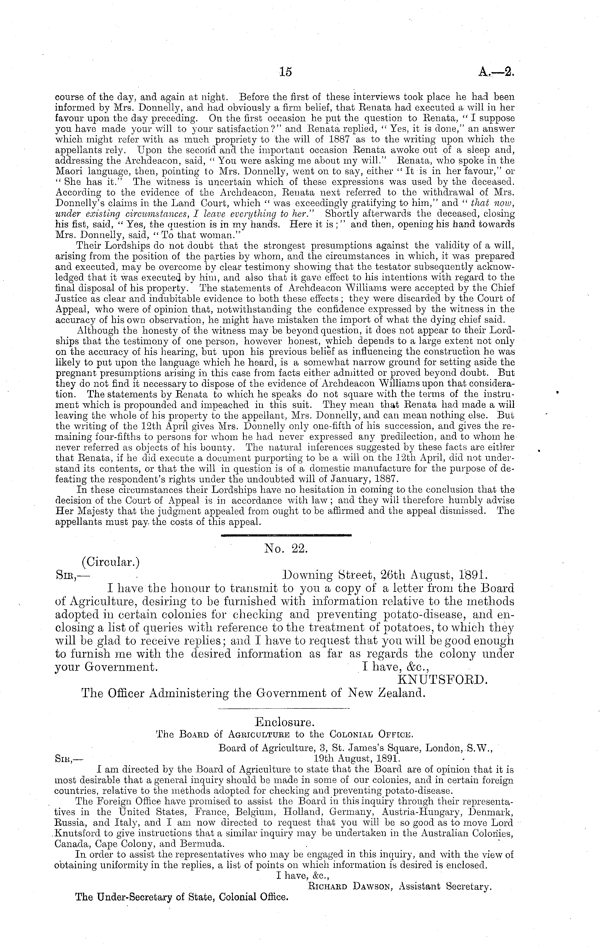No. 22. (Circular.) Sir, — - Downing Street, 26th August, 1891. I have the honour to transmit to you a copy of a letter from the Board of Agriculture, desiring to be furnished with information relative to the methods adopted in certain colonies for checking and preventing potato-disease, and enclosing a list of queries with reference to the treatment of potatoes, to which they will be glad to receive replies; and I have to request that you will be good enough to furnish me with the desired information as far as regards the colony under your Government. I have, &c, KNUTSFOED. The Officer Administering the Government of New Zealand.